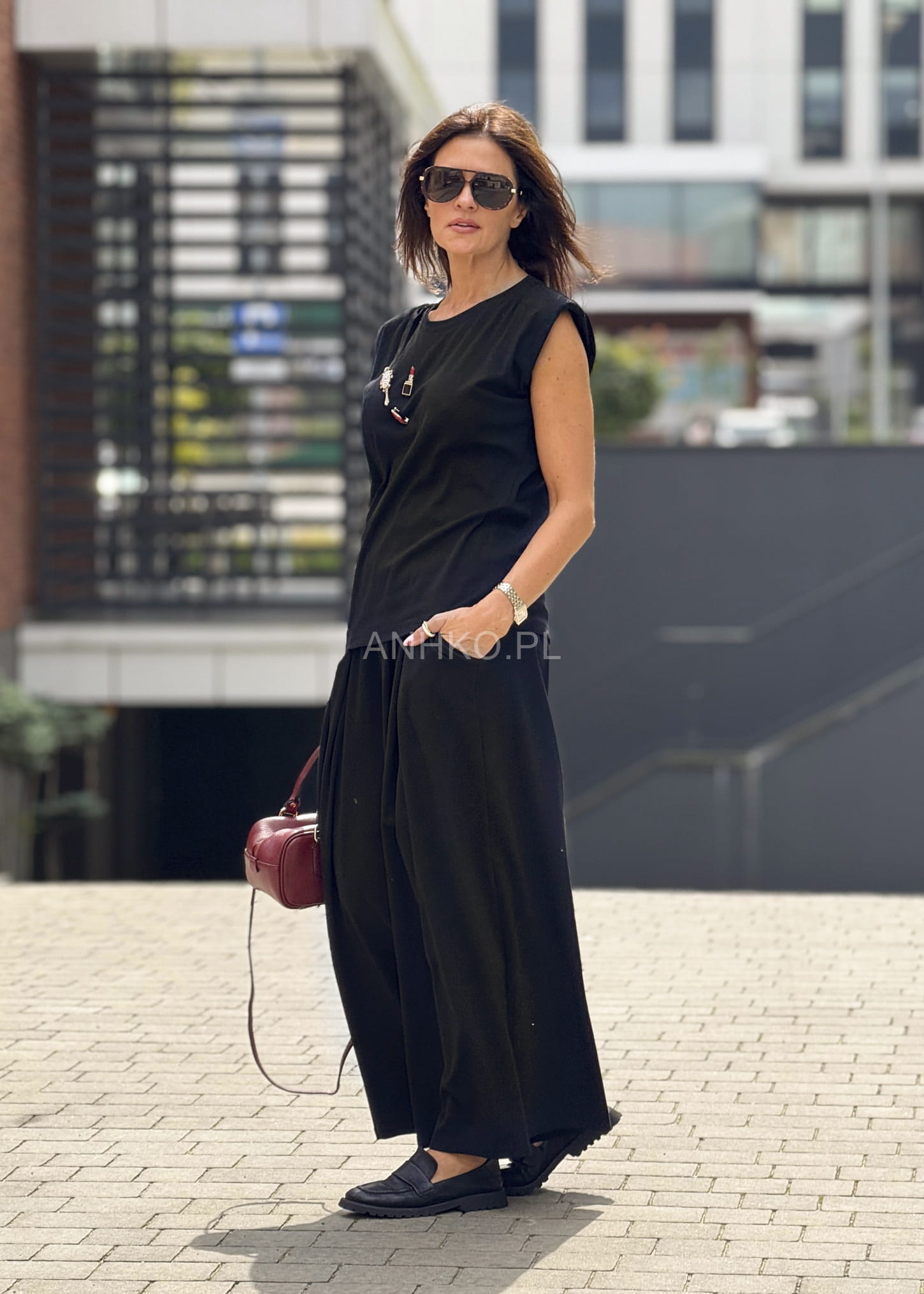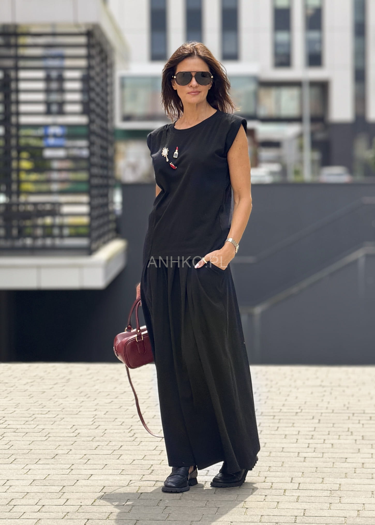 To nowoczesna bluzka, która przyciąga uwagę swoim oryginalnym krojem. Asymetryczny bok nadaje jej dynamicznego charakteru, a poduszki na ramionach subtelnie podkreślają linię sylwetki. Wykonana w 100% z naturalnej bawełny, jest miękka, przewiewna i wygodna w noszeniu. Klasyczna czerń sprawia, że bluzka staje się bazą wielu stylizacji – od casualowych z jeansami i trampkami, po bardziej eleganckie zestawy z cygaretkami i botkami. To model, który sprawdzi się na co dzień, do pracy, jak i na wieczorne wyjścia, wnosząc do garderoby nutę nowoczesnej elegancji.