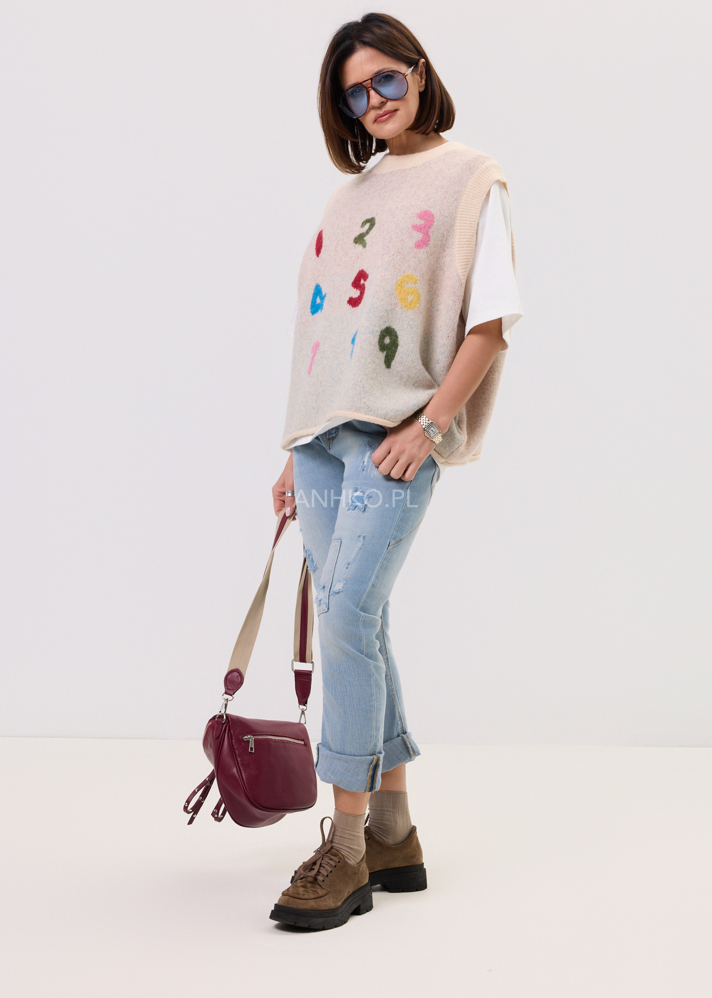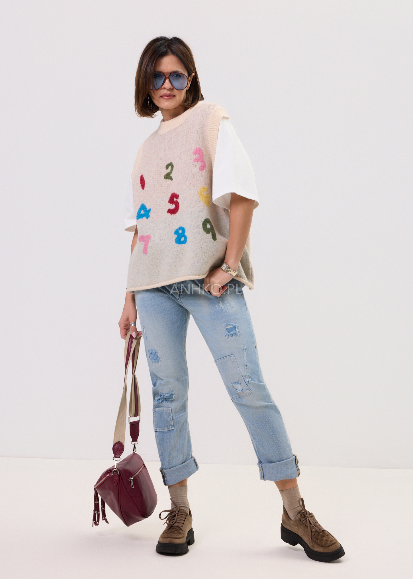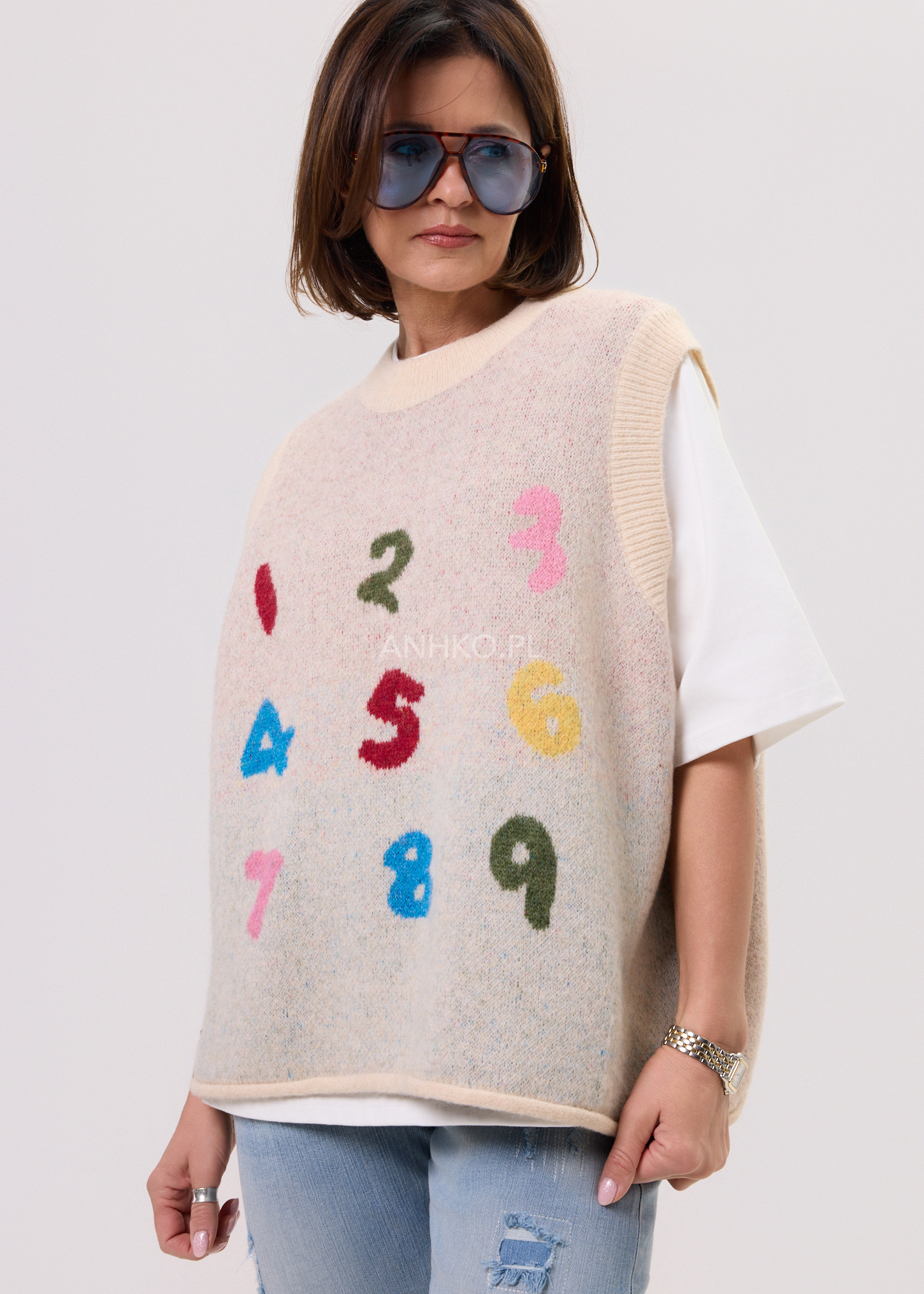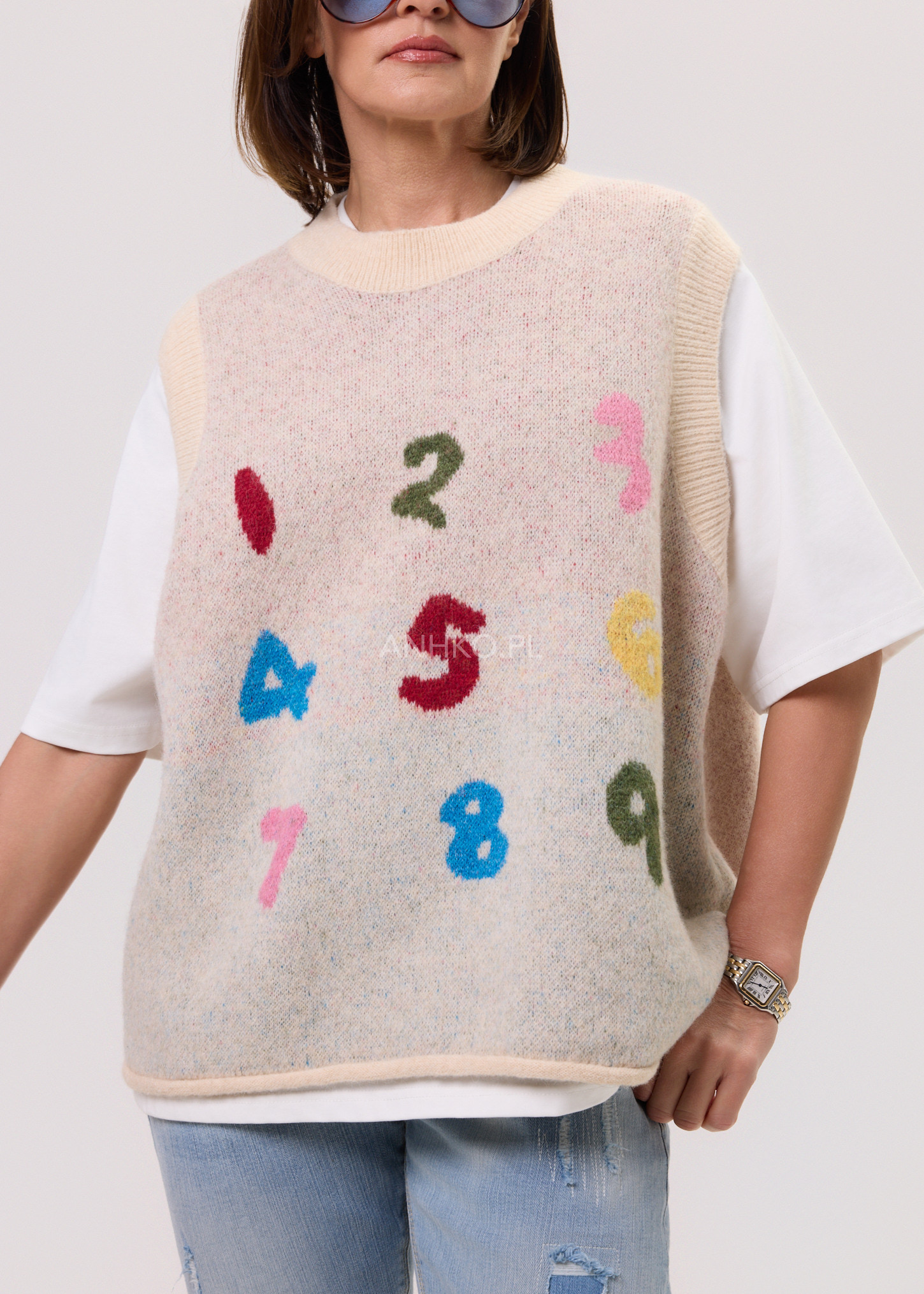 Ten bezrękawnik dzianinowy w kremowym melanżu przyciąga uwagę oryginalnym motywem wielobarwnych cyfr. Luźny fason miękko układa się na sylwetce, a delikatnie opadająca linia ramion nadaje mu swobodnego, nowoczesnego charakteru. Kontrastowy ściągacz przy dekolcie i wykończeniach podkreśla formę i nadaje całości dopracowany wygląd.