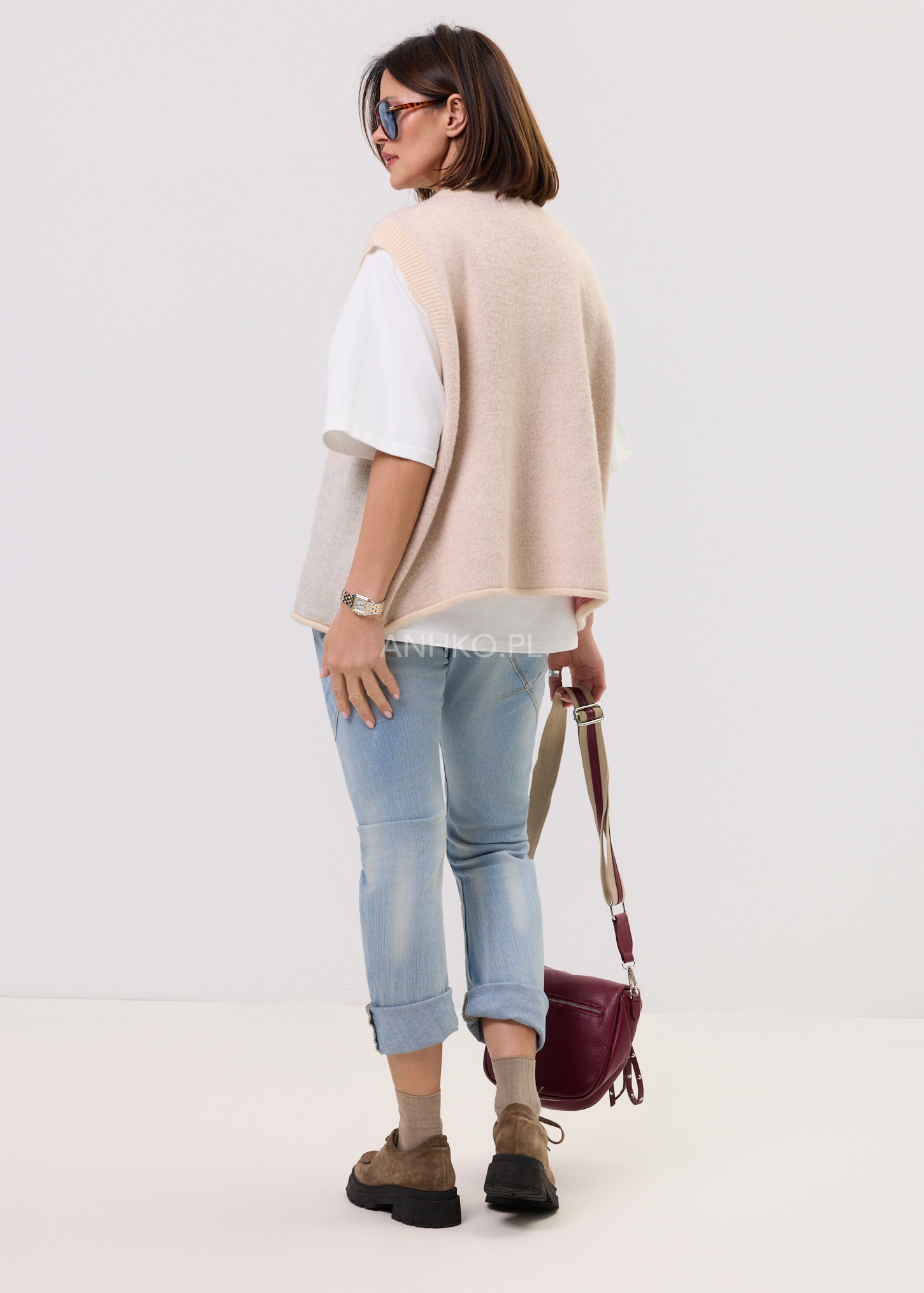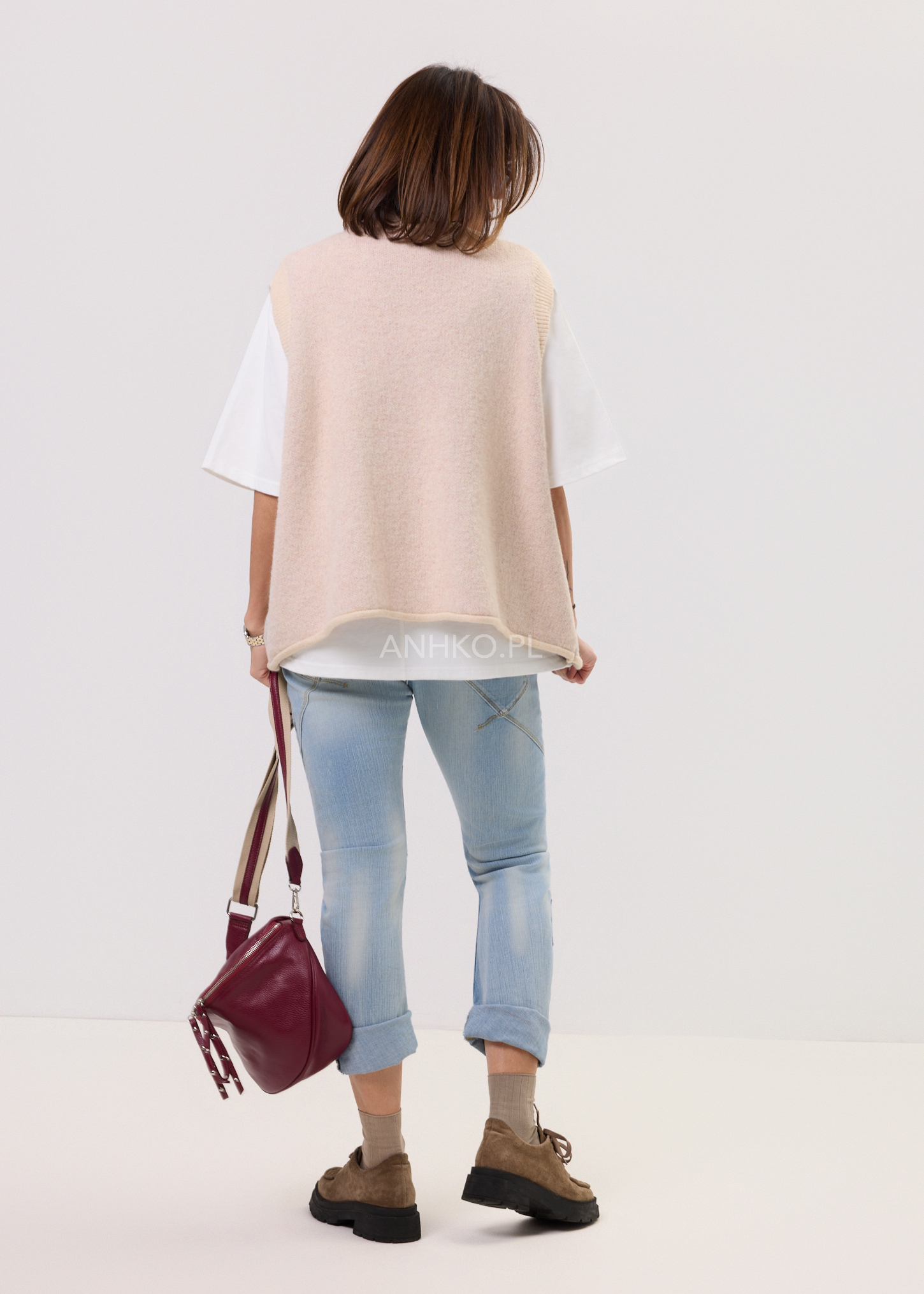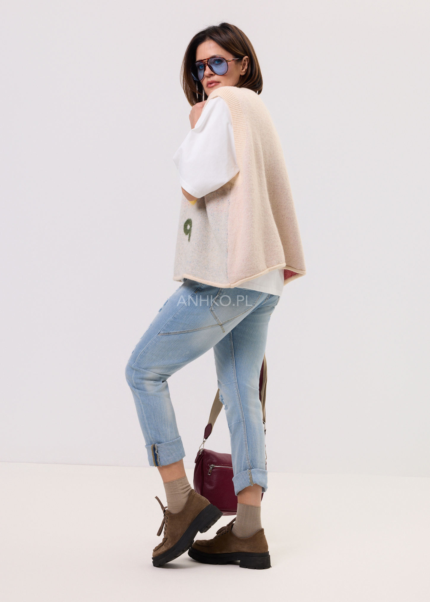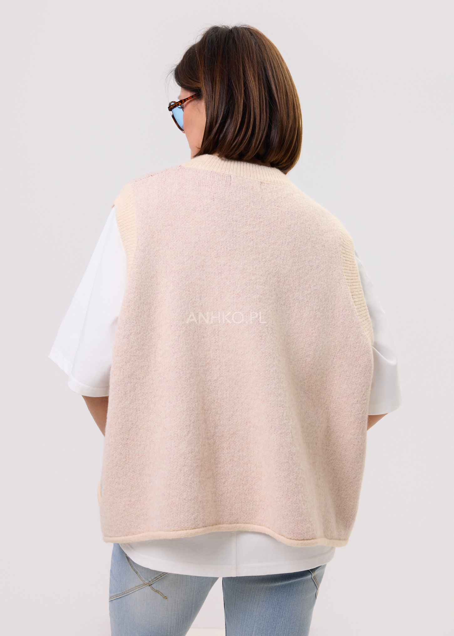 Ten bezrękawnik dzianinowy w kremowym melanżu przyciąga uwagę oryginalnym motywem wielobarwnych cyfr. Luźny fason miękko układa się na sylwetce, a delikatnie opadająca linia ramion nadaje mu swobodnego, nowoczesnego charakteru. Kontrastowy ściągacz przy dekolcie i wykończeniach podkreśla formę i nadaje całości dopracowany wygląd.