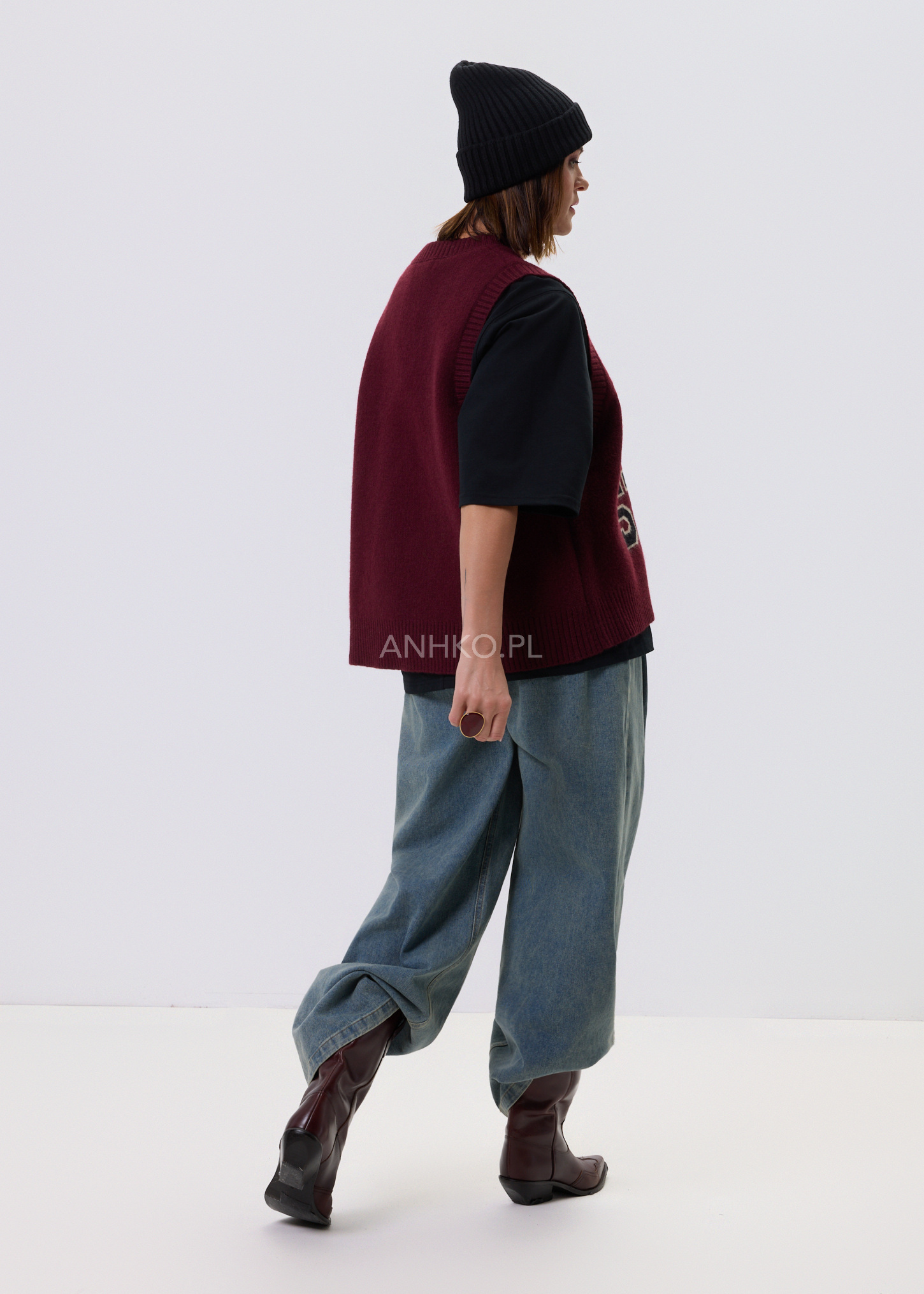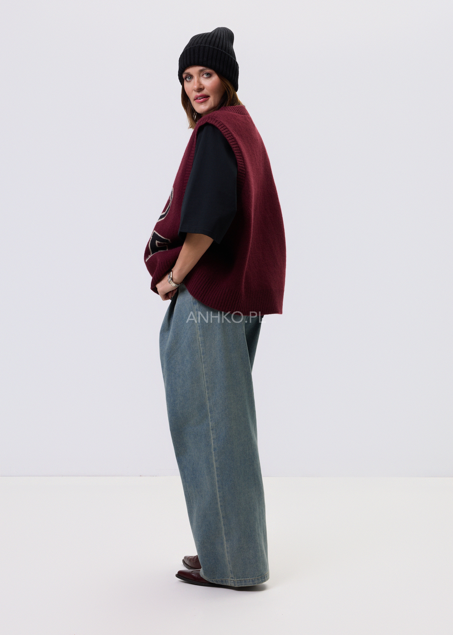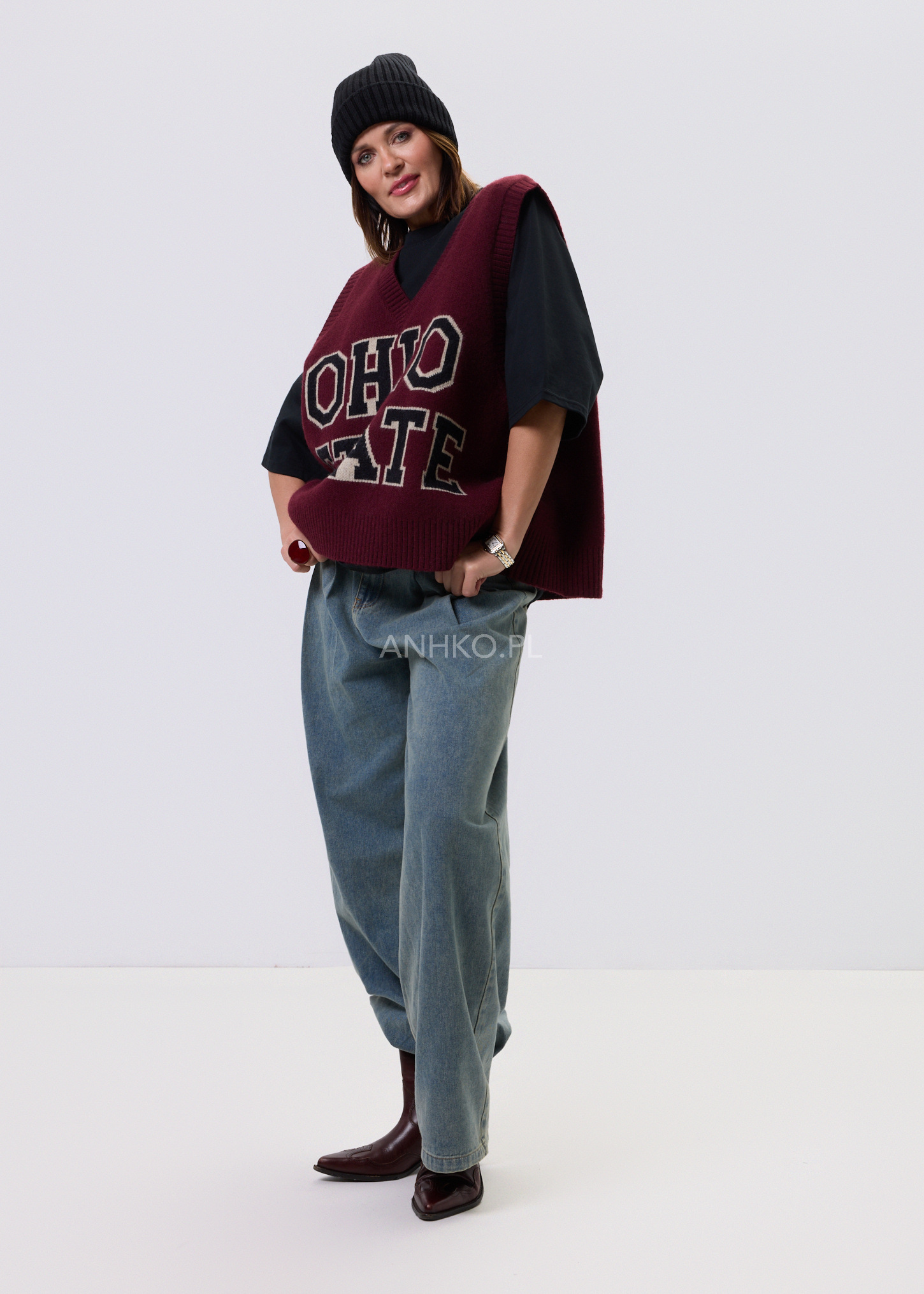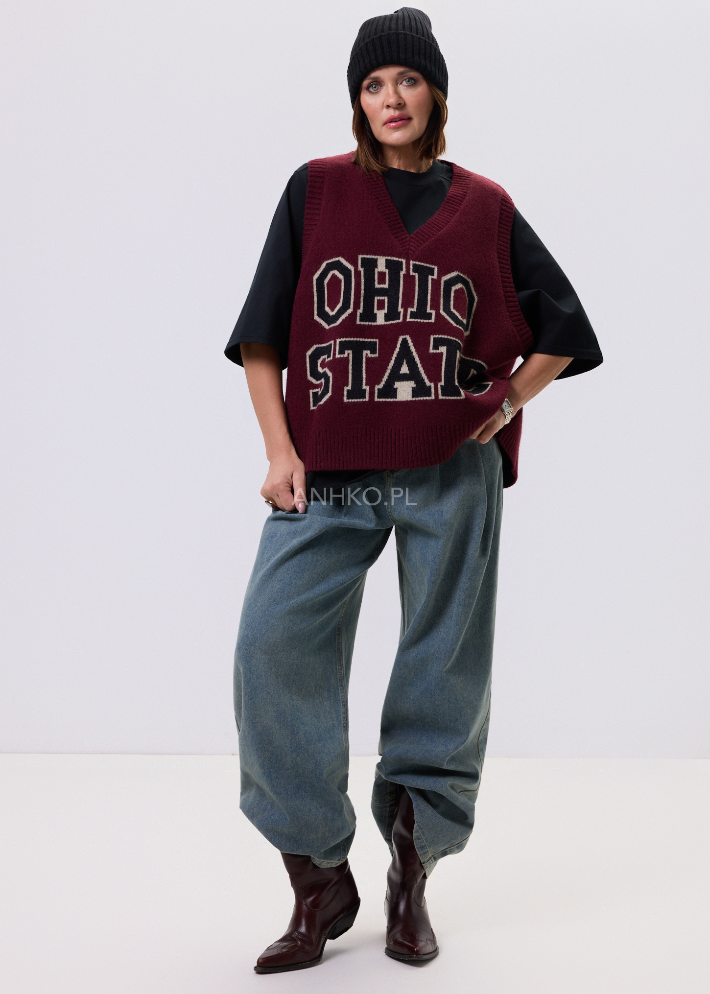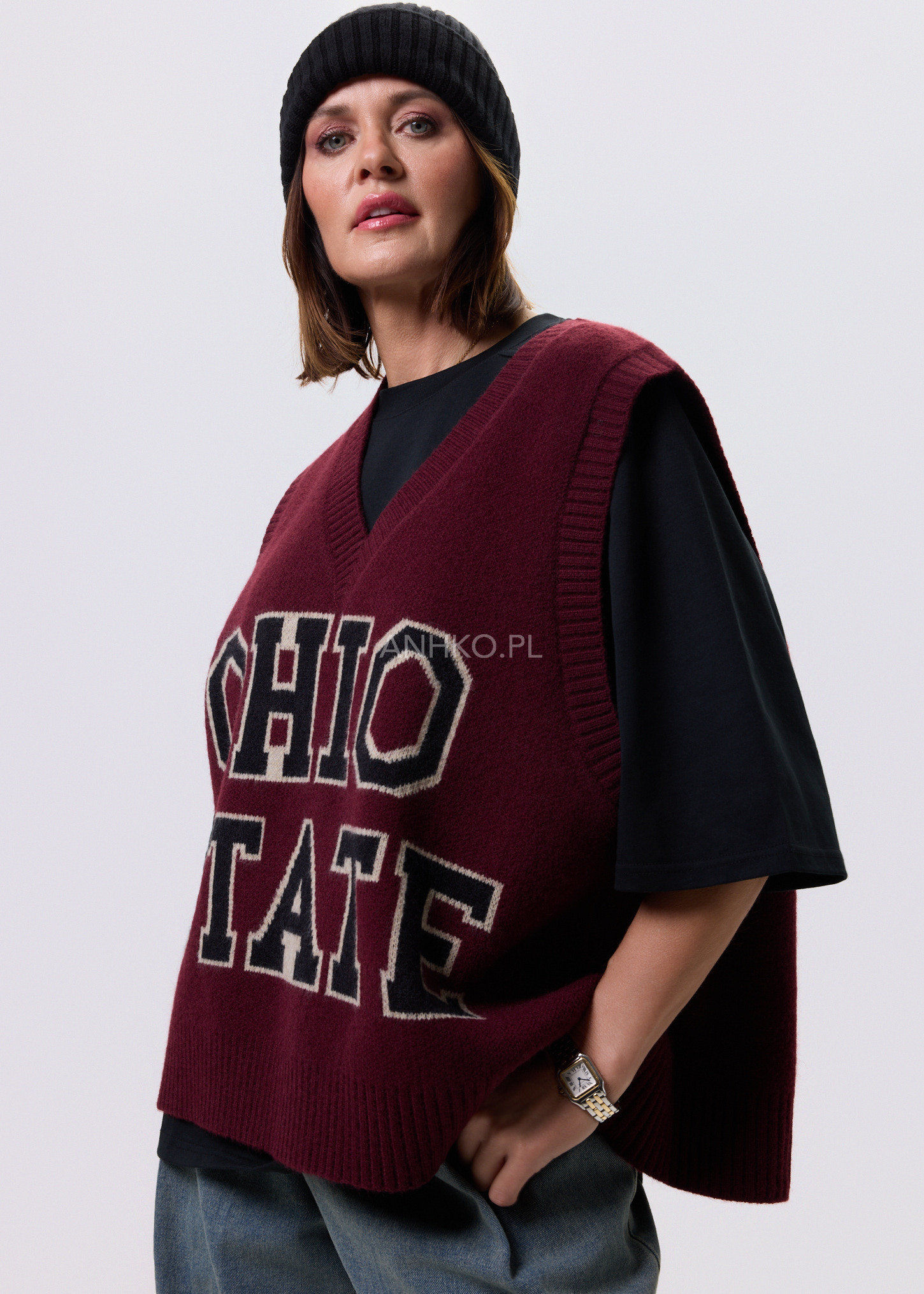 To klasyczny bezrękawnik w kolorze bordowym z dużym, kontrastowym napisem "OHIO STATE". Stylizowany na modę akademicką, świetnie sprawdzi się jako element casualowych i sportowych zestawów. Idealny na uczelnię, spotkanie z przyjaciółmi, a także na luźniejsze dni w pracy. Możesz go nosić na koszulę, t-shirt lub golf, tworząc ciekawe, warstwowe stylizacje. Wysoka jakość materiału gwarantuje komfort użytkowania oraz trwałość produktu. To must-have w każdej szafie miłośników mody retro i streetwearu.