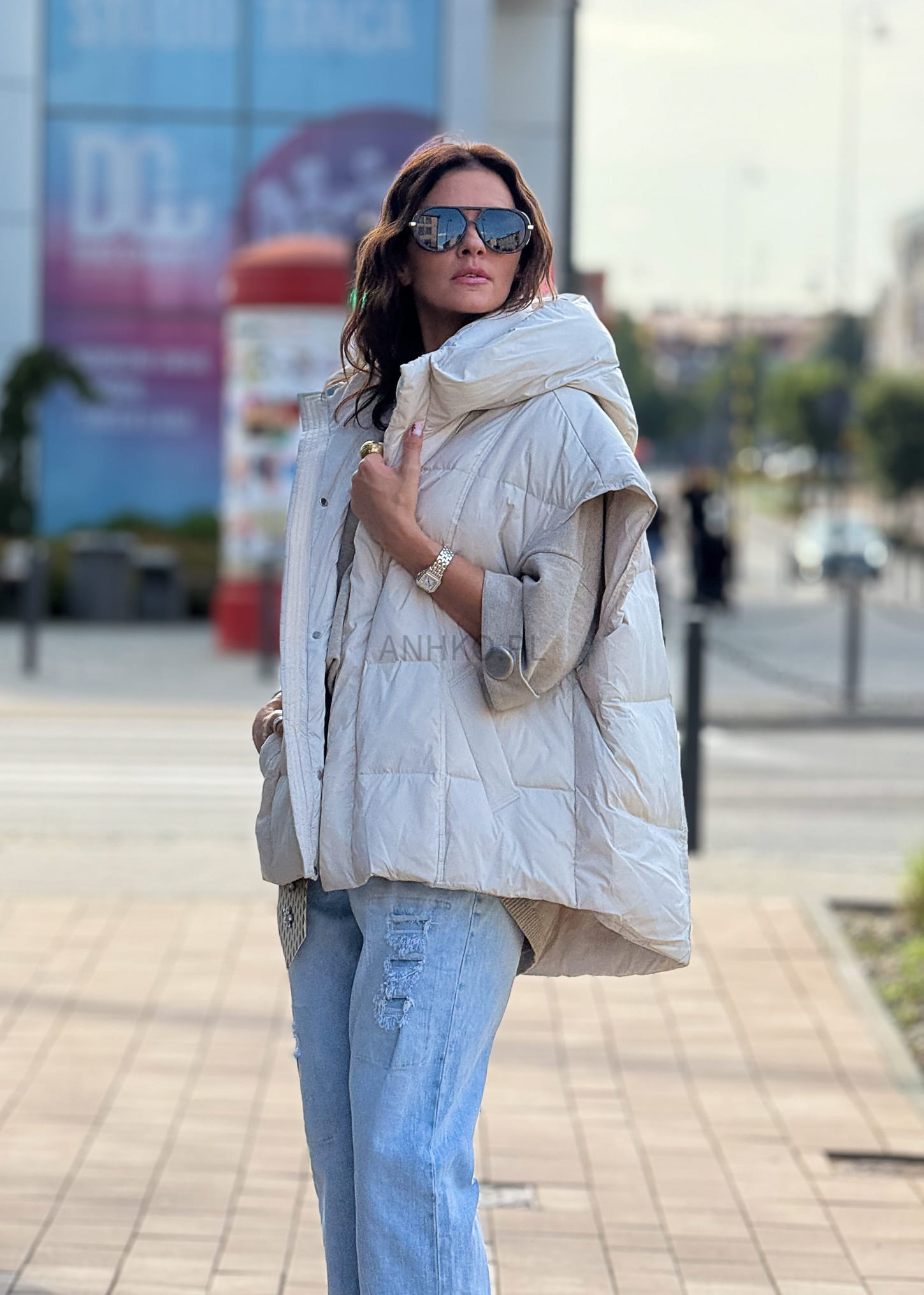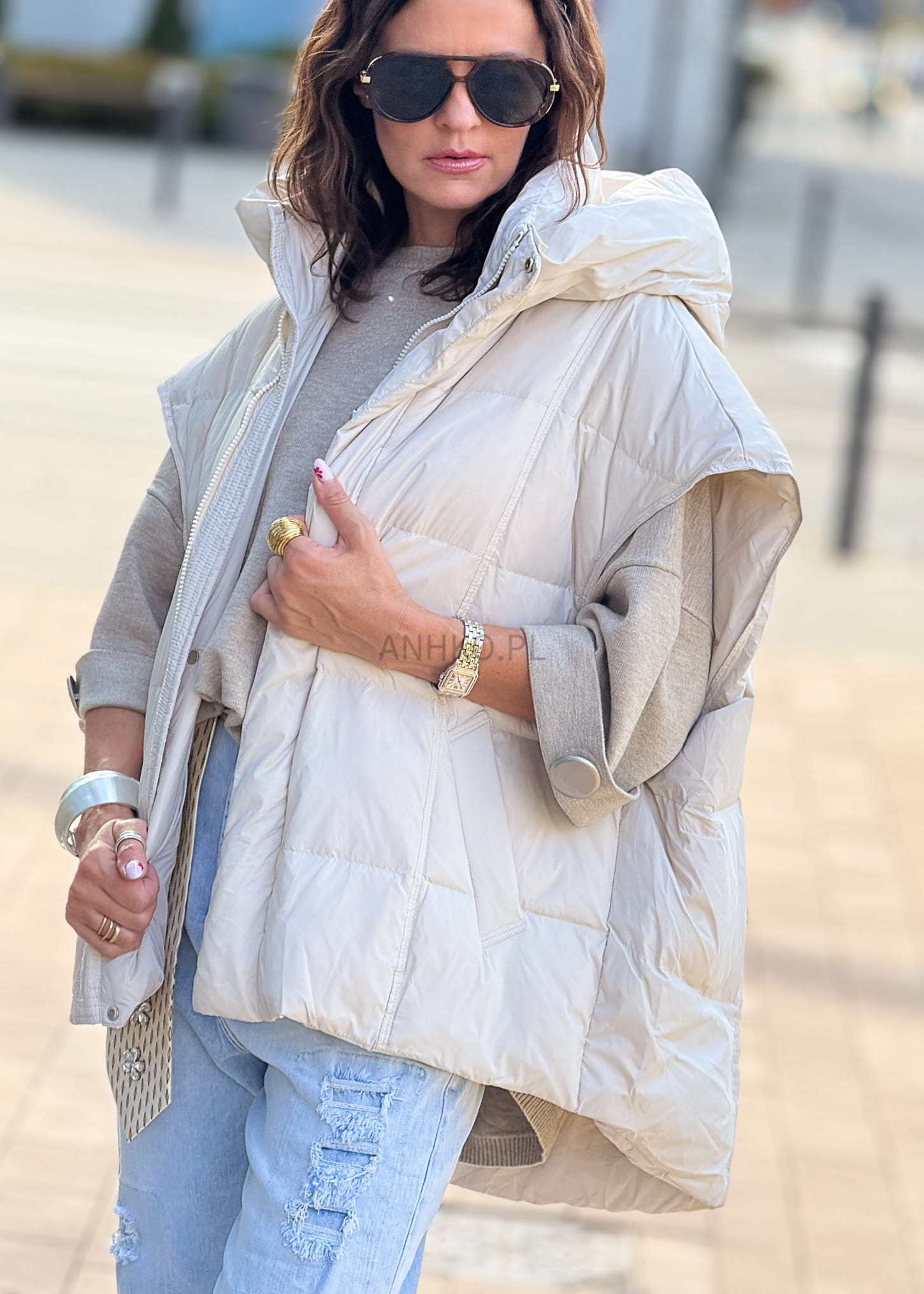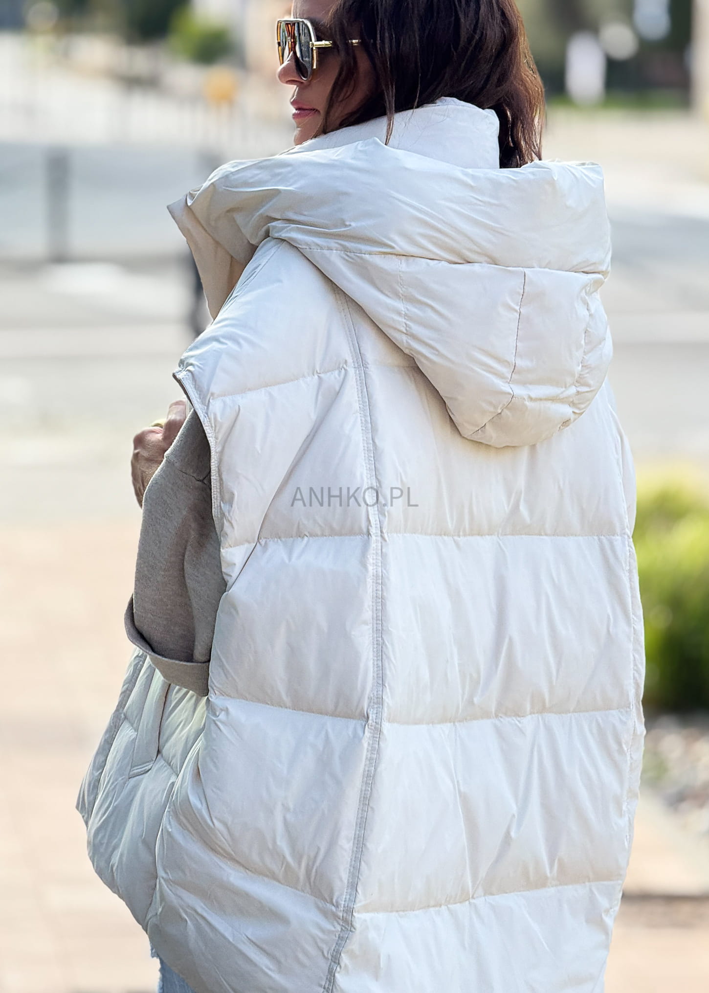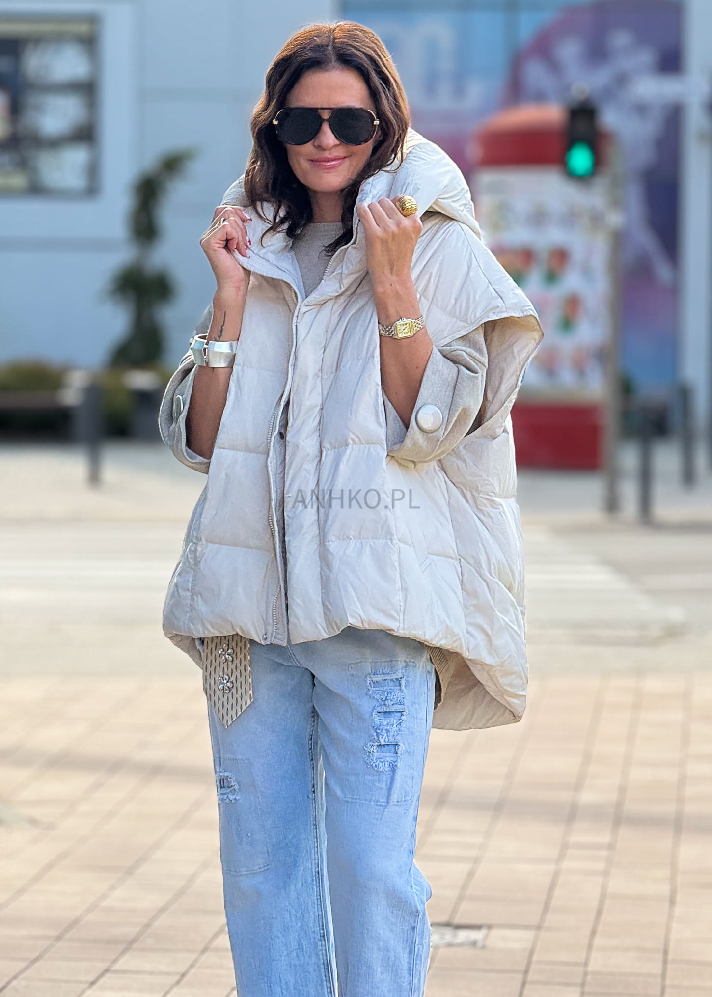 Kamizelka puchowa Soraya TEcru to obowiązkowy element garderoby na sezon przejściowy i chłodniejsze dni. Wykonana z wytrzymałego nylonu i wypełniona naturalnym puchem oraz pierzem, zapewnia ciepło, lekkość i pełną swobodę ruchów. To jednocześnie kamizelka pikowana o ponadczasowym fasonie, który doskonale odnajdzie się w miejskich stylizacjach oraz podczas weekendowych wyjazdów. Uniwersalny kolor łatwo zestawisz z jeansami, dresami czy sportową sukienką. Kaptur chroni przed wiatrem i deszczem, a praktyczne wykończenie sprawia, że ta kamizelka zimowa łączy w sobie funkcjonalność i modny charakter.