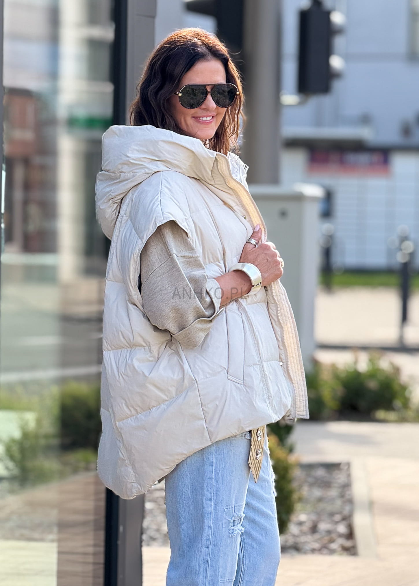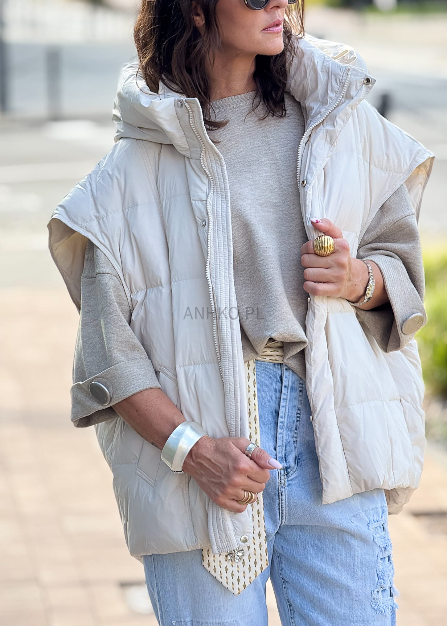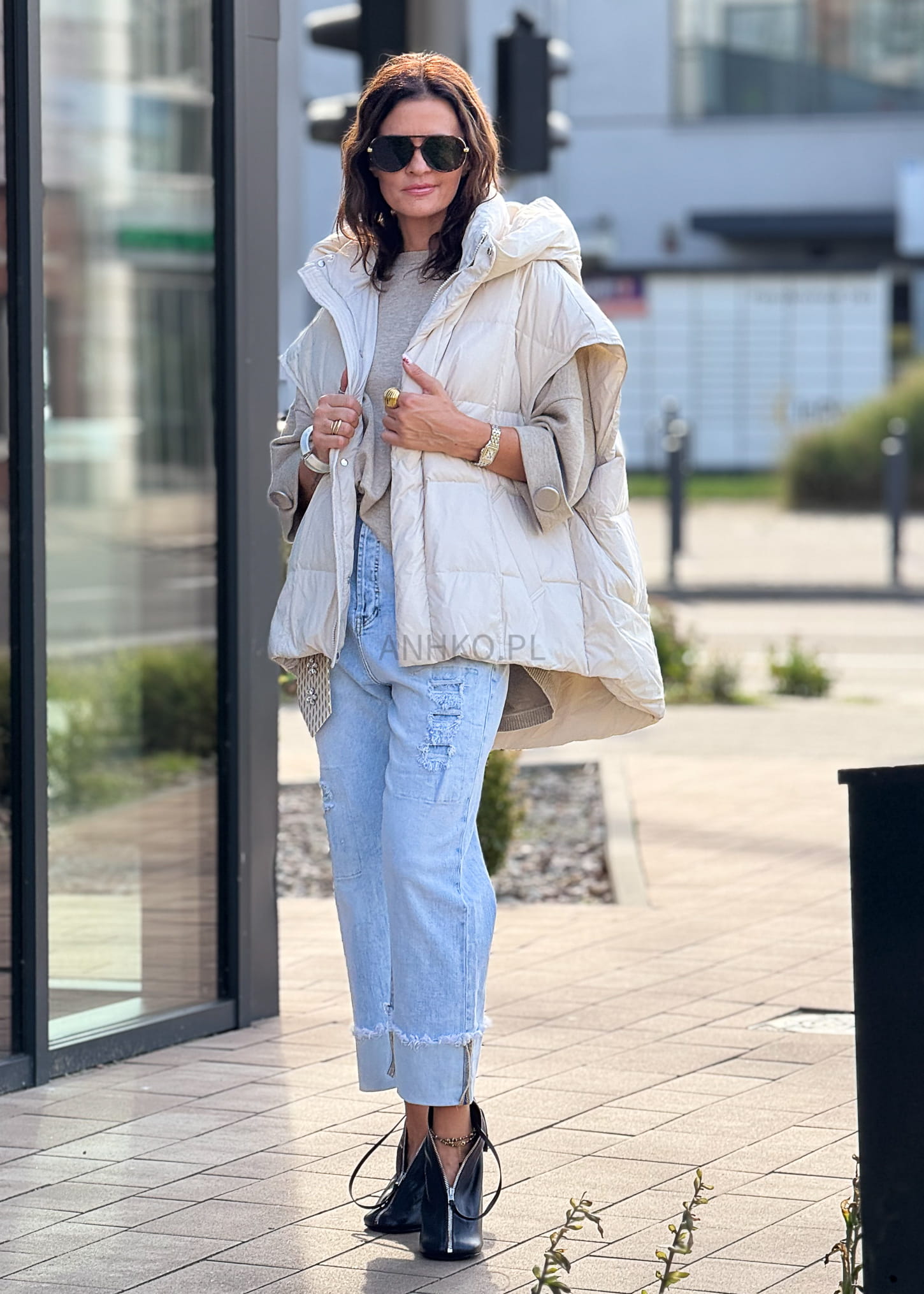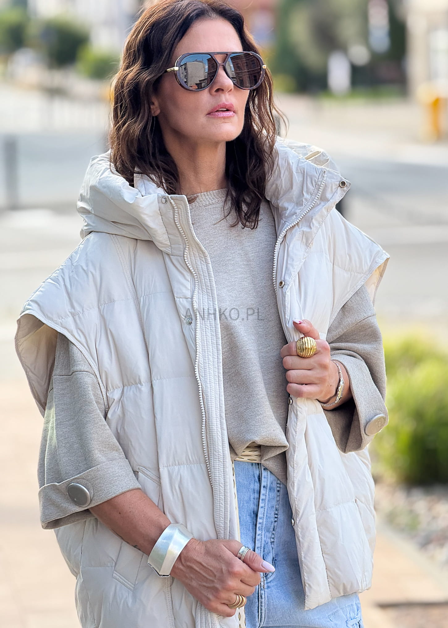 Kamizelka puchowa Soraya TEcru to obowiązkowy element garderoby na sezon przejściowy i chłodniejsze dni. Wykonana z wytrzymałego nylonu i wypełniona naturalnym puchem oraz pierzem, zapewnia ciepło, lekkość i pełną swobodę ruchów. To jednocześnie kamizelka pikowana o ponadczasowym fasonie, który doskonale odnajdzie się w miejskich stylizacjach oraz podczas weekendowych wyjazdów. Uniwersalny kolor łatwo zestawisz z jeansami, dresami czy sportową sukienką. Kaptur chroni przed wiatrem i deszczem, a praktyczne wykończenie sprawia, że ta kamizelka zimowa łączy w sobie funkcjonalność i modny charakter.
