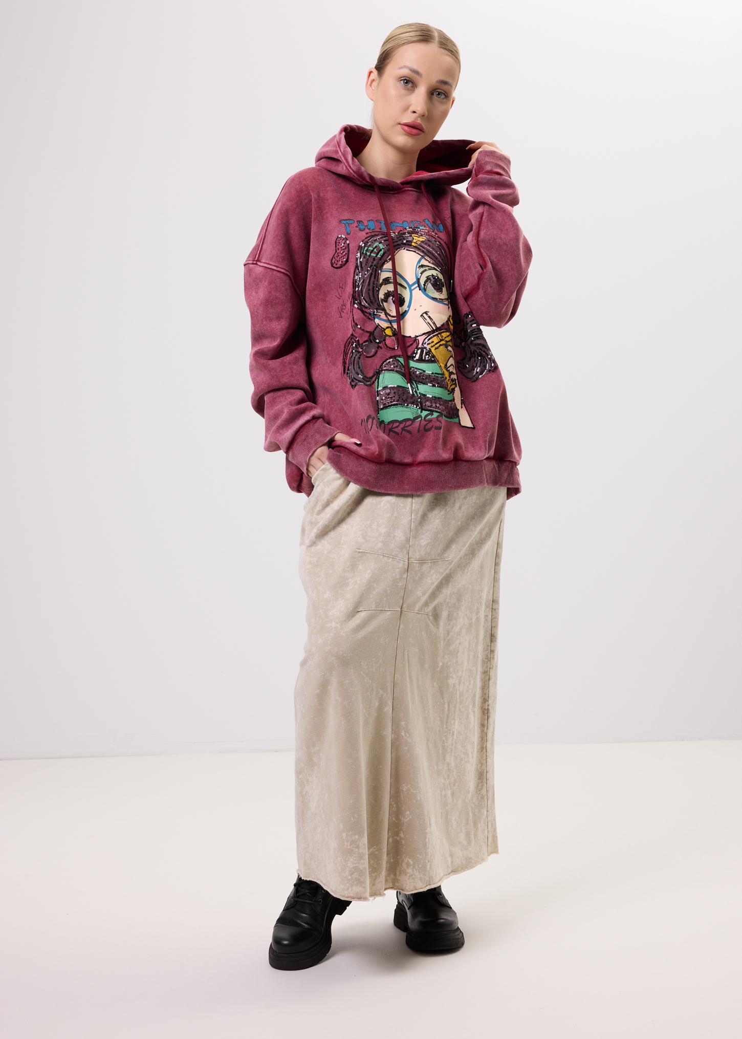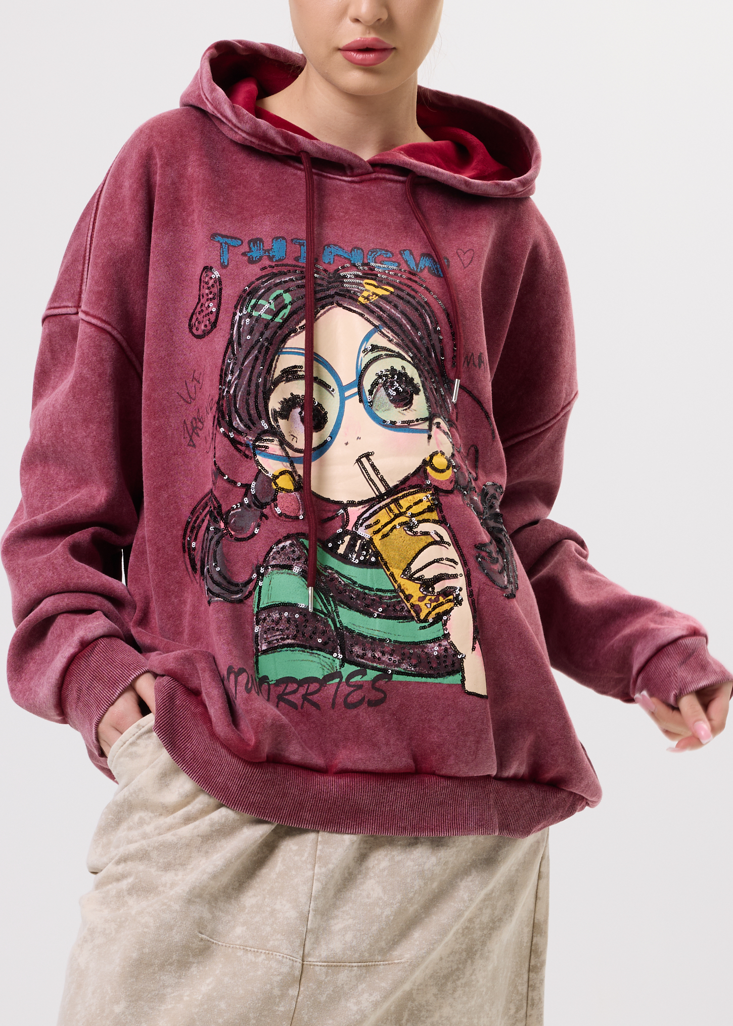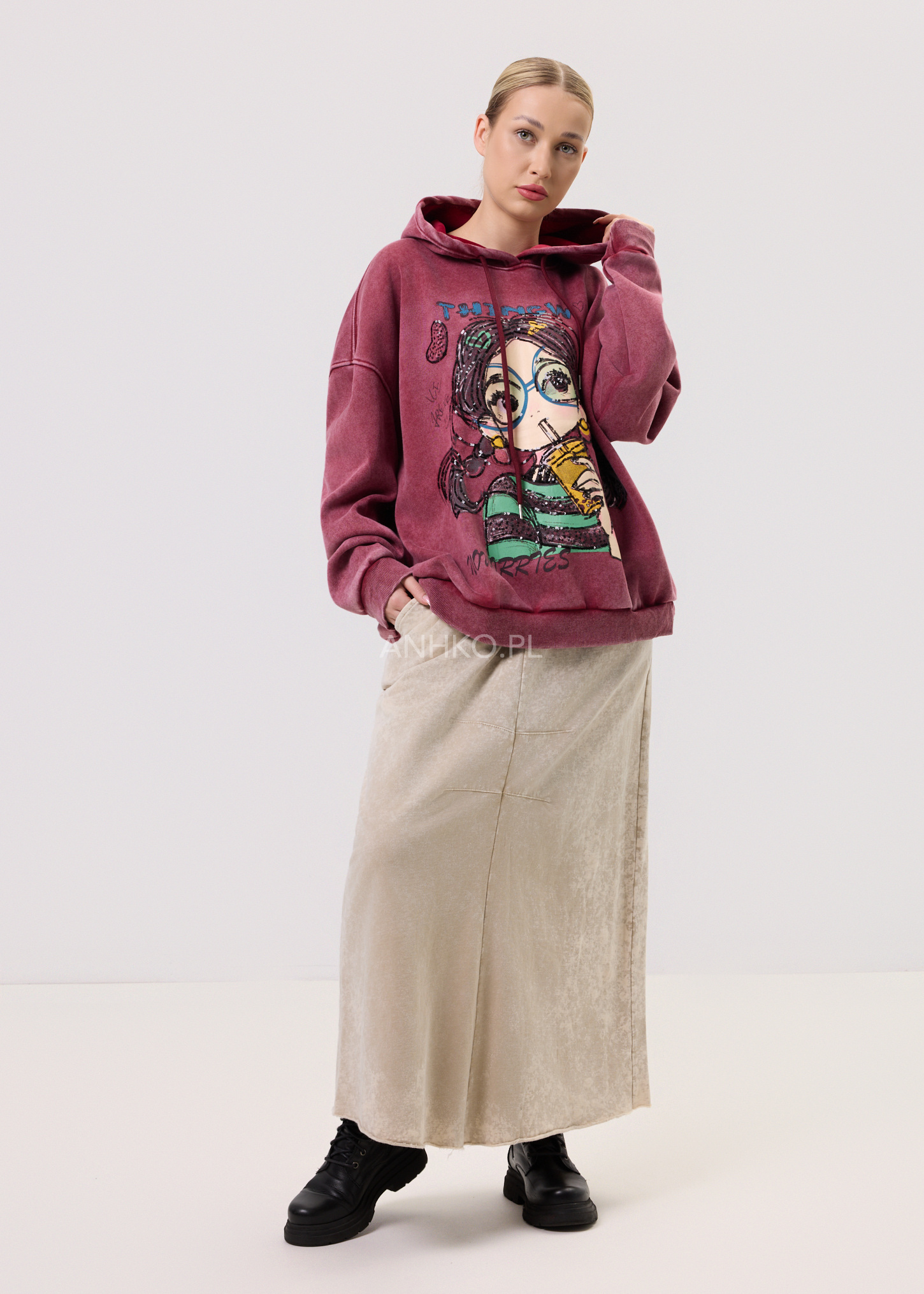 Ta bluza z kapturem to propozycja dla osób, które cenią modę z charakterem i swobodny styl. Przyciągający uwagę nadruk z subtelnymi cekinami nadaje jej artystycznego wyrazu i sprawia, że staje się mocnym akcentem stylizacji. Luźny krój zapewnia komfort noszenia przez cały dzień, a kaptur ze sznurkami dodaje casualowego charakteru. Model nie posiada kieszeni ani podszewki, dzięki czemu pozostaje lekki i uniwersalny. Bluza świetnie sprawdzi się w zestawieniu z jeansami, legginsami lub spódnicą, zarówno na co dzień, do pracy w luźnym dress codzie, jak i na spotkania ze znajomymi czy weekendowe wyjścia.