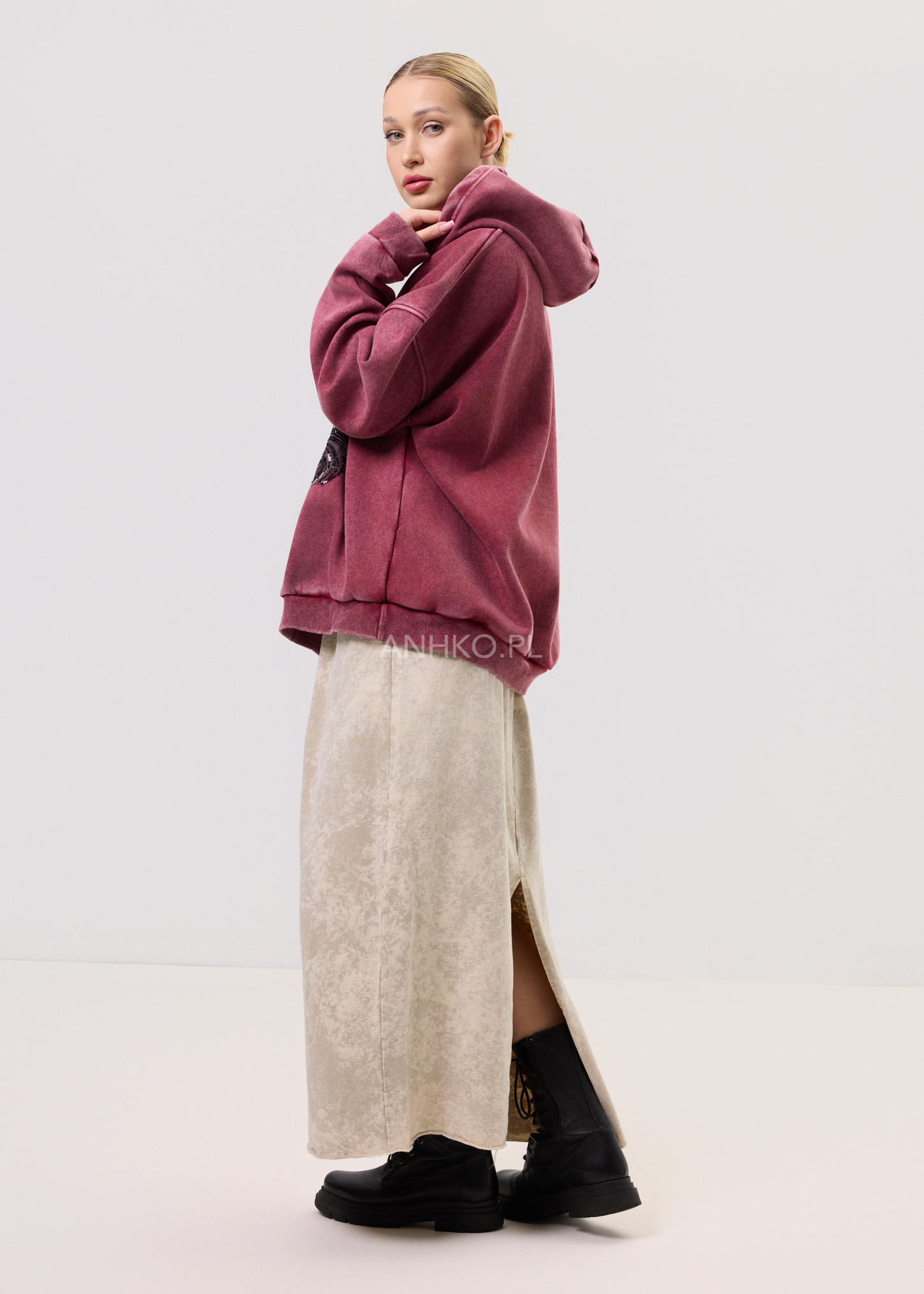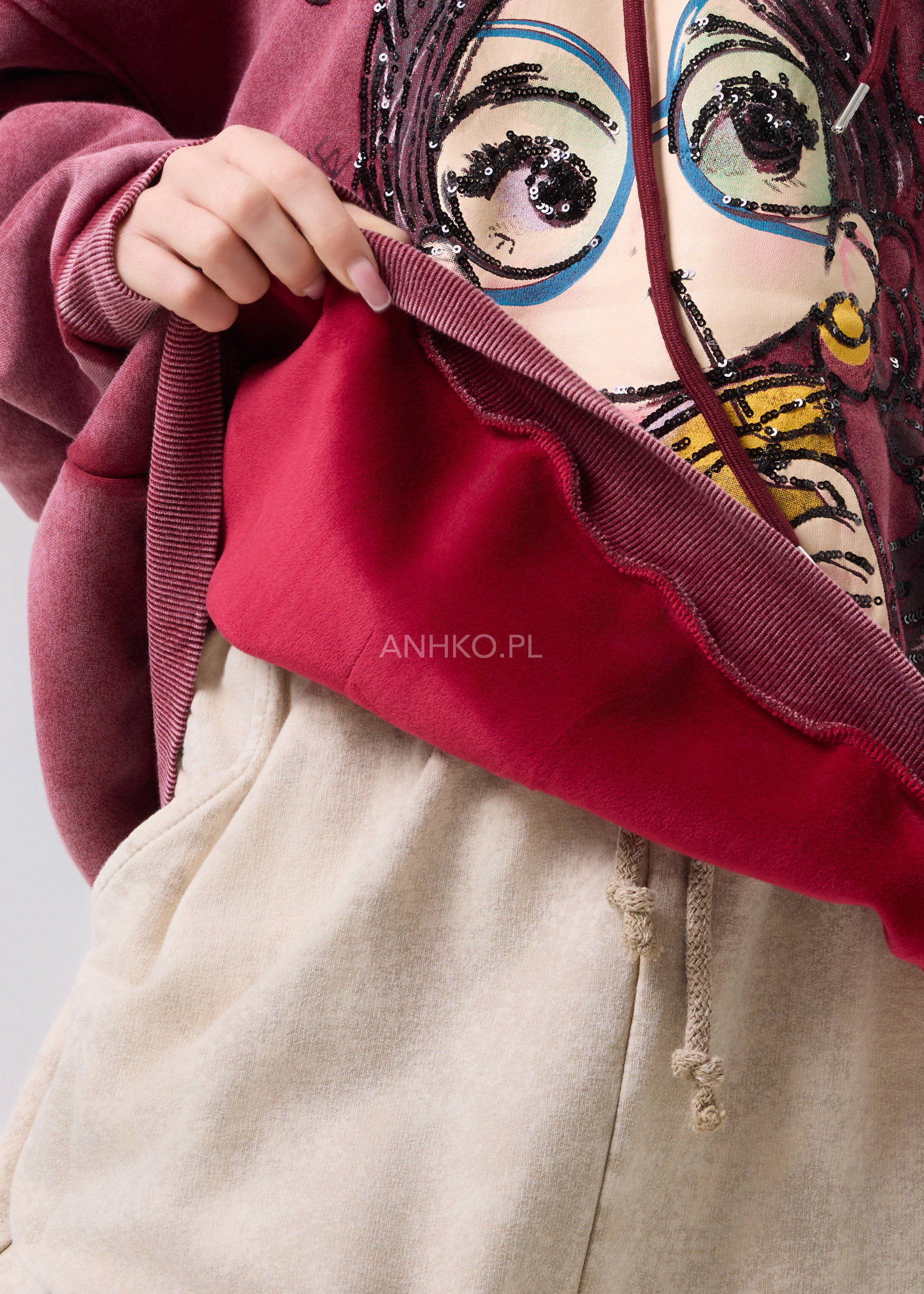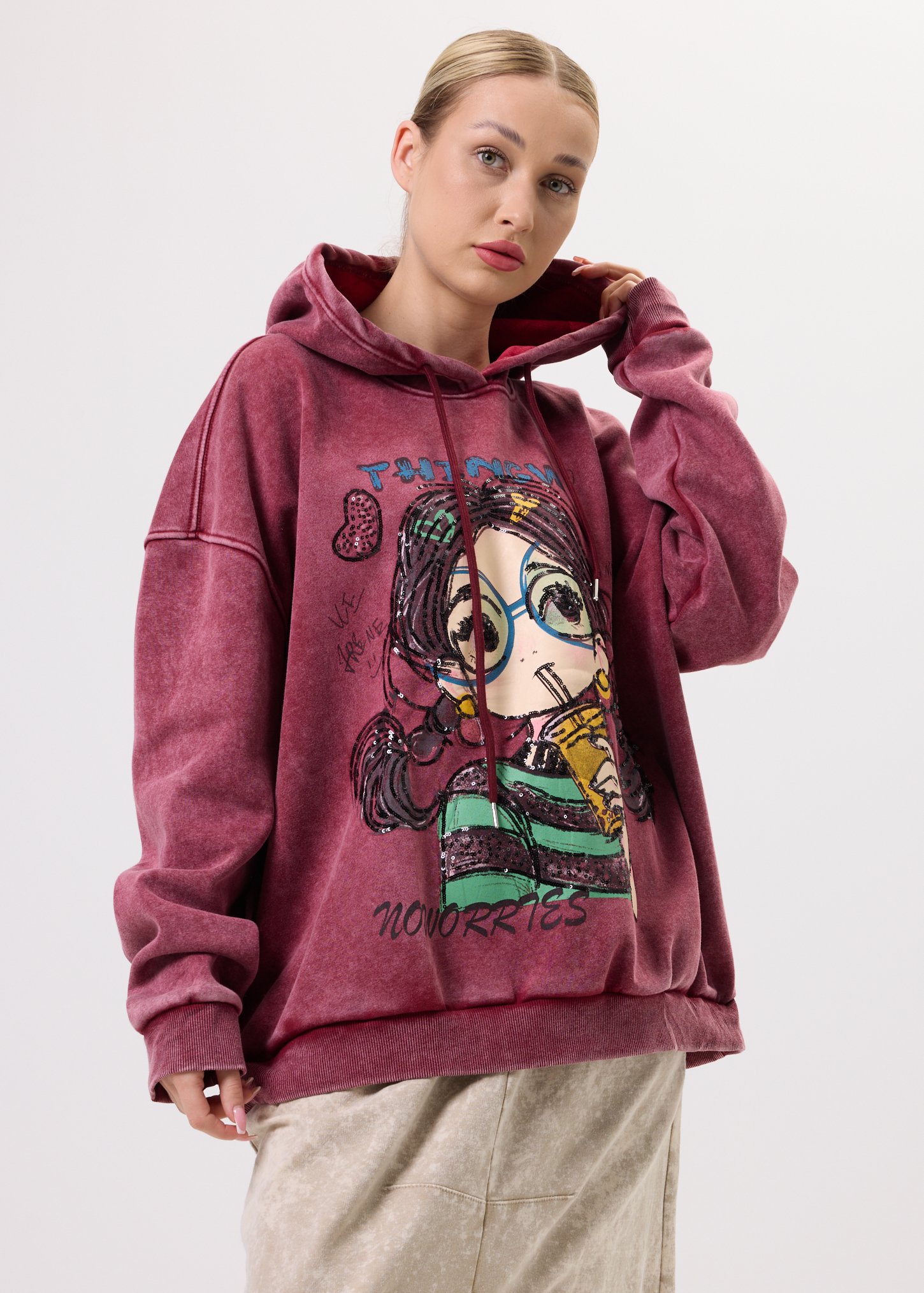 Ta bluza z kapturem to propozycja dla osób, które cenią modę z charakterem i swobodny styl. Przyciągający uwagę nadruk z subtelnymi cekinami nadaje jej artystycznego wyrazu i sprawia, że staje się mocnym akcentem stylizacji. Luźny krój zapewnia komfort noszenia przez cały dzień, a kaptur ze sznurkami dodaje casualowego charakteru. Model nie posiada kieszeni ani podszewki, dzięki czemu pozostaje lekki i uniwersalny. Bluza świetnie sprawdzi się w zestawieniu z jeansami, legginsami lub spódnicą, zarówno na co dzień, do pracy w luźnym dress codzie, jak i na spotkania ze znajomymi czy weekendowe wyjścia.