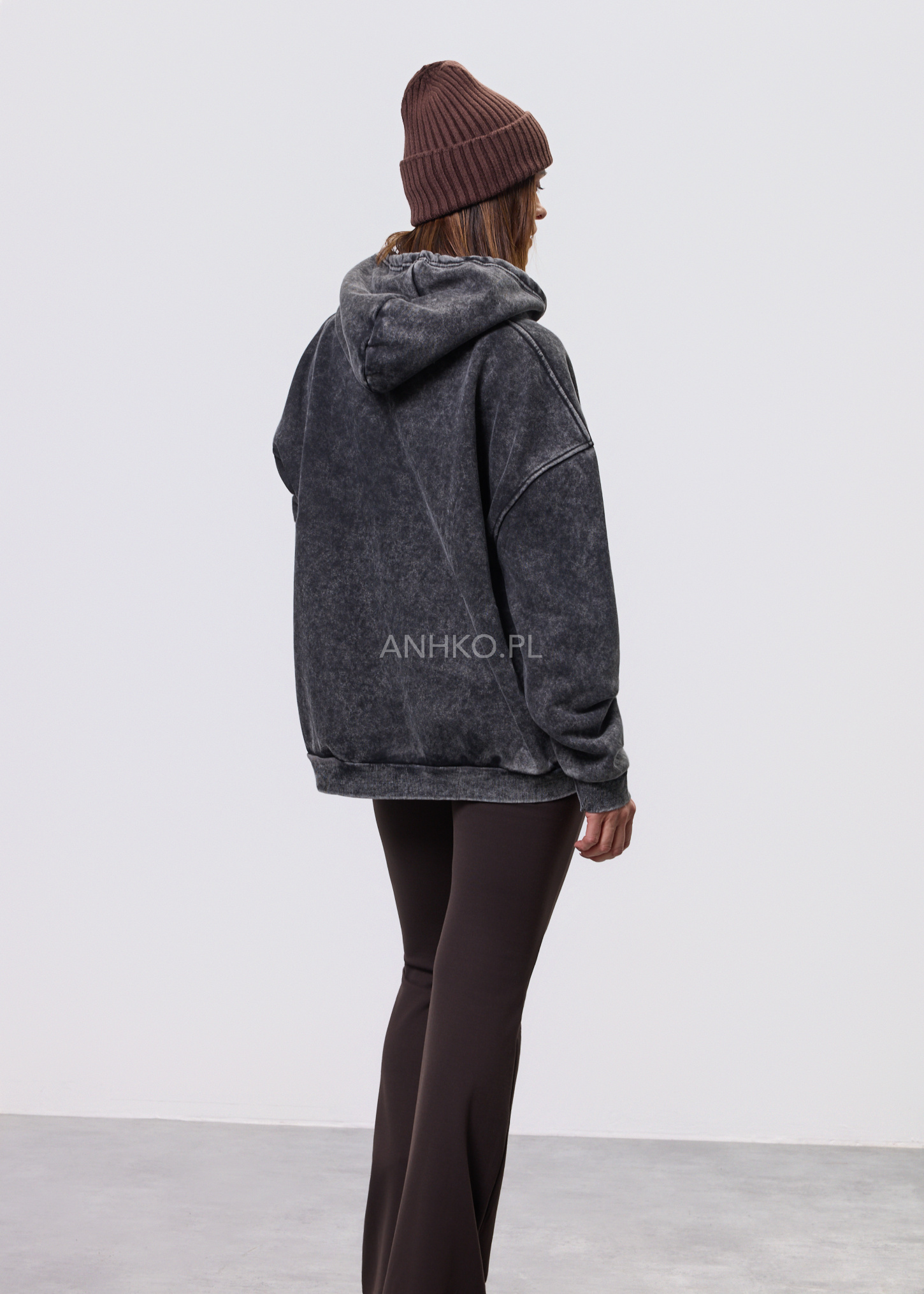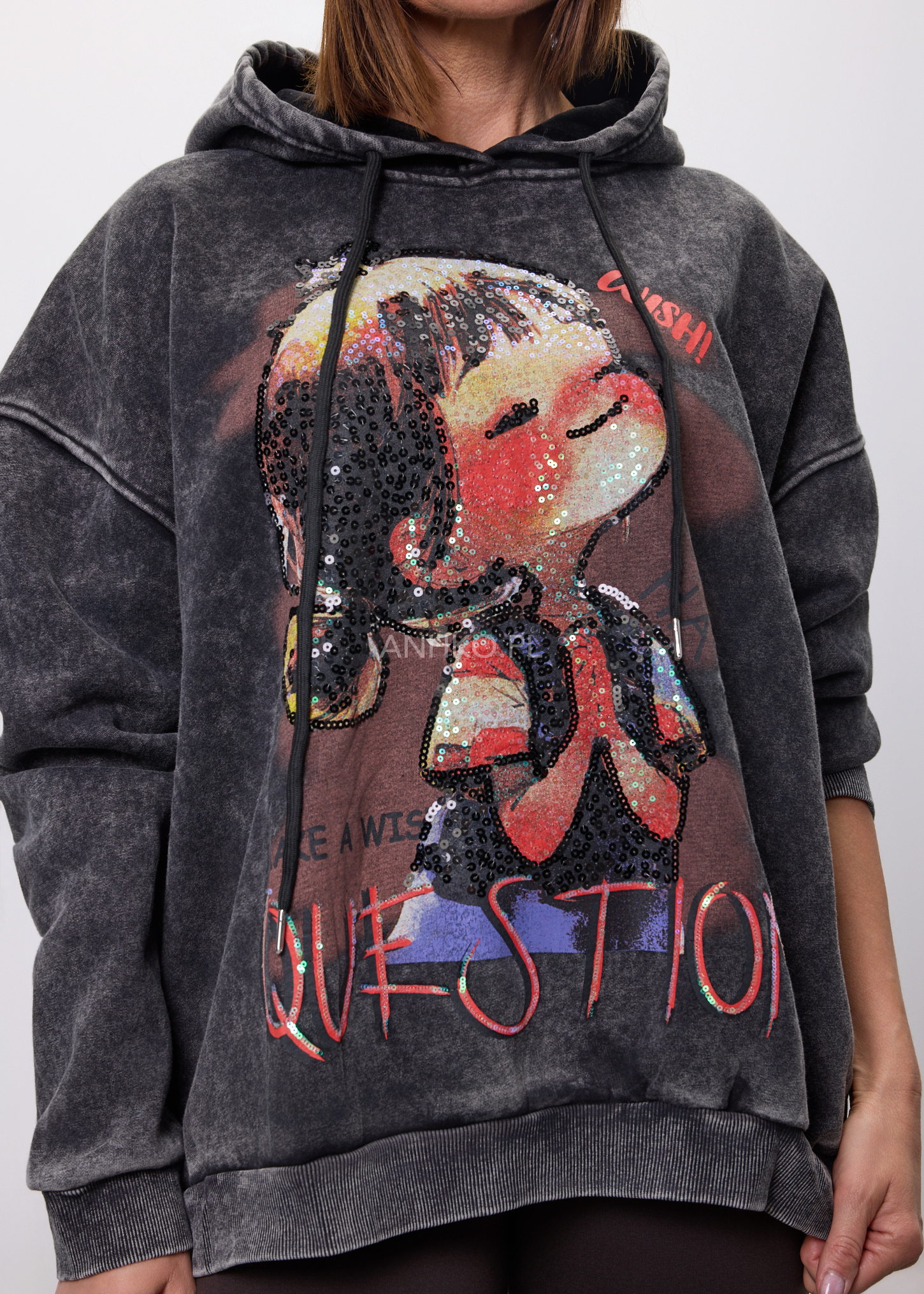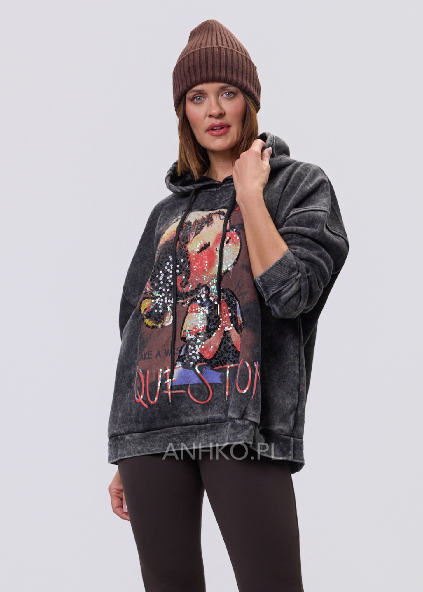 Ta bluza z kapturem to połączenie casualowego komfortu i mocnego, modowego wyrazu. Luźny fason zapewnia swobodę ruchów oraz wygodę noszenia przez cały dzień. Duży nadruk z aplikacją cekinową nadaje bluzie unikalny charakter i sprawia, że staje się głównym elementem stylizacji. Model posiada kaptur z regulacją na sznurki, długie rękawy zakończone elastycznymi ściągaczami oraz dół wykończony ściągaczem, który dobrze układa się na sylwetce. Bluza nie posiada kieszeni ani podszewki, dzięki czemu pozostaje lekka i uniwersalna. Świetnie komponuje się z jeansami, legginsami lub spódnicą – idealna na co dzień, spacer, zakupy czy nieformalne spotkania.