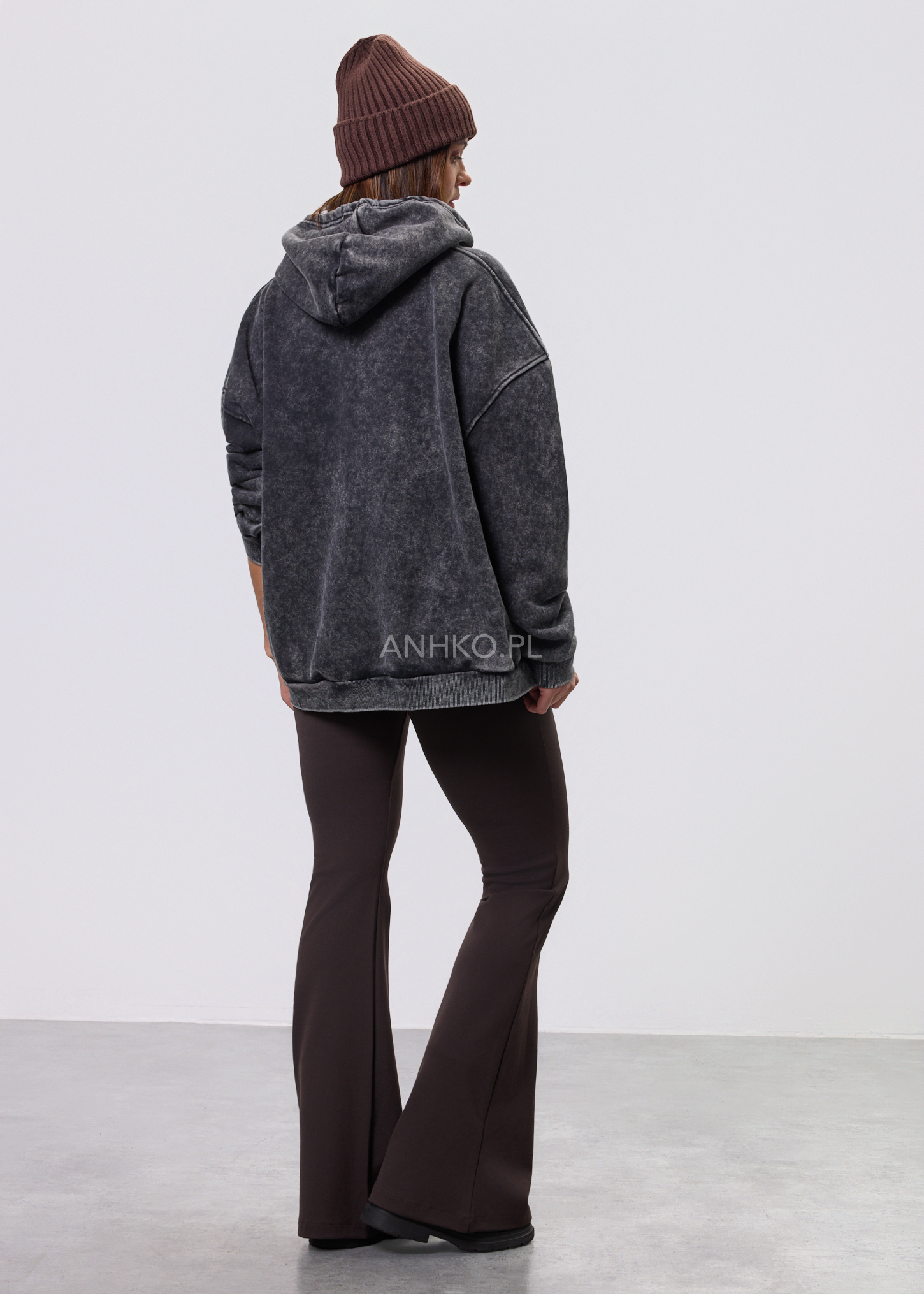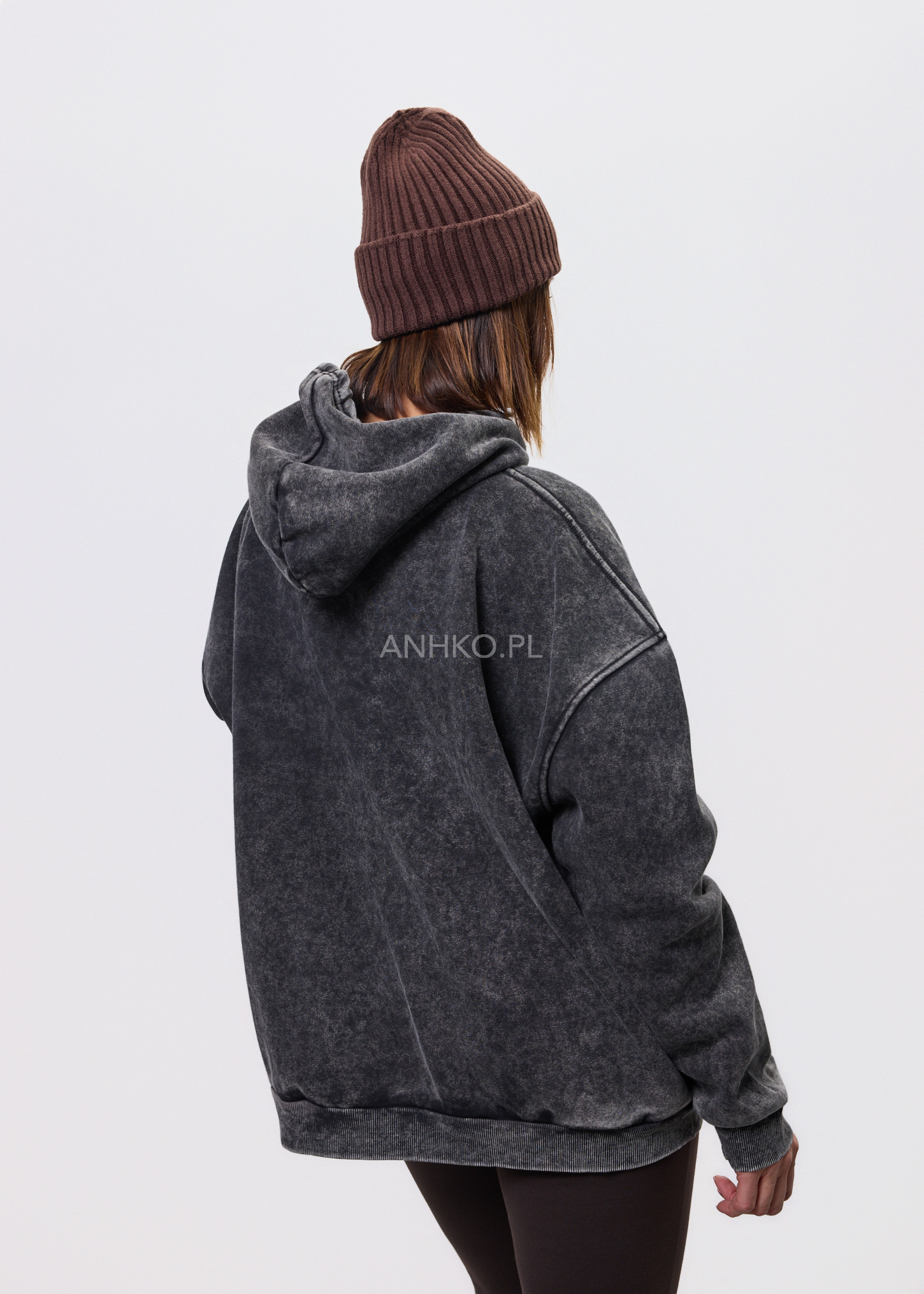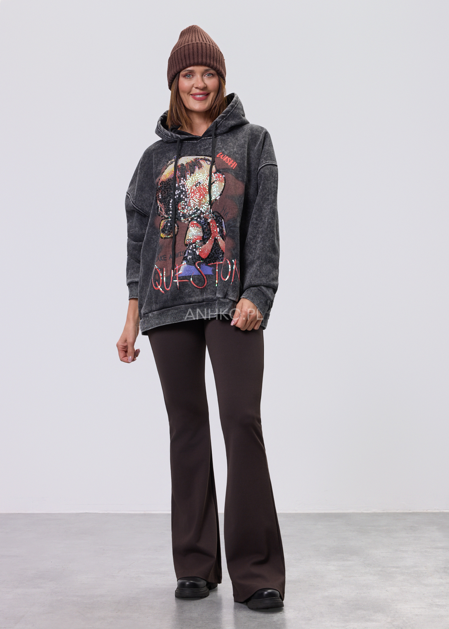 Ta bluza z kapturem to połączenie casualowego komfortu i mocnego, modowego wyrazu. Luźny fason zapewnia swobodę ruchów oraz wygodę noszenia przez cały dzień. Duży nadruk z aplikacją cekinową nadaje bluzie unikalny charakter i sprawia, że staje się głównym elementem stylizacji. Model posiada kaptur z regulacją na sznurki, długie rękawy zakończone elastycznymi ściągaczami oraz dół wykończony ściągaczem, który dobrze układa się na sylwetce. Bluza nie posiada kieszeni ani podszewki, dzięki czemu pozostaje lekka i uniwersalna. Świetnie komponuje się z jeansami, legginsami lub spódnicą – idealna na co dzień, spacer, zakupy czy nieformalne spotkania.