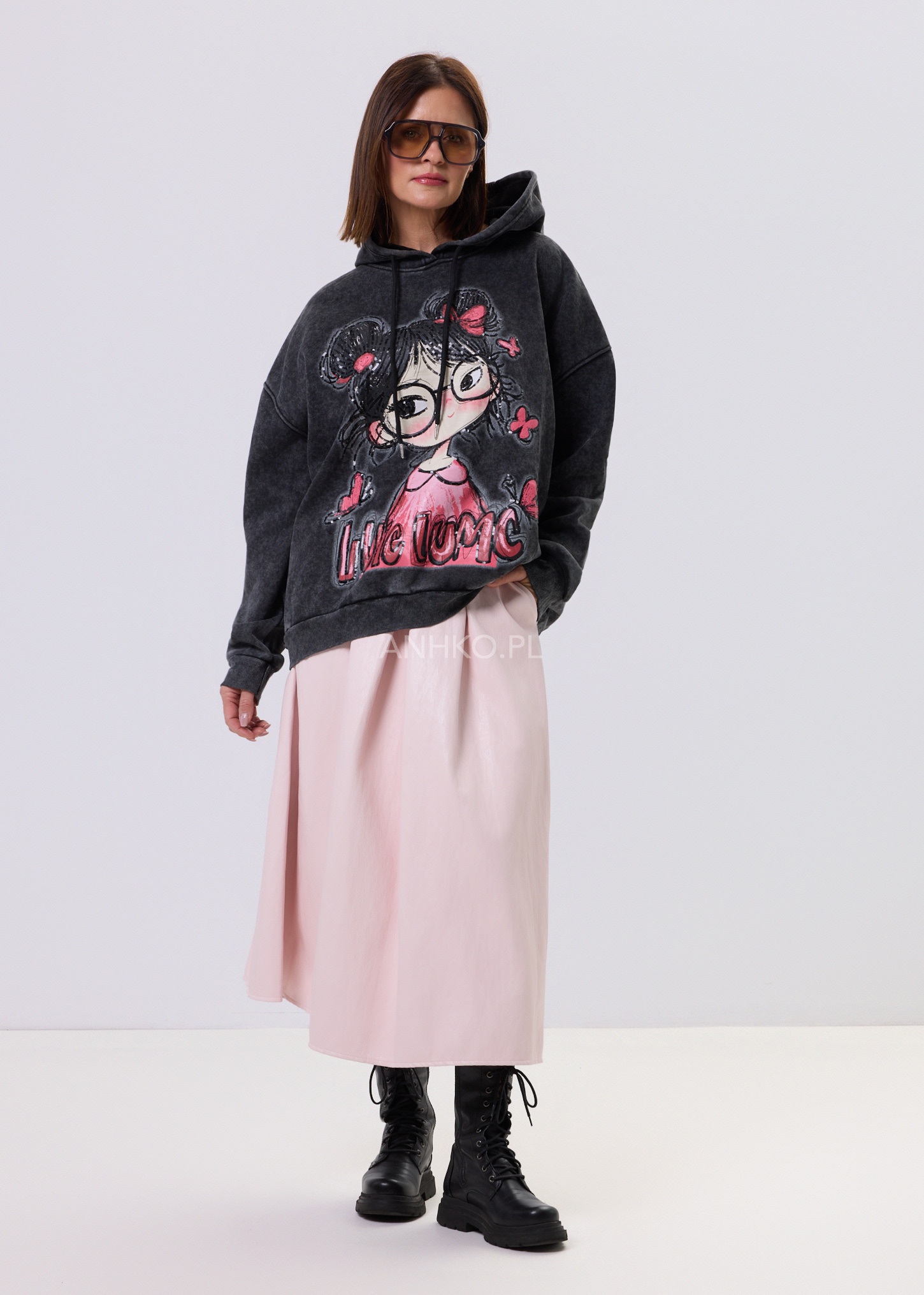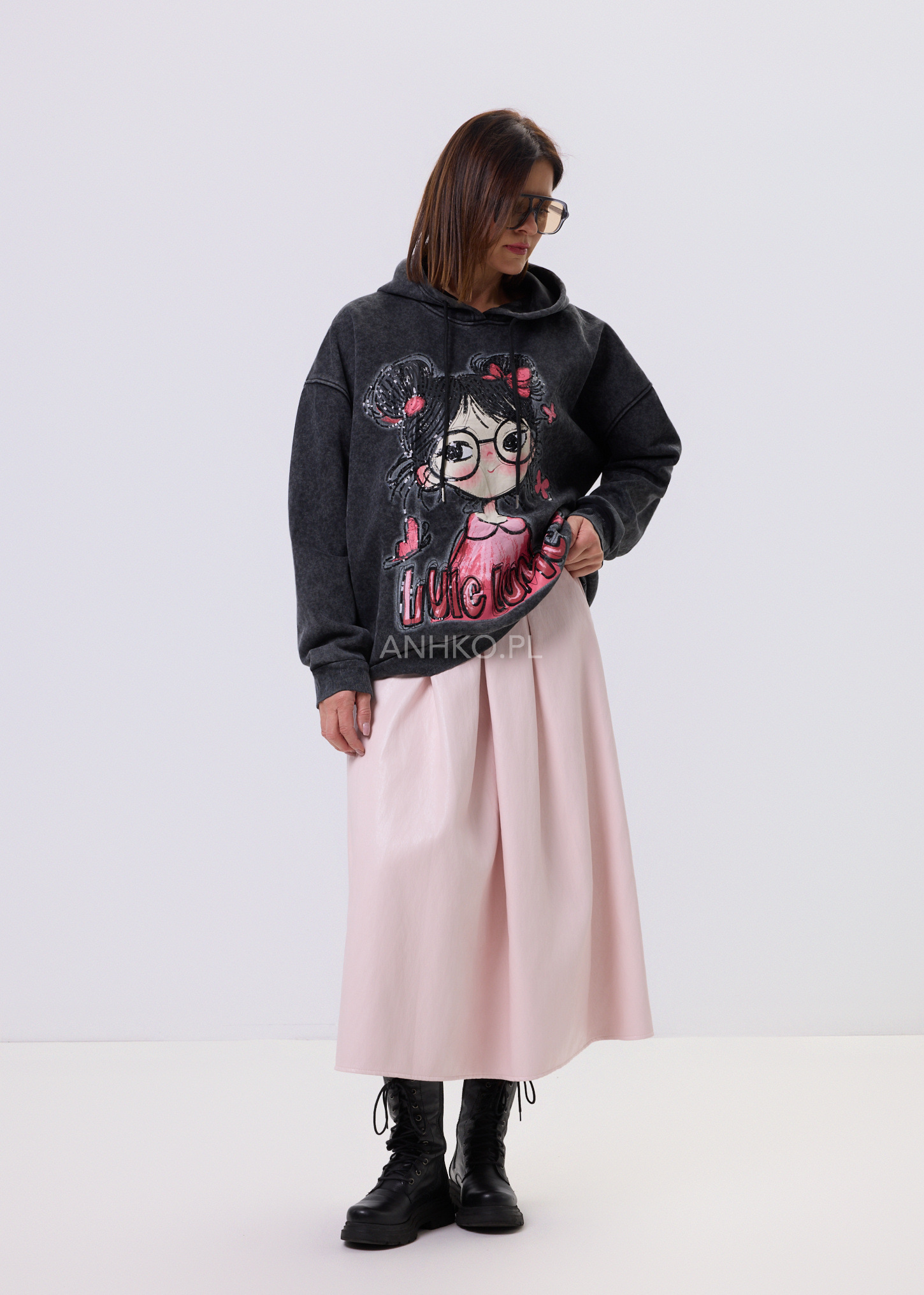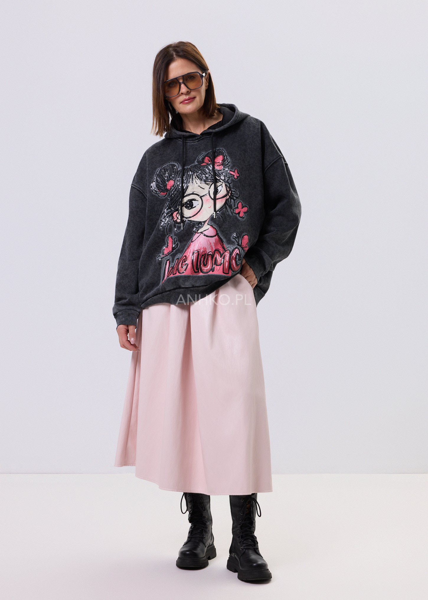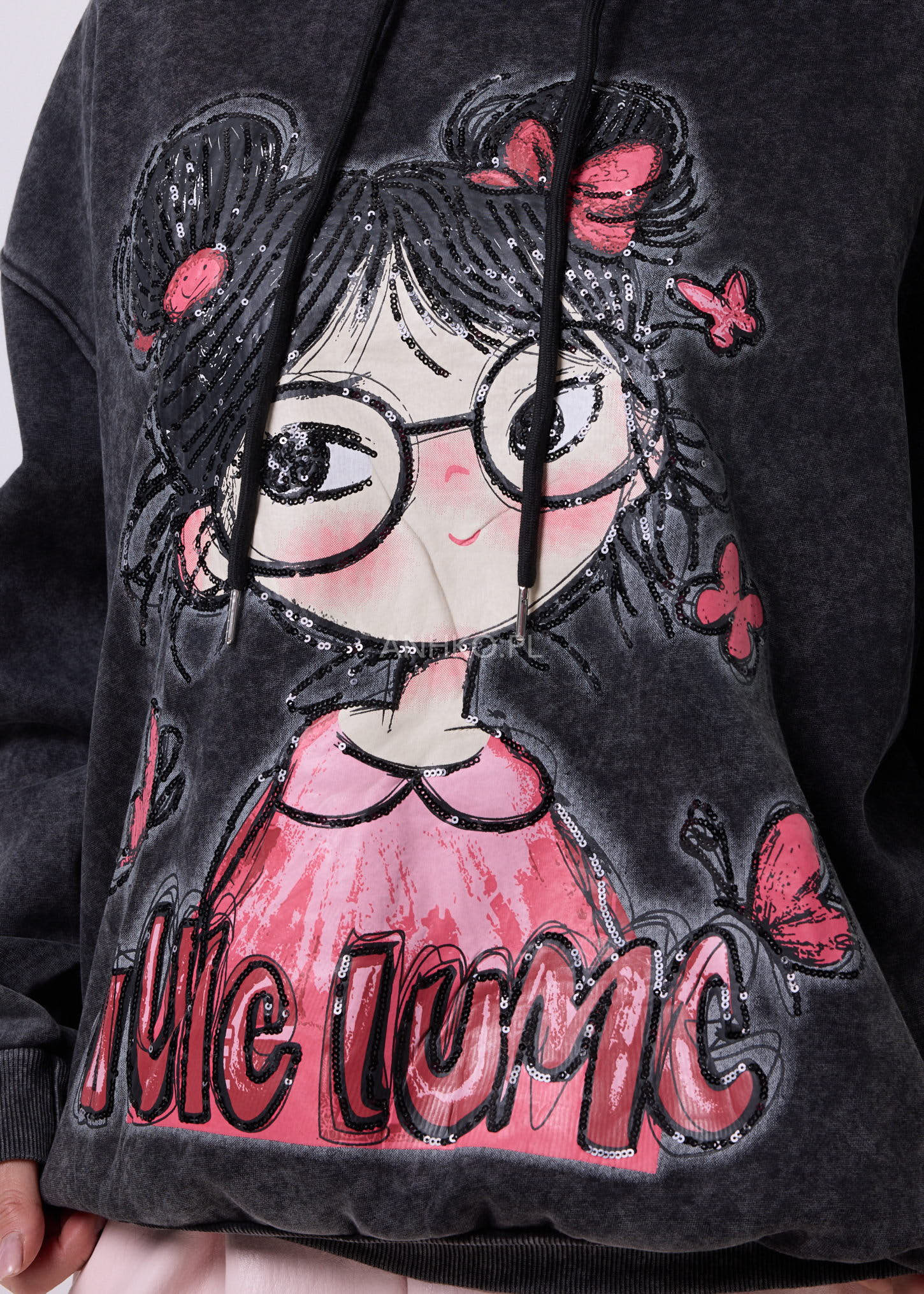 LUCY Spark Hoodie to bluza dla fanek swobodnych stylizacji z nutą zabawy. Luźny, oversize’owy krój świetnie układa się na sylwetce i daje pełen komfort noszenia. Model z kapturem i regulowanymi troczkami, wykończony ściągaczami przy rękawach i u dołu. Grafitowy kolor z modnym, spranym efektem stanowi idealne tło dla dużego nadruku z dziewczęcą ilustracją, wzbogaconego cekinami, które subtelnie się mienią. Lekko ocieplana od środka, sprawdzi się w chłodniejsze dni. Noś ją do jeansów, legginsów lub spódnicy – na luzie, po swojemu.