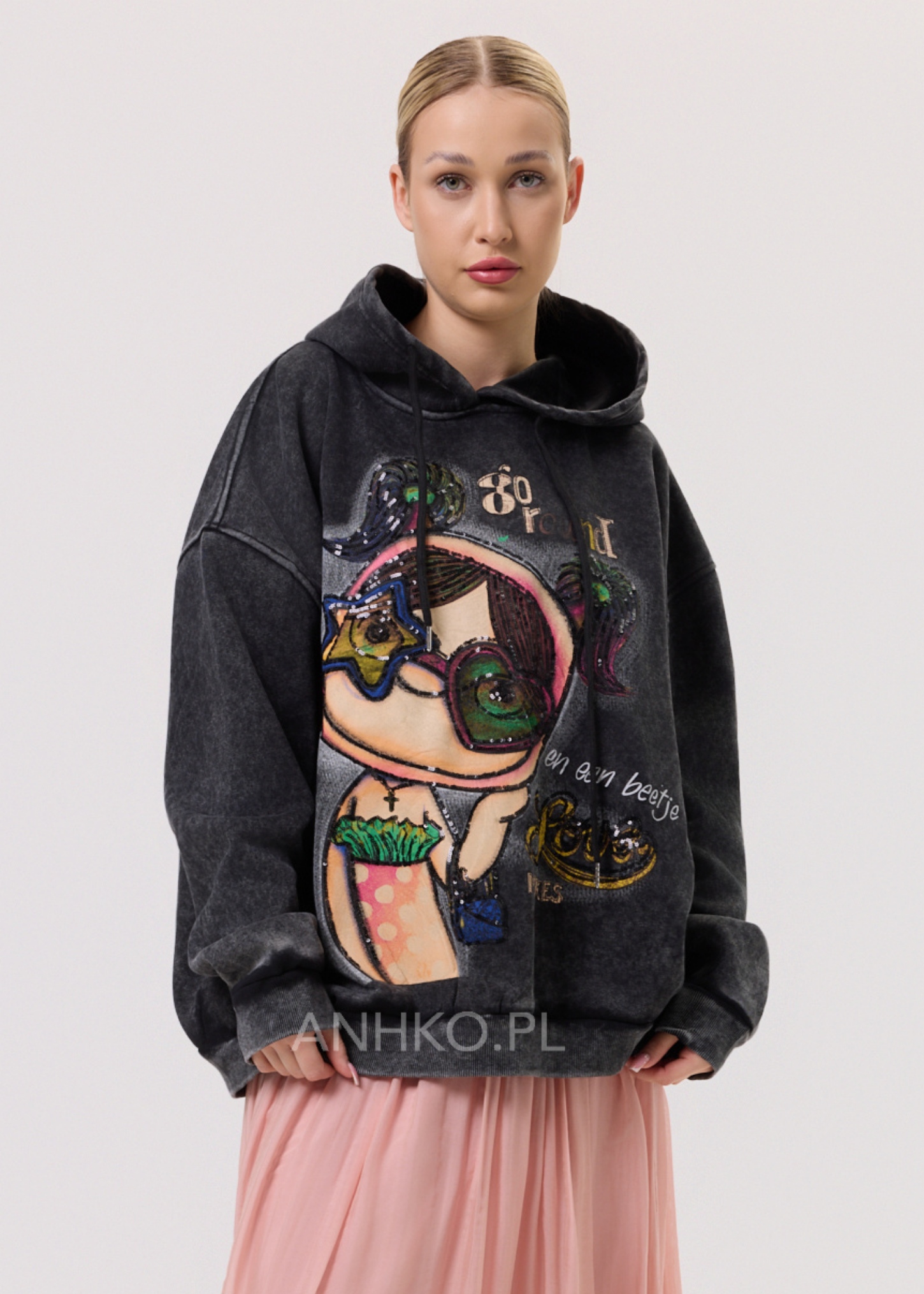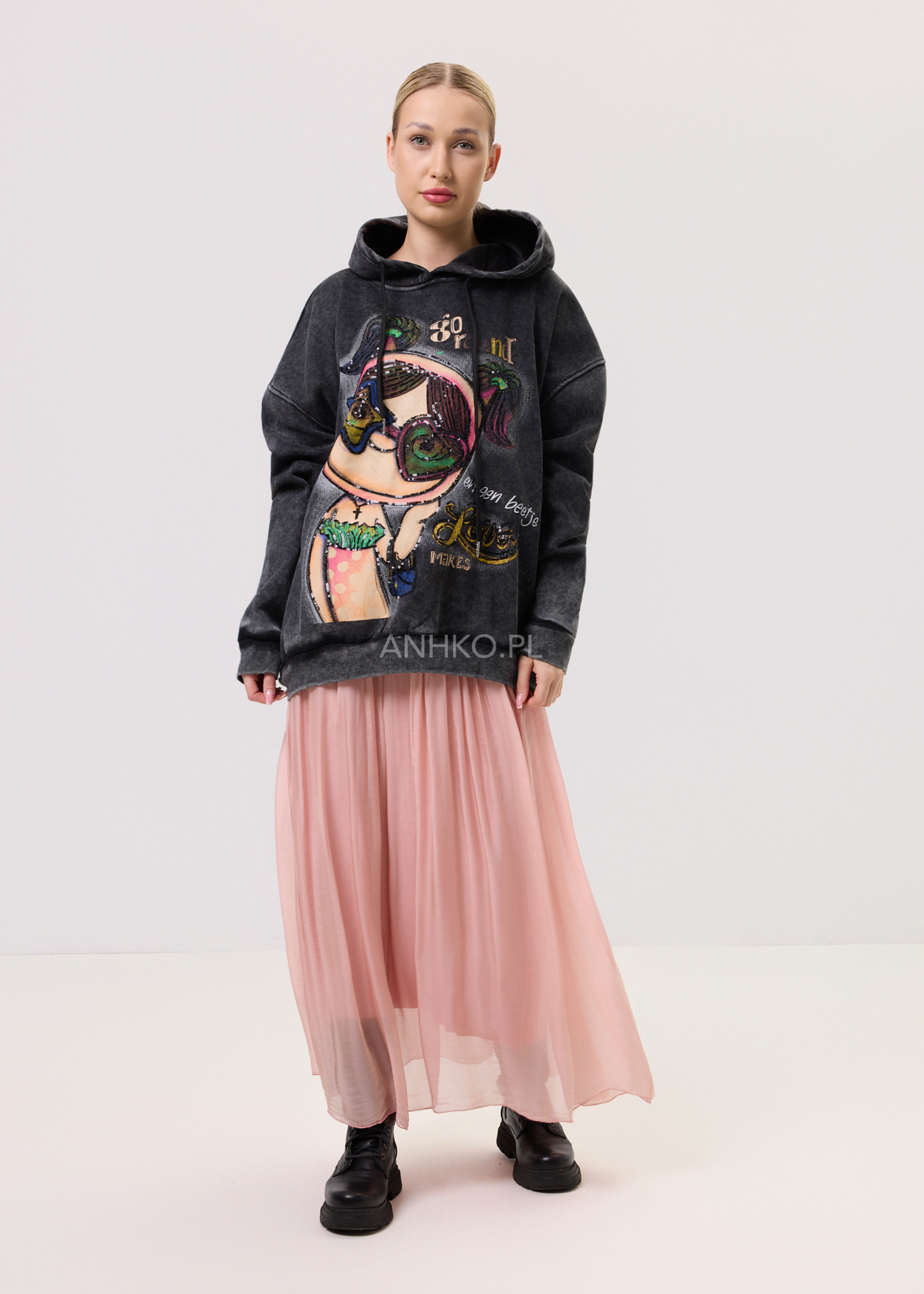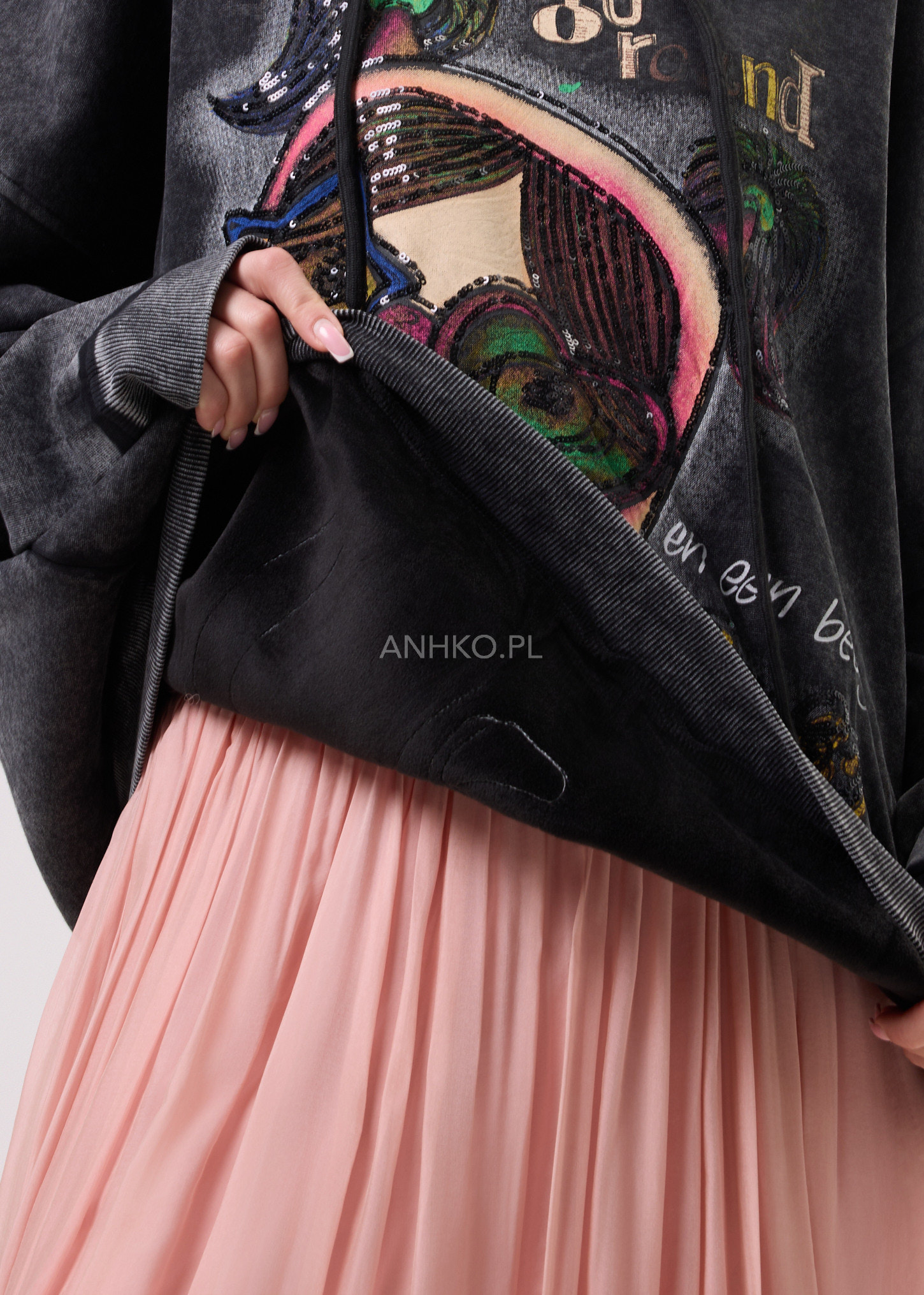 Bluzka z kapturem w stylu oversize to propozycja dla kobiet ceniących swobodę, wygodę i wyrazisty design. Model wyróżnia się dużym, artystycznym nadrukiem z dodatkiem cekinów, które subtelnie odbijają światło i nadają całości unikatowego charakteru. Luźny krój zapewnia komfort noszenia oraz świetnie układa się na sylwetce. Bluzka nie posiada kieszeni ani dodatkowej podszewki, dzięki czemu zachowuje lekkość i miękkość materiału. Wykończona jest ściągaczami przy rękawach i dole. Doskonale sprawdzi się w codziennych stylizacjach – do jeansów, legginsów czy spodni materiałowych. Idealna na co dzień, spotkania ze znajomymi, spacery czy casualowe wyjścia.
