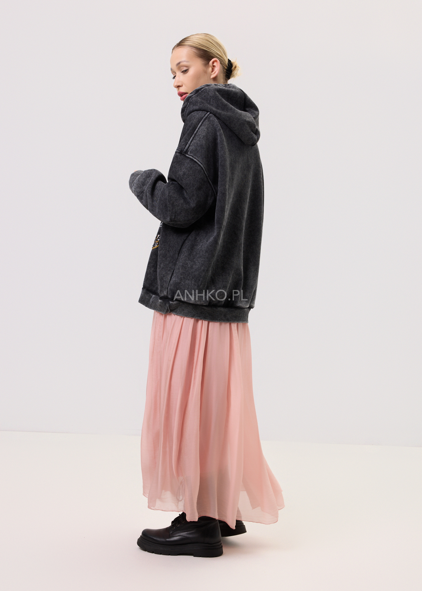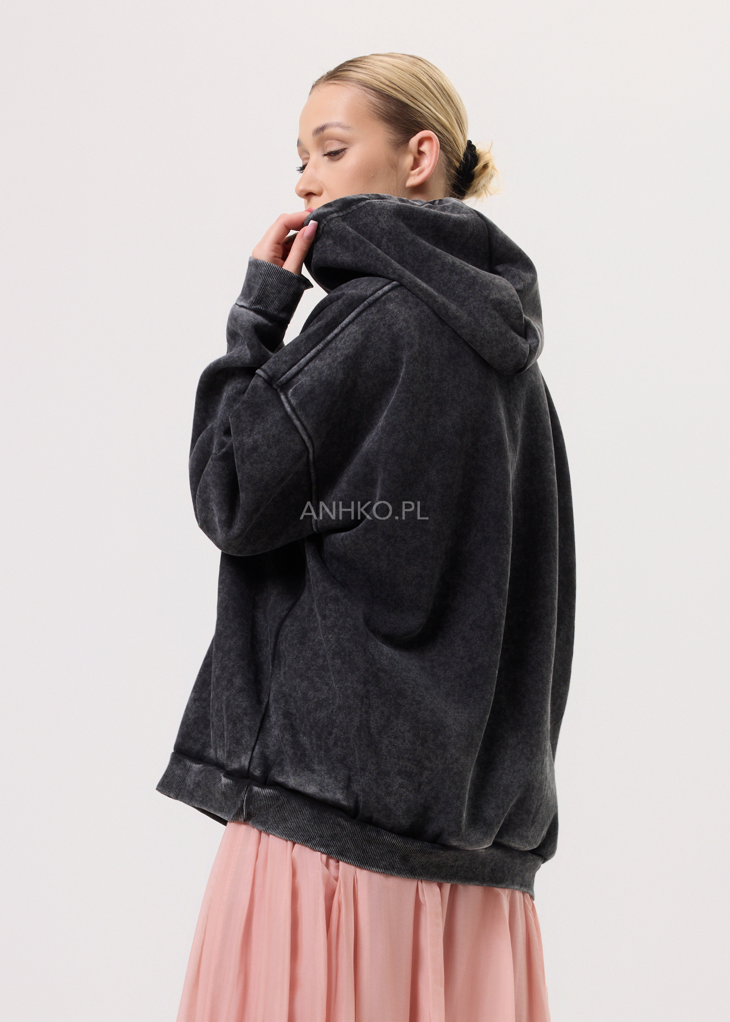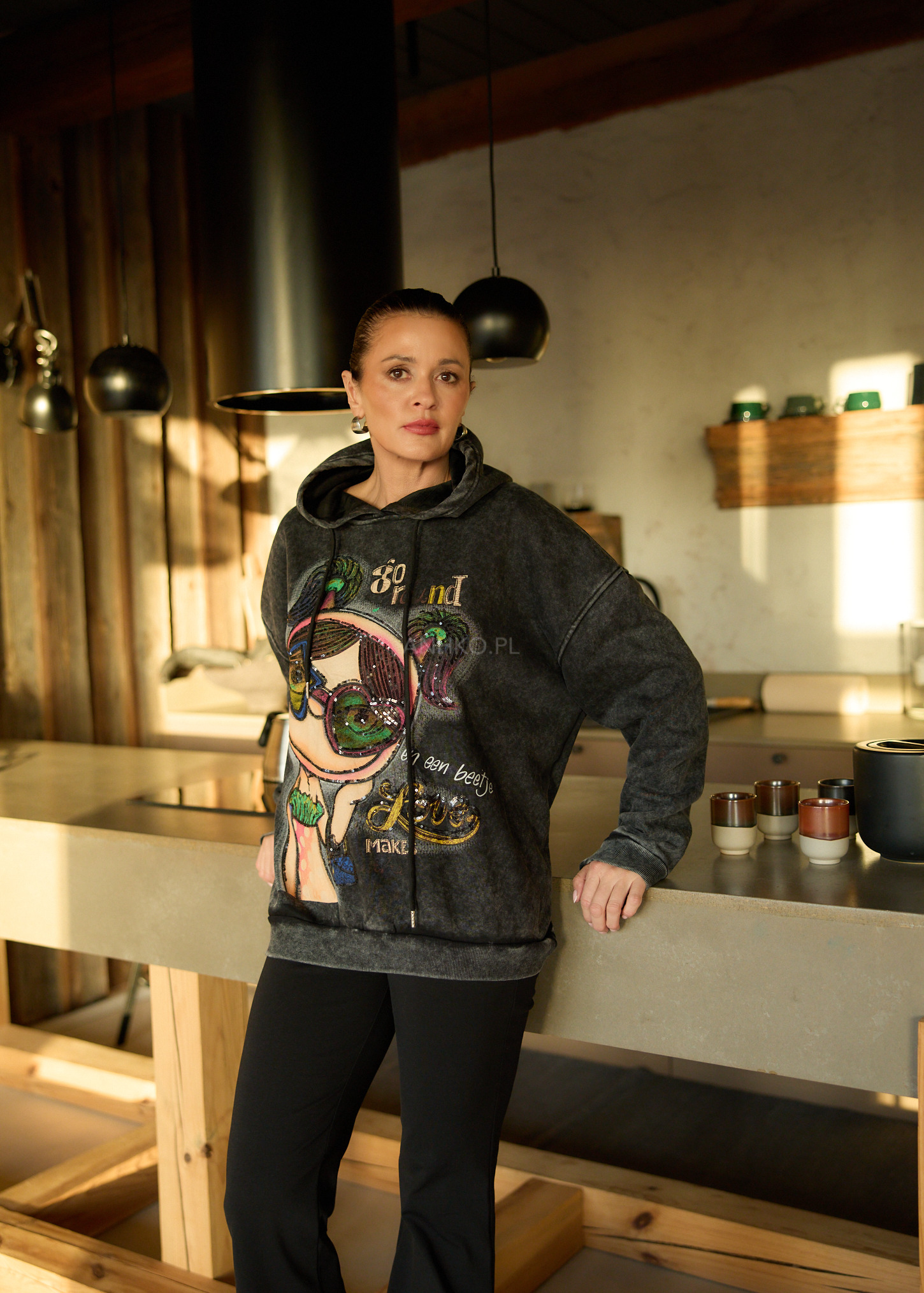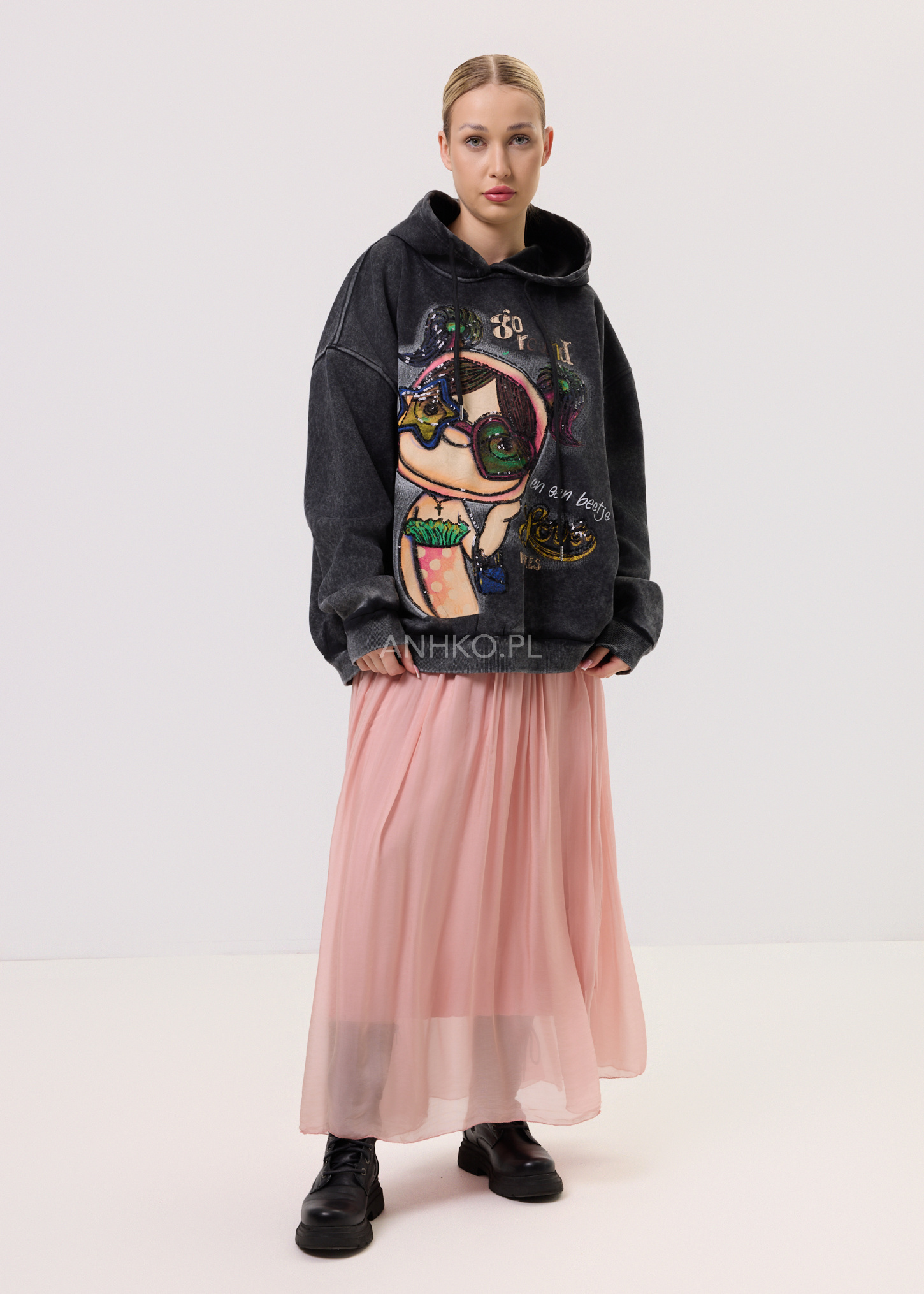 Bluzka z kapturem w stylu oversize to propozycja dla kobiet ceniących swobodę, wygodę i wyrazisty design. Model wyróżnia się dużym, artystycznym nadrukiem z dodatkiem cekinów, które subtelnie odbijają światło i nadają całości unikatowego charakteru. Luźny krój zapewnia komfort noszenia oraz świetnie układa się na sylwetce. Bluzka nie posiada kieszeni ani dodatkowej podszewki, dzięki czemu zachowuje lekkość i miękkość materiału. Wykończona jest ściągaczami przy rękawach i dole. Doskonale sprawdzi się w codziennych stylizacjach – do jeansów, legginsów czy spodni materiałowych. Idealna na co dzień, spotkania ze znajomymi, spacery czy casualowe wyjścia.
