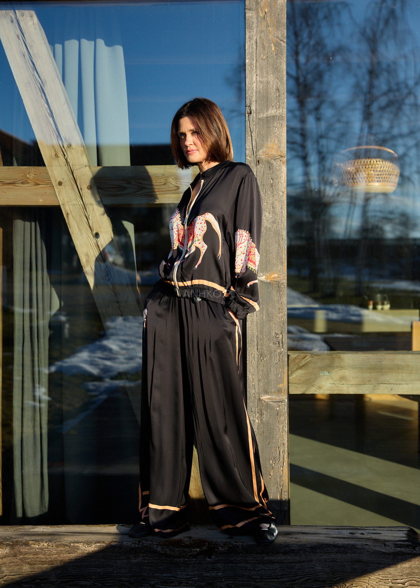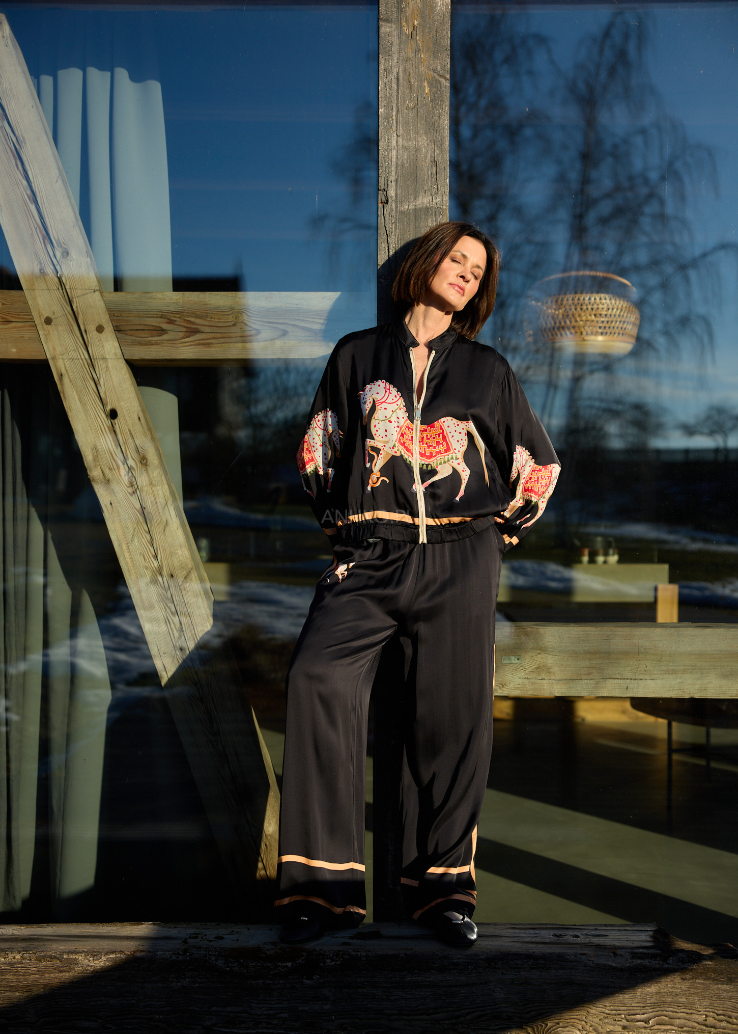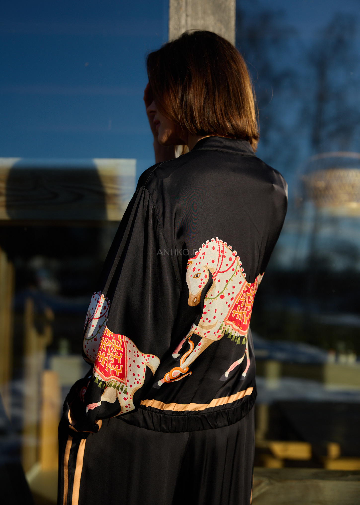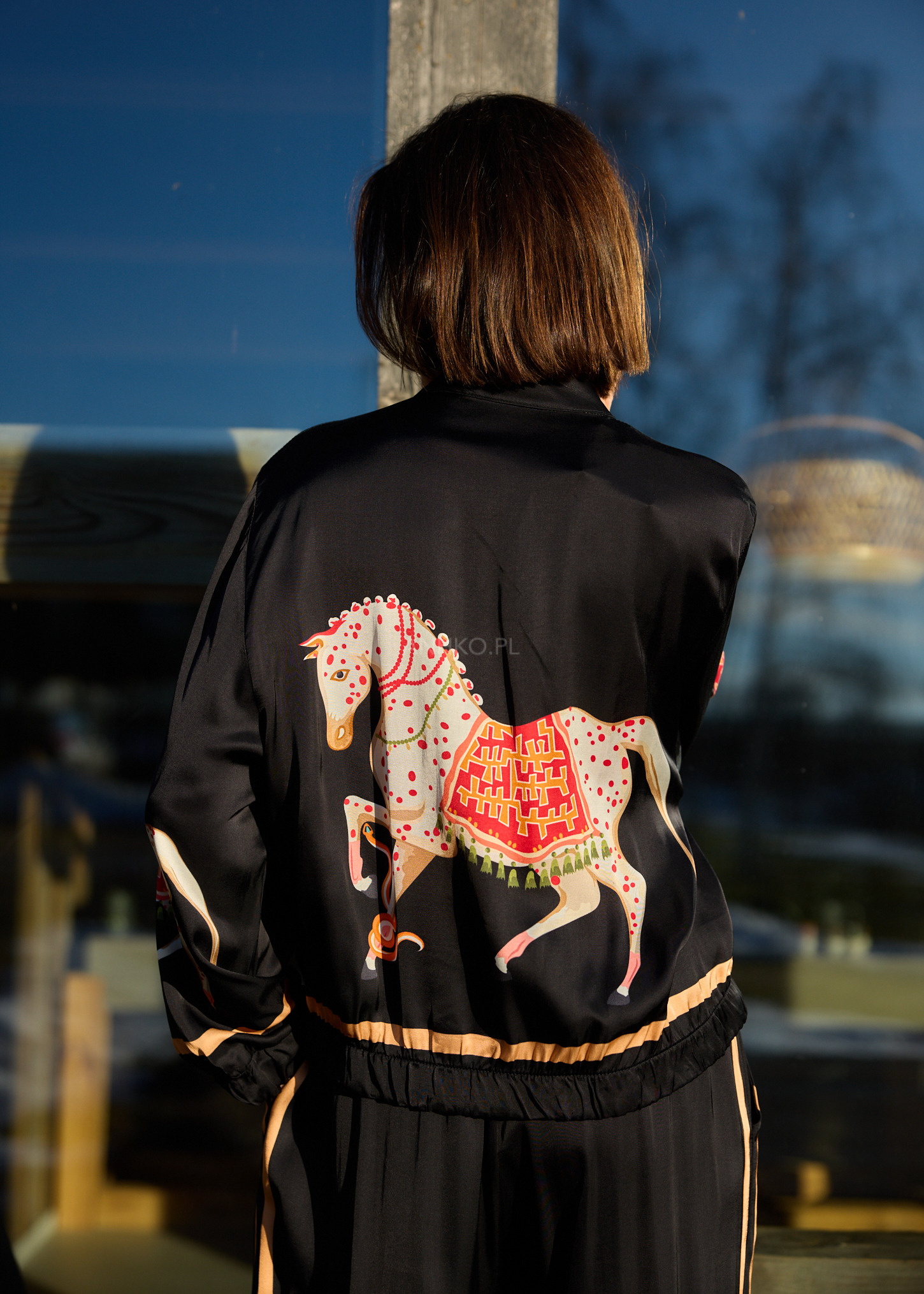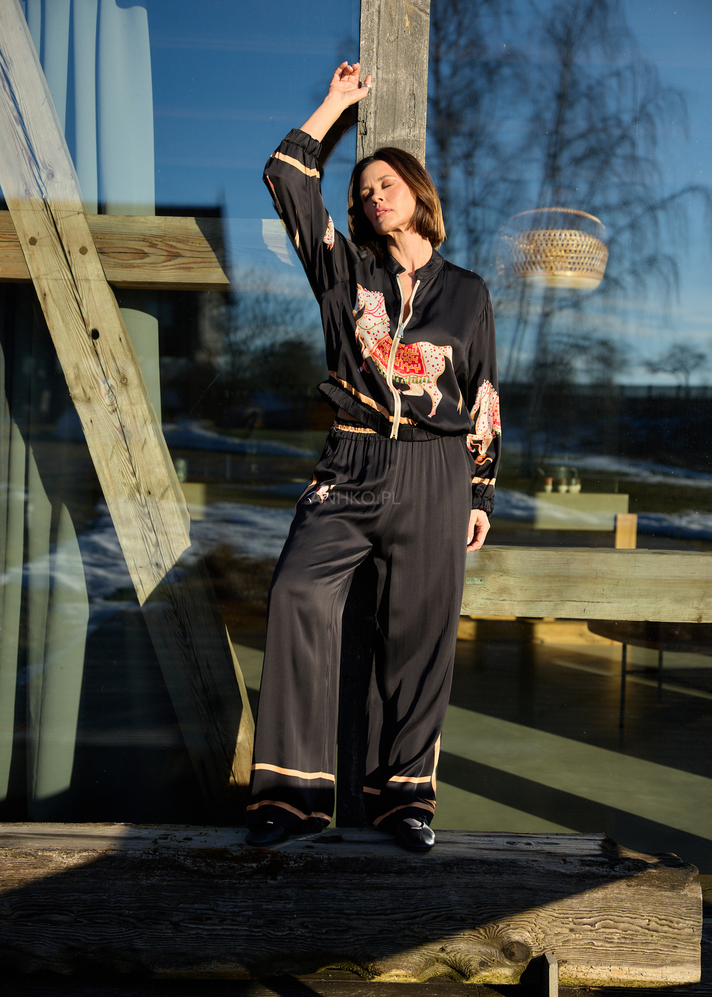 Spodnie Cardiff Czarne - Luźne, szerokie spodnie w kolorze czarnym z subtelnym haftem konia. Wyjątkowo miękkie dzięki mieszance wiskozy i jedwabiu. Komfort i elegancja w jednym.