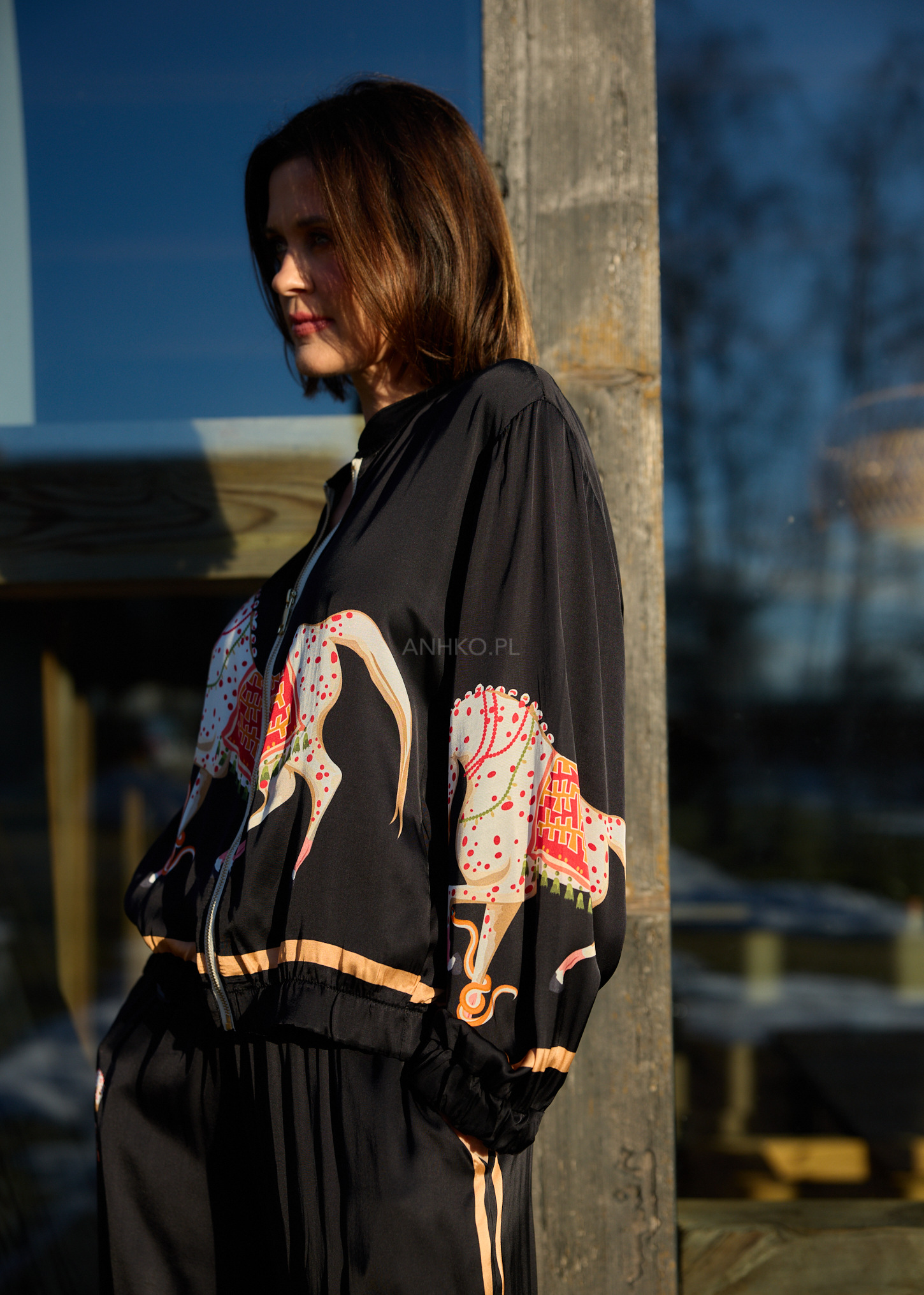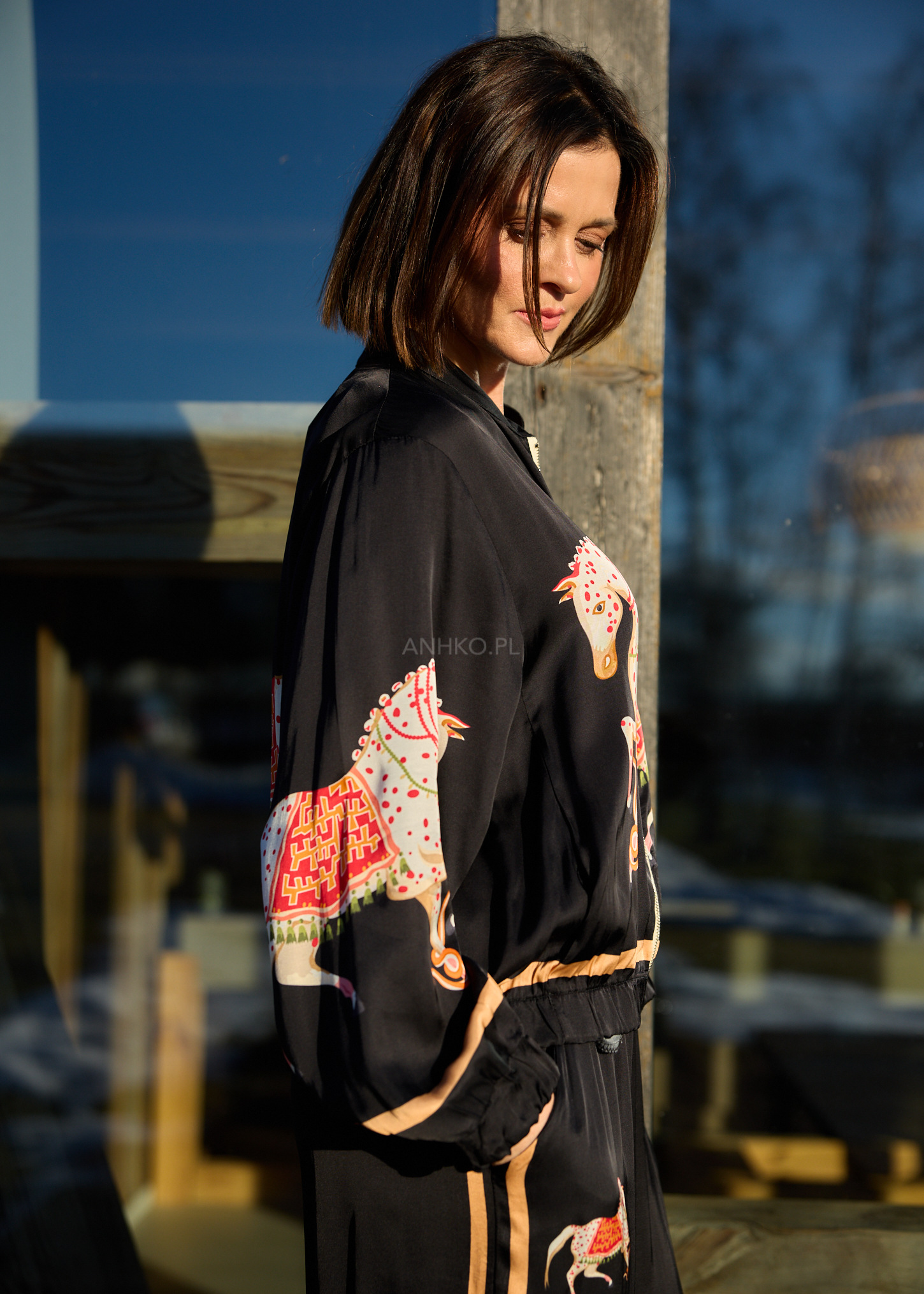 Ta bluza z nadrukiem przyciąga uwagę już od pierwszego spojrzenia. Luźny fason inspirowany bomberką miękko układa się na sylwetce, dając efekt swobody bez utraty formy. Kontrastowy print konia nadaje całości charakteru, a złoty zamek subtelnie podkreśla modowy, dopracowany detal.