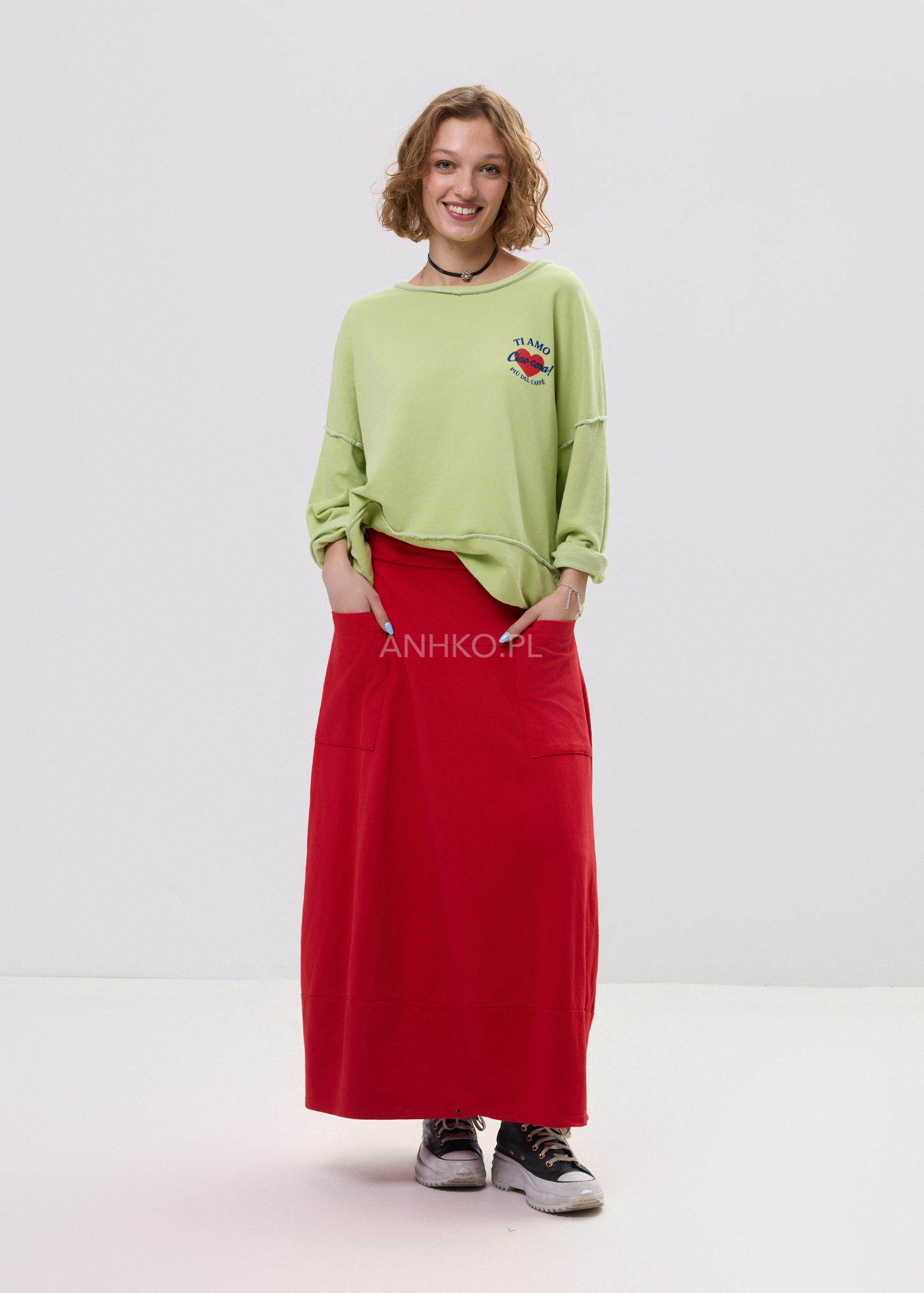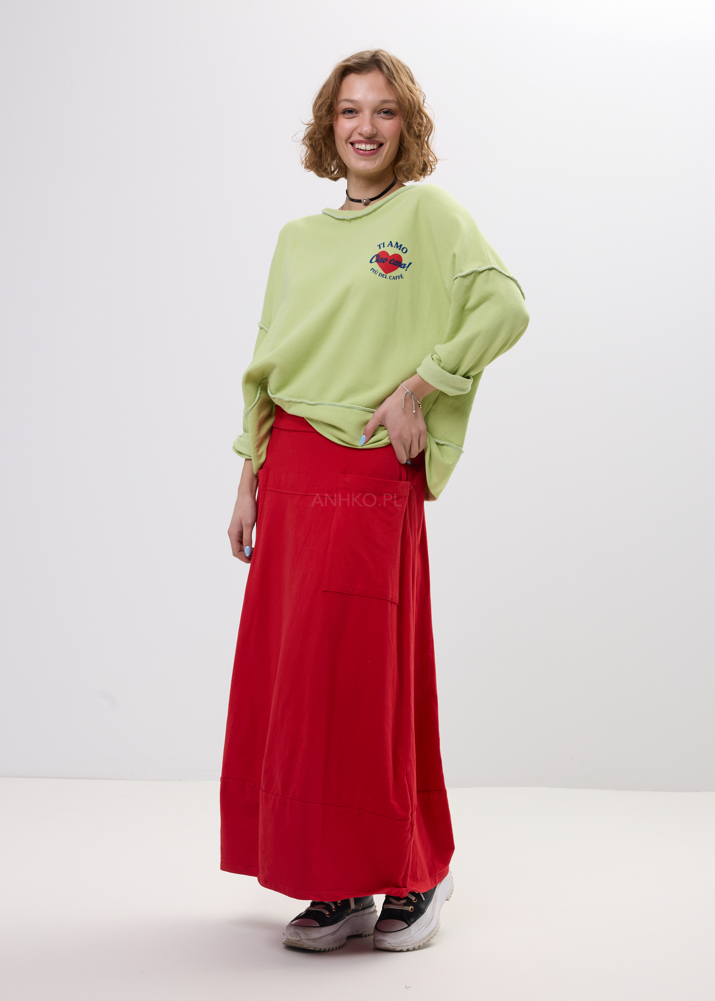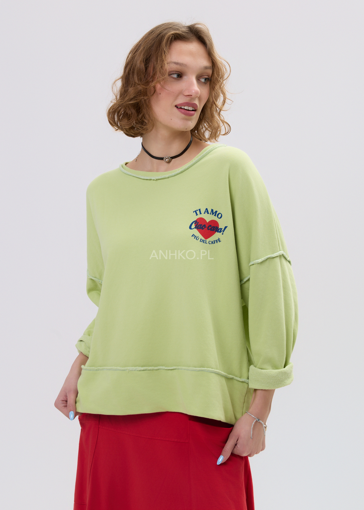 Ta bluza damska bez kaptura w intensywnym limonkowym kolorze od razu przyciąga uwagę i dodaje stylizacji świeżości. Oversize’owy fason miękko układa się na sylwetce, zapewniając komfort oraz swobodę ruchów. Charakterystyczny nadruk „TI AMO Ciao Cara!” z czerwonym sercem nadaje całości lekko artystycznego, włoskiego klimatu.