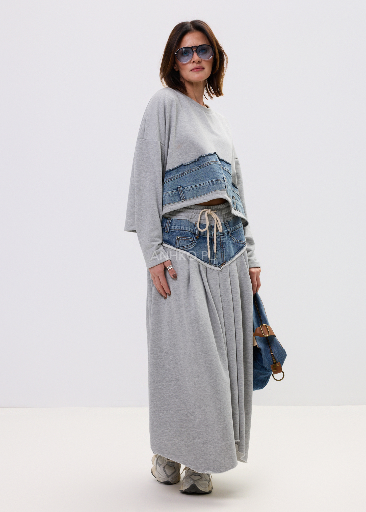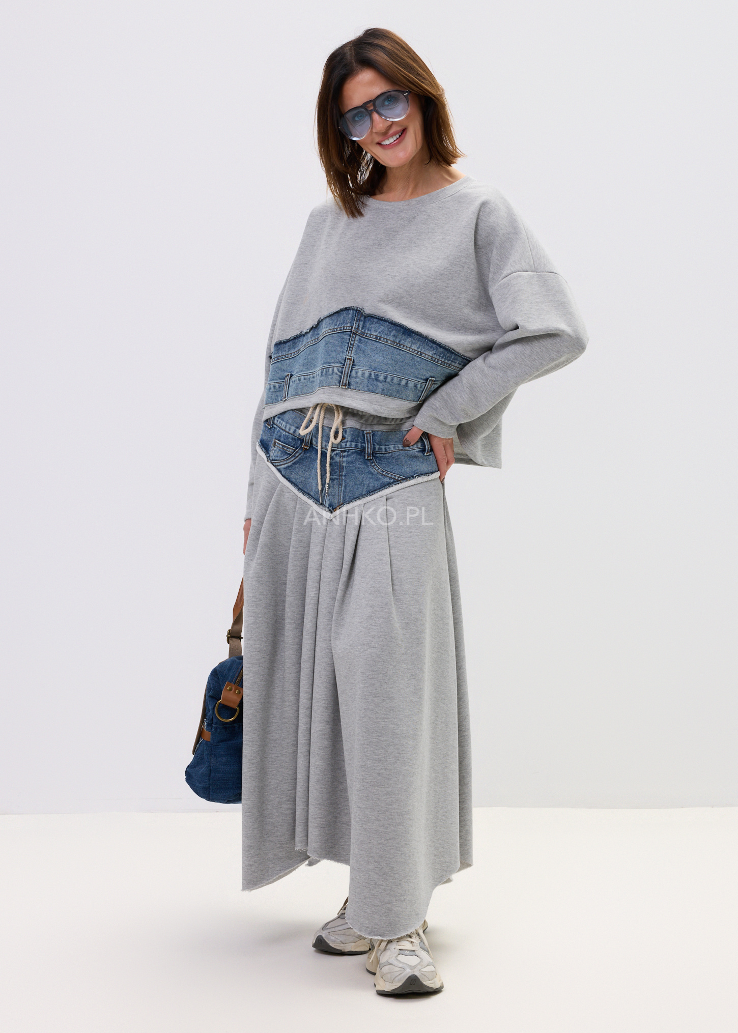 Spódnica Denim Wave Szara - Nietuzinkowa spódnica midi, która łączy komfort dresowej dzianiny z modowym akcentem denimu. Luźny fason, elastyczny pas i charakterystyczna jeansowa wstawka tworzą stylowy, streetwearowy look idealny na co dzień.