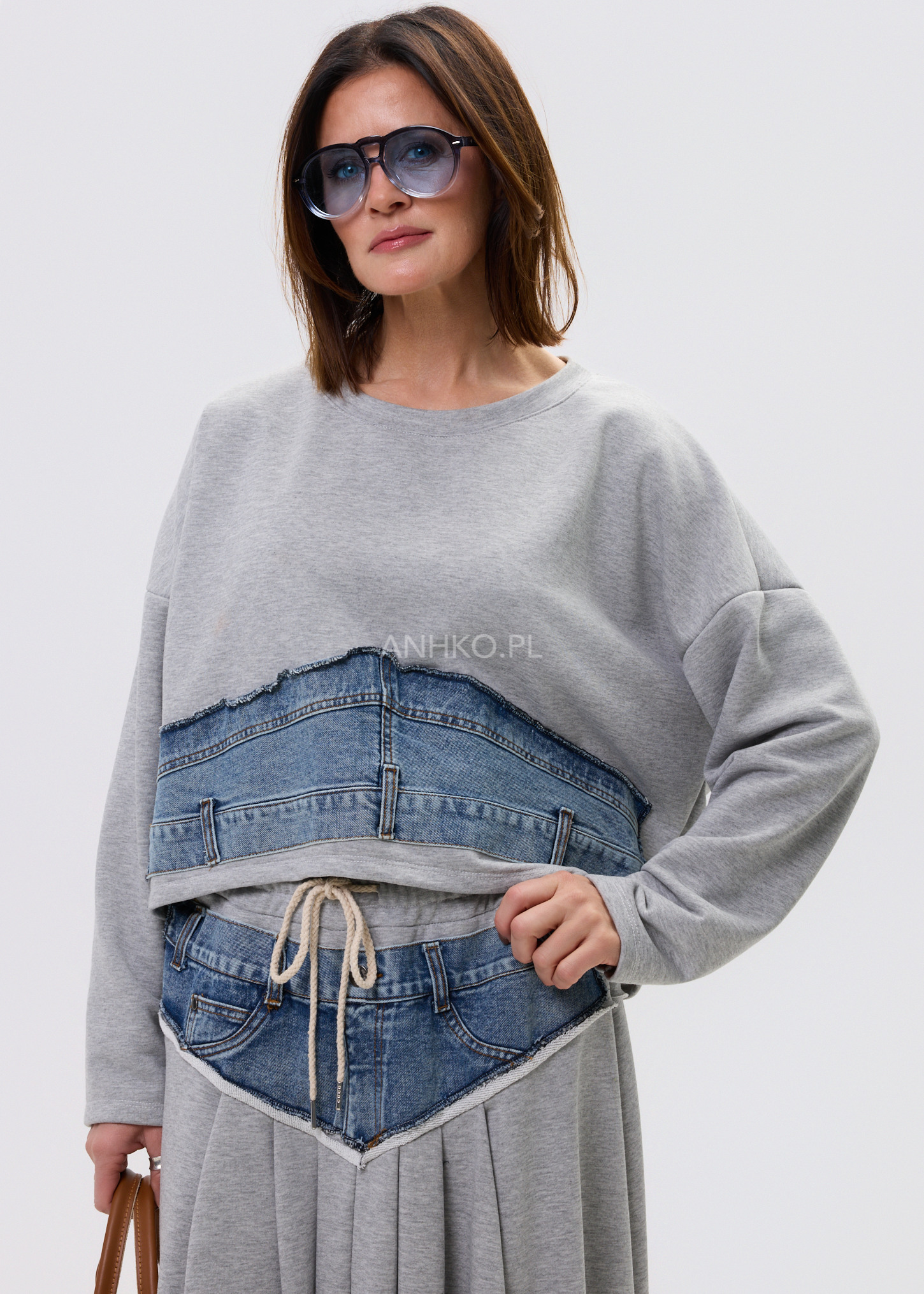 Ta bluza oversize w jasnym szarym melanżu przyciąga uwagę efektowną wstawką z denimu na froncie. Luźny fason z lekko opuszczoną linią ramion sprawia, że model swobodnie układa się na sylwetce, tworząc nowoczesny, miejski look. Kontrastowa aplikacja nadaje całości charakteru i sprawia, że nawet prosta stylizacja zyskuje modowy twist.