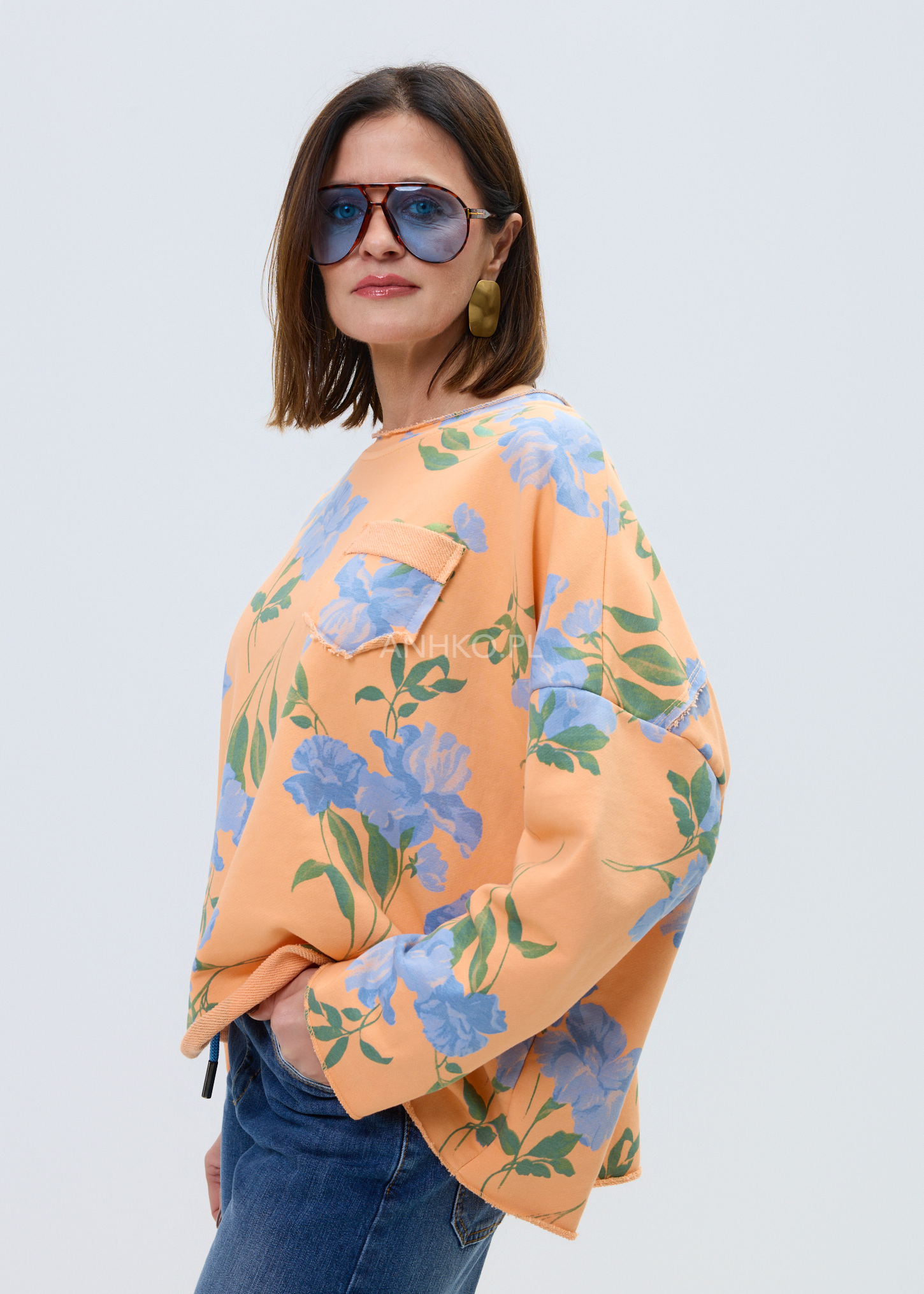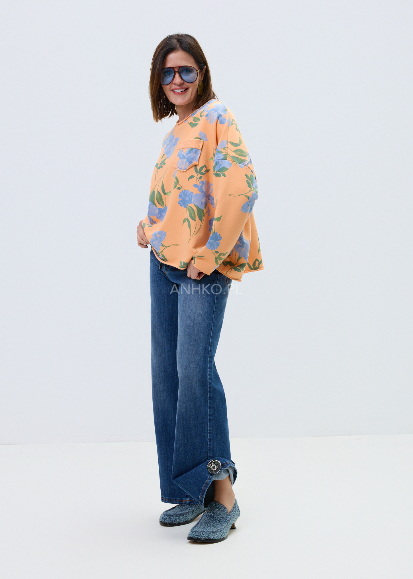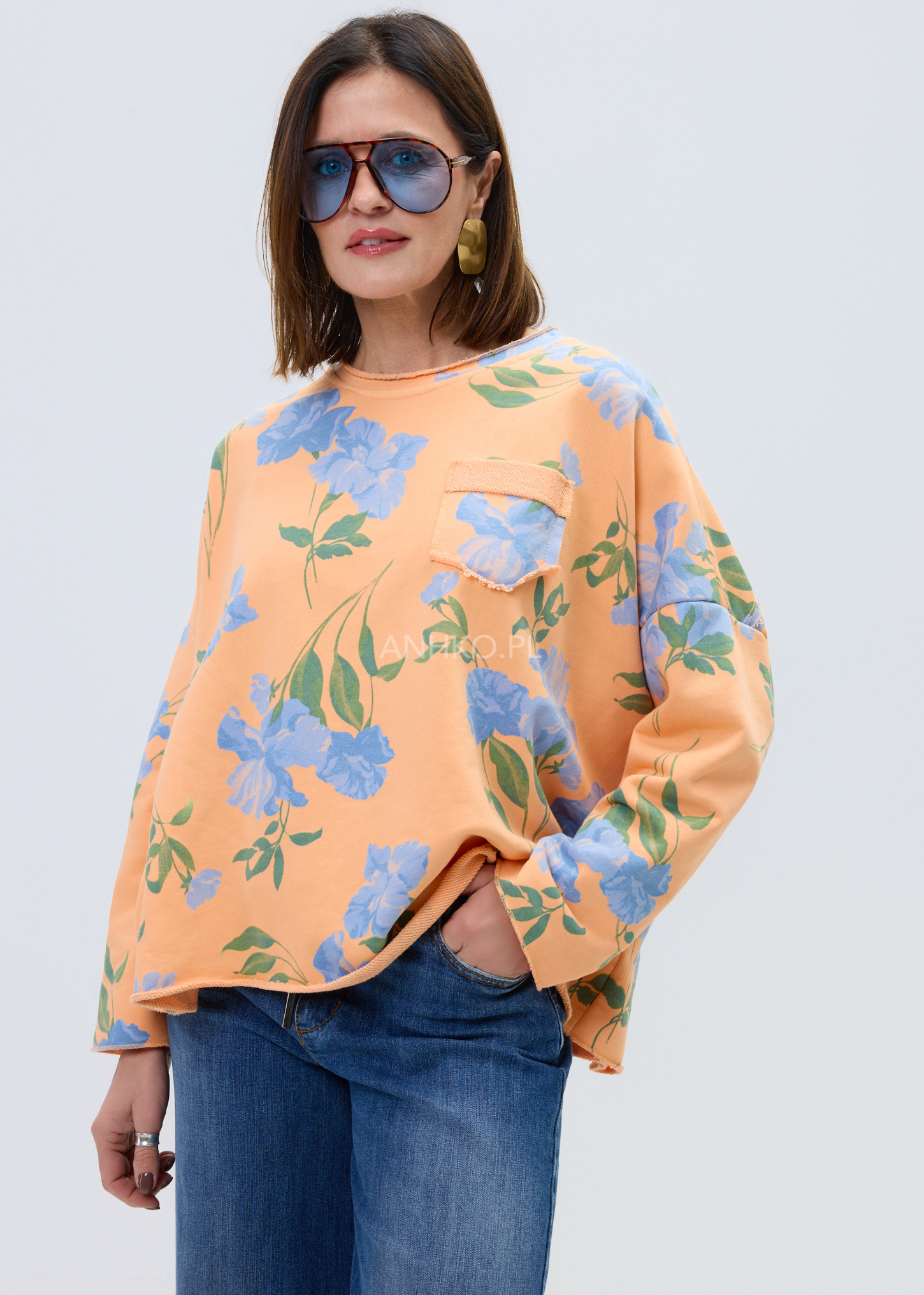Ta bluza damska oversize w odcieniu delikatnej pomarańczowa przyciąga wzrok dużym, niebieskim motywem kwiatowym, który nadaje stylizacji świeżości i modowego charakteru. Luźny fason sprawia, że materiał swobodnie układa się na sylwetce, zapewniając wygodę oraz lekkość w codziennych zestawach. To model, który świetnie odnajduje się w miejskim stylu – zarówno w prostych, jak i bardziej wyrazistych stylizacjach.