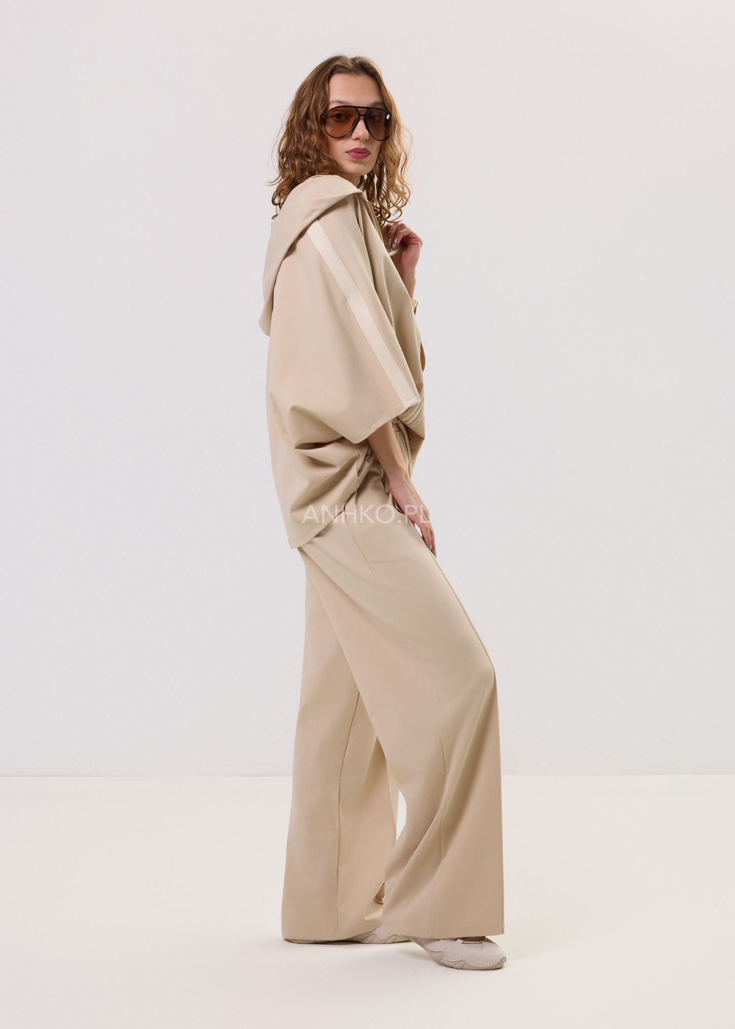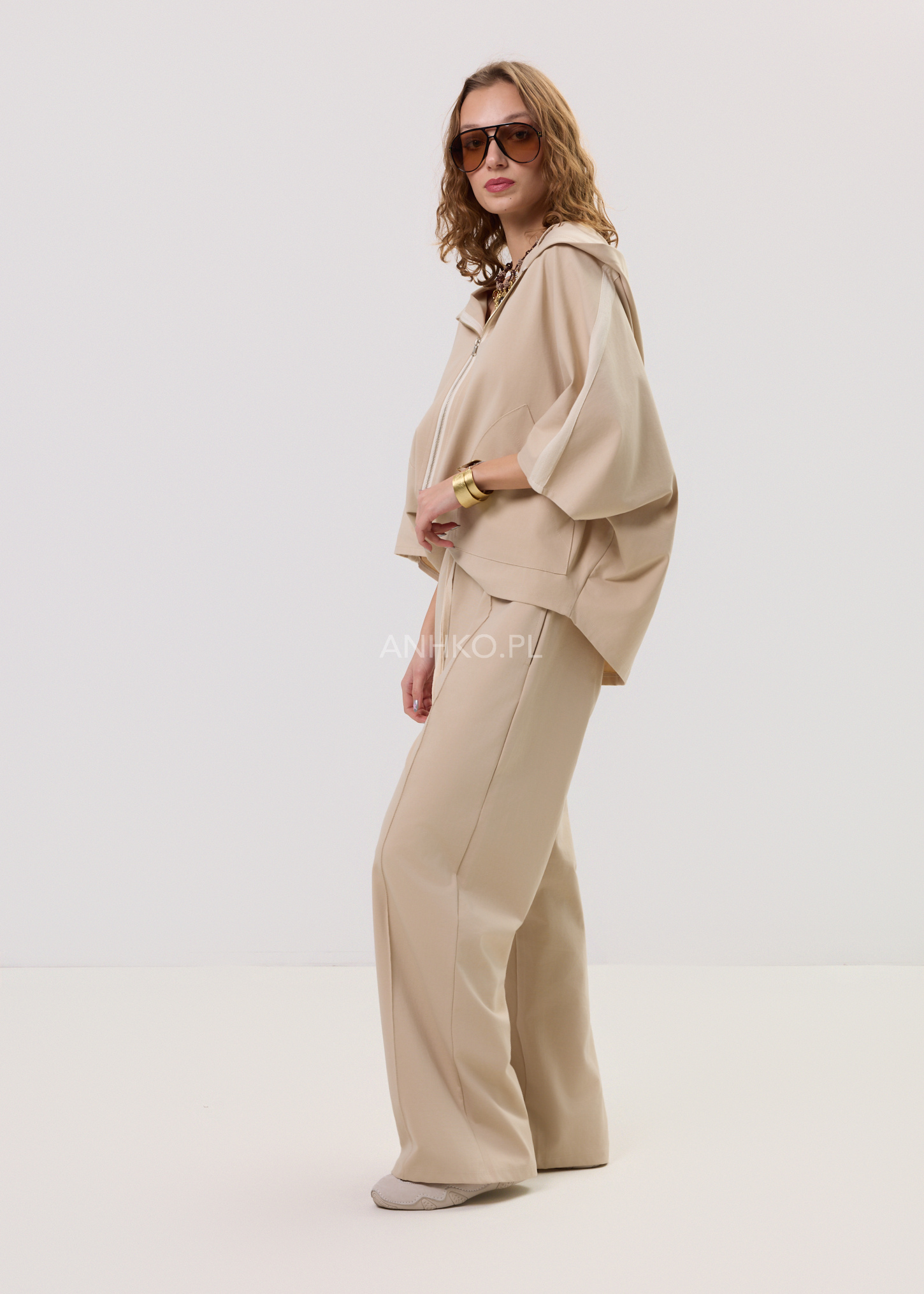 Spodnie Dresowe Hollan Beżowe - Beżowe spodnie damskie o luźnym, eleganckim kroju z elastyczną talią i troczkiem. Minimalistyczne, wygodne i idealne do codziennych oraz bardziej stylowych zestawów.