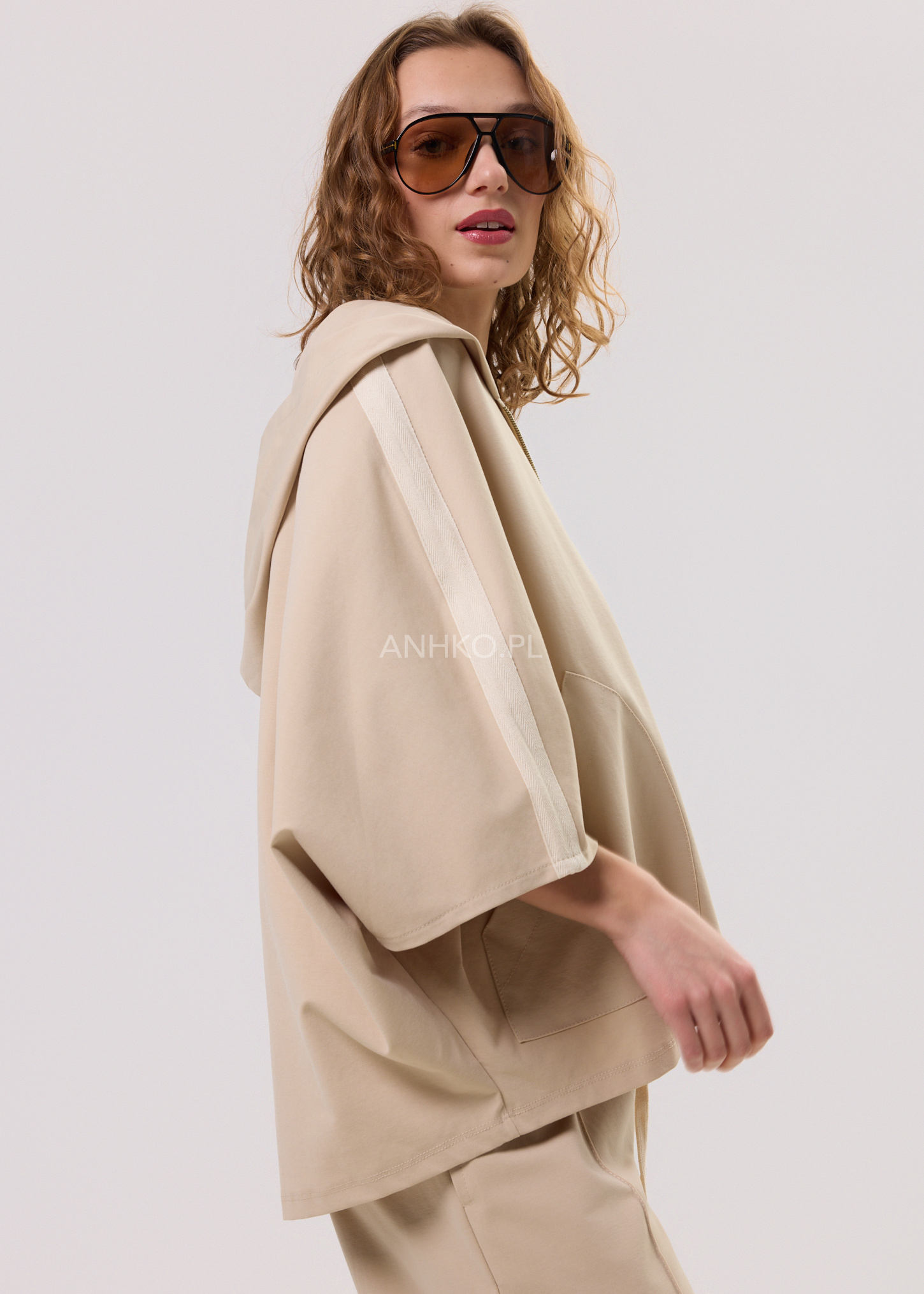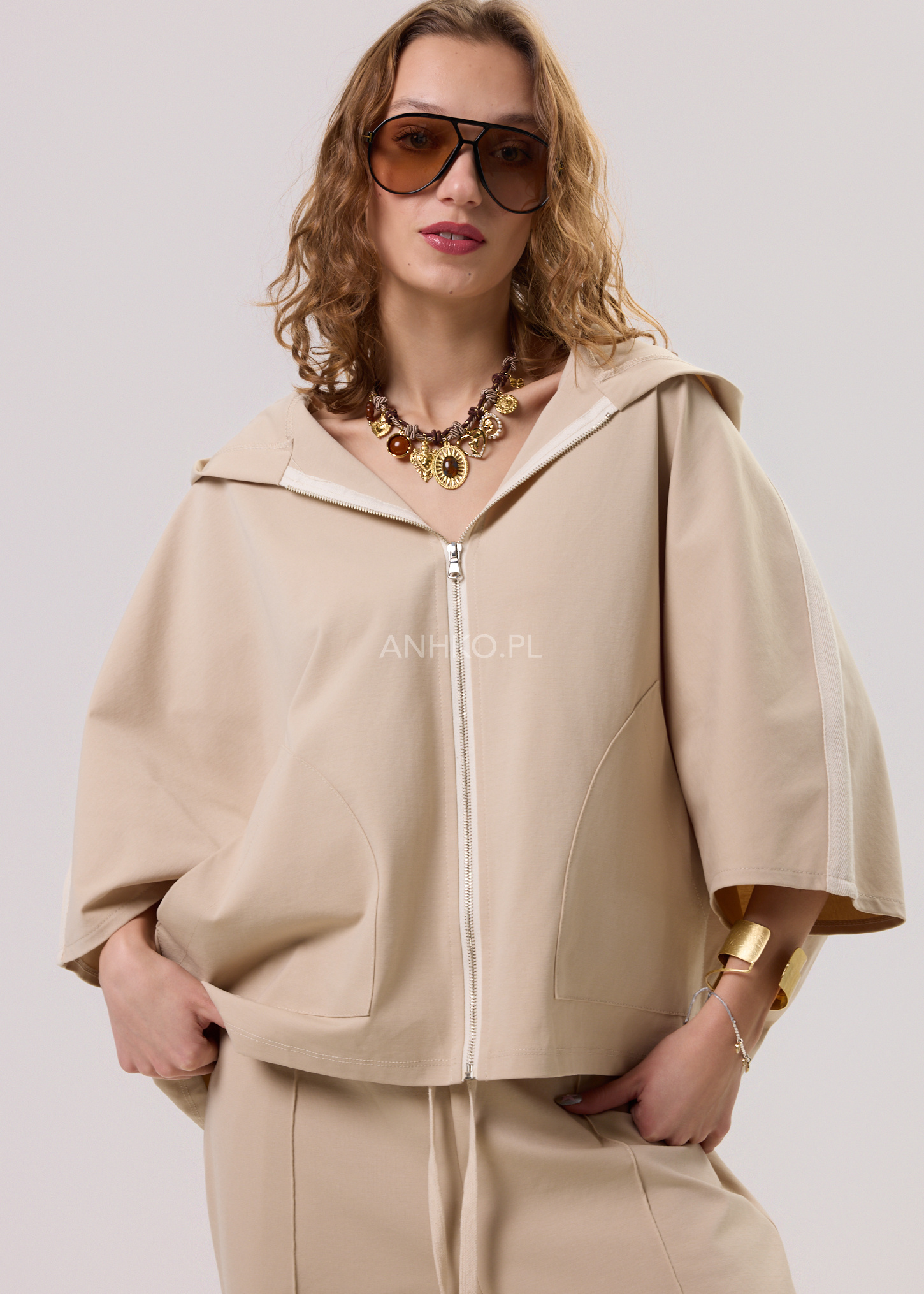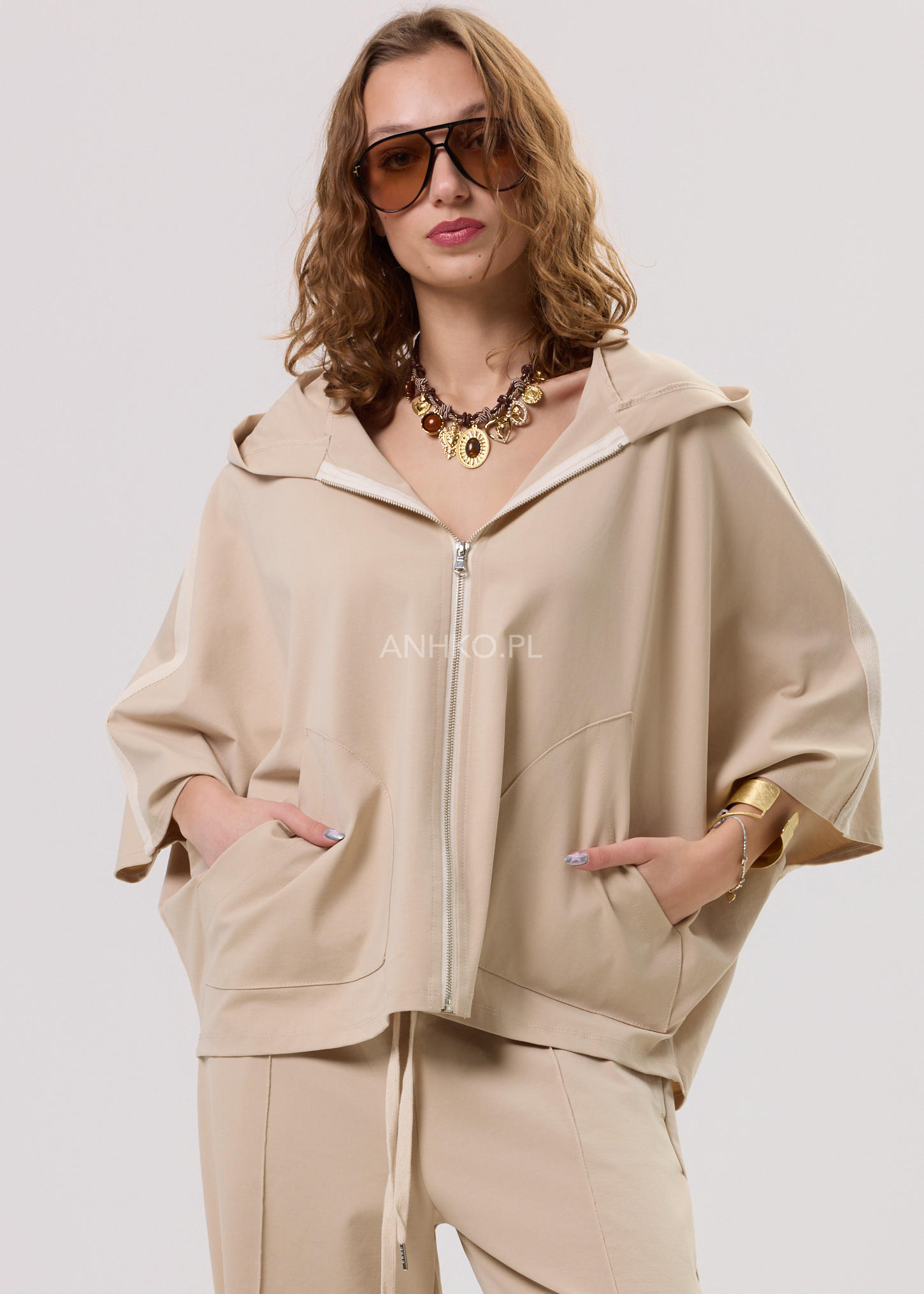 Ta rozpinana bluza z kapturem zachwyca swobodnym fasonem, który miękko układa się na sylwetce, tworząc efekt nonszalanckiego oversize. Delikatnie opadające ramiona i skrócona długość nadają jej nowoczesnego charakteru, a kontrastowe wstawki wzdłuż rękawów optycznie wysmuklają całość.