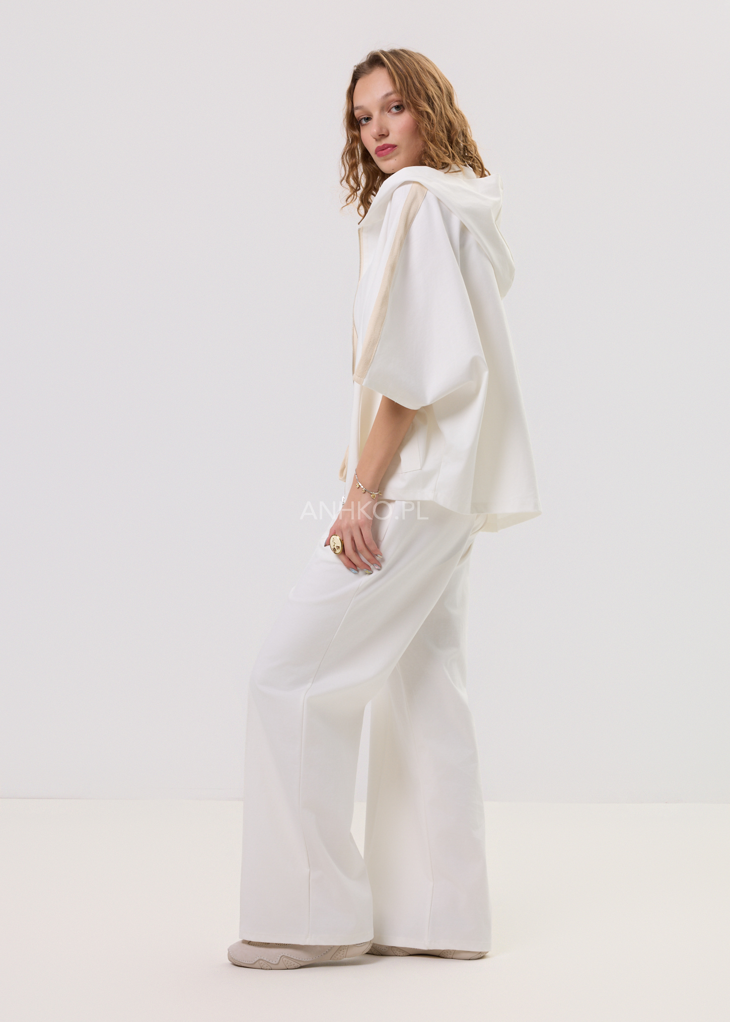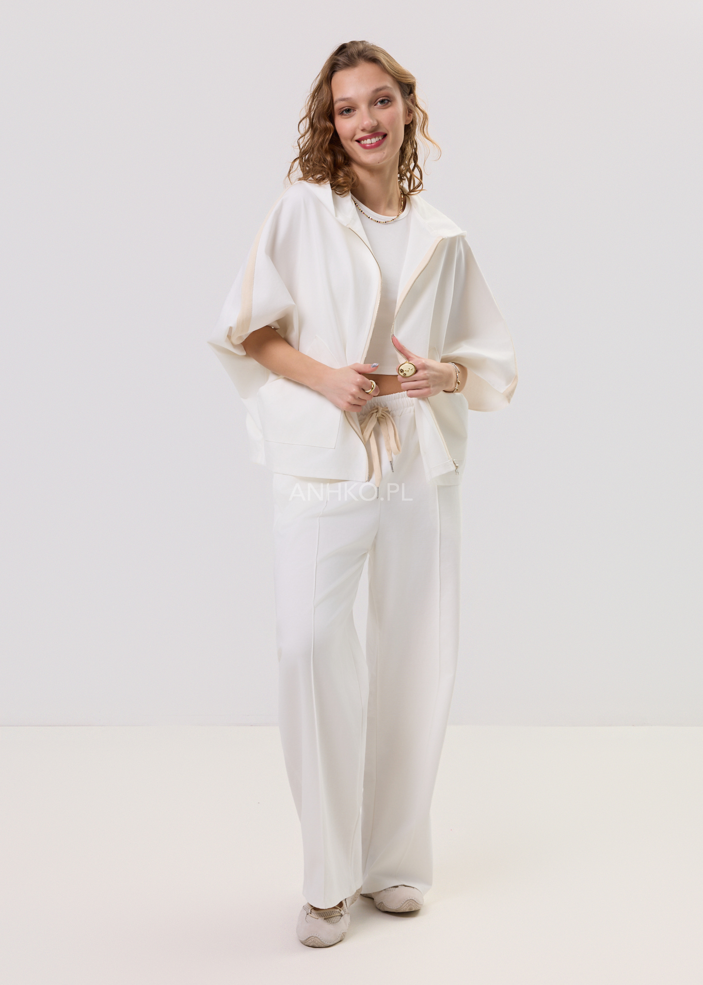 Spodnie Dresowe Hollan Białe - Białe spodnie damskie o luźnym, eleganckim kroju z elastyczną talią i troczkiem. Minimalistyczne, wygodne i idealne do codziennych oraz bardziej stylowych zestawów.