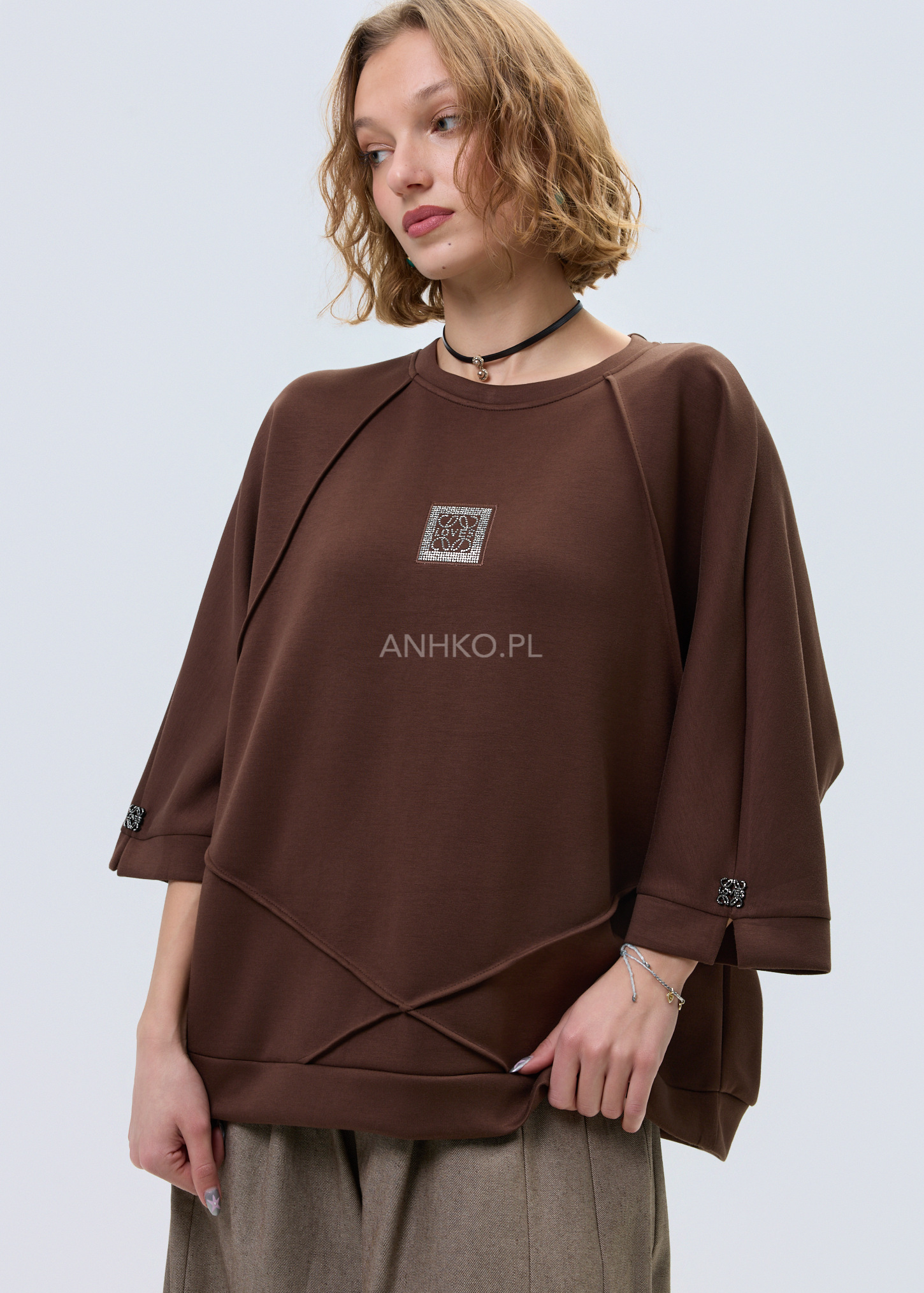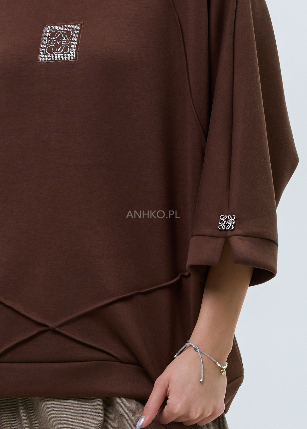 - Aplikacja z kryształków: Subtelna dekoracja na przodzie przyciąga wzrok i dodaje bluzie eleganckiego akcentu.
