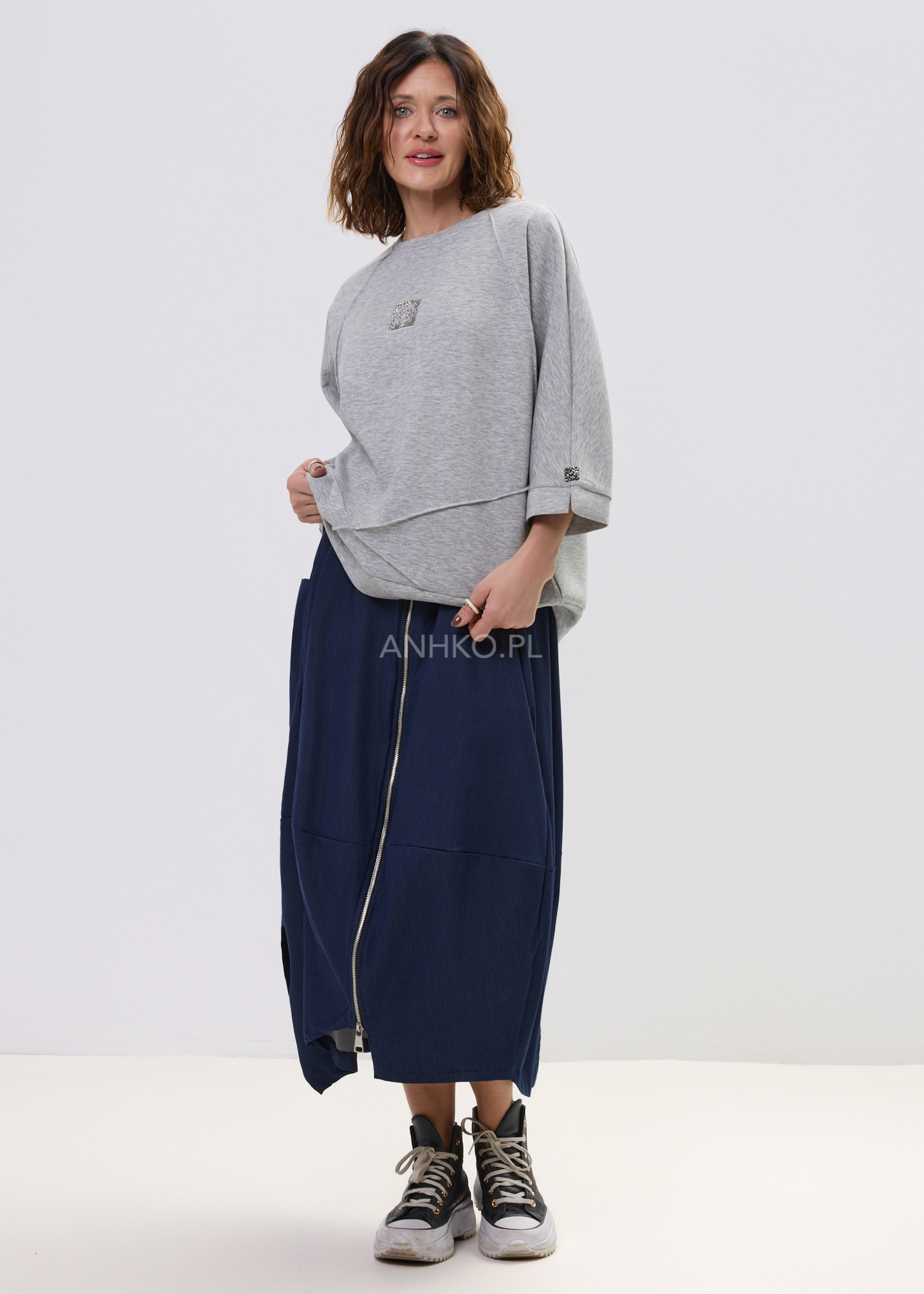 Spódnica Zallan Granatowa z Zamkiem - Granatowa spódnica midi o luźnym, nowoczesnym kroju z efektownym zamkiem na całej długości. Elastyczna talia zapewnia wygodę, a minimalistyczny design sprawia, że łatwo dopasujesz ją zarówno do sportowych, jak i bardziej eleganckich stylizacji.