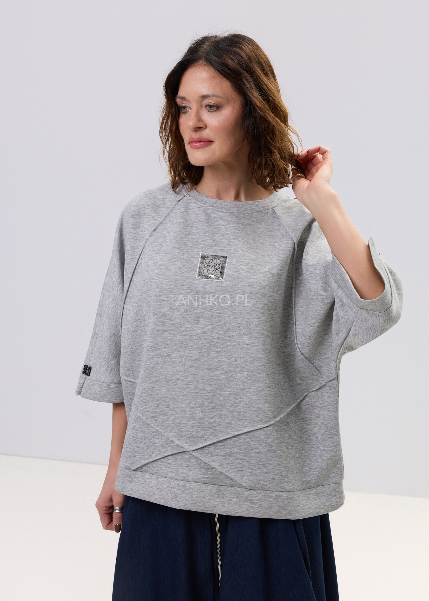 Ta bluza damska w odcieniu szarego melanżu łączy komfort codziennego noszenia z subtelnym, dekoracyjnym detalem. Luźny, swobodny fason miękko układa się na sylwetce, zapewniając wygodę i lekkość stylizacji. Na środku znajduje się niewielka aplikacja z kryształków, która delikatnie odbija światło i dodaje całości modowego charakteru.