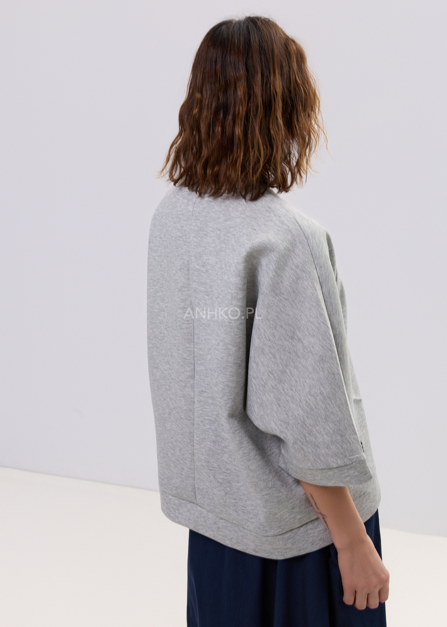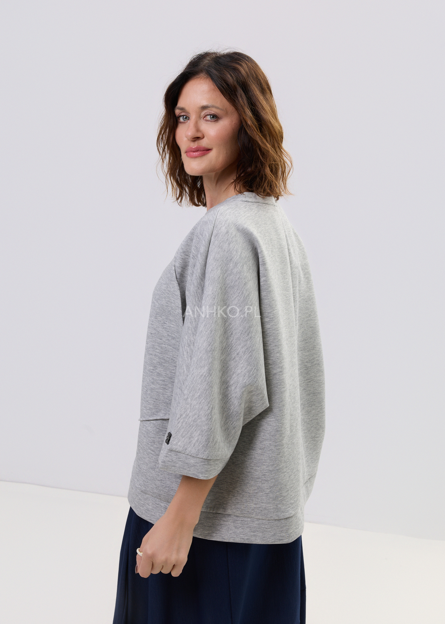 Model posiada klasyczny okrągły dekolt oraz rękawy o długości 3/4, które nadają sylwetce nowoczesnej proporcji. Dodatkowe kryształkowe detale przy mankietach subtelnie podkreślają styl bluzy i sprawiają, że nawet prosta stylizacja nabiera wyrazistości. Melanżowa struktura materiału nadaje jej casualowego charakteru i sprawia, że świetnie komponuje się zarówno ze spodniami, jak i spódnicą.