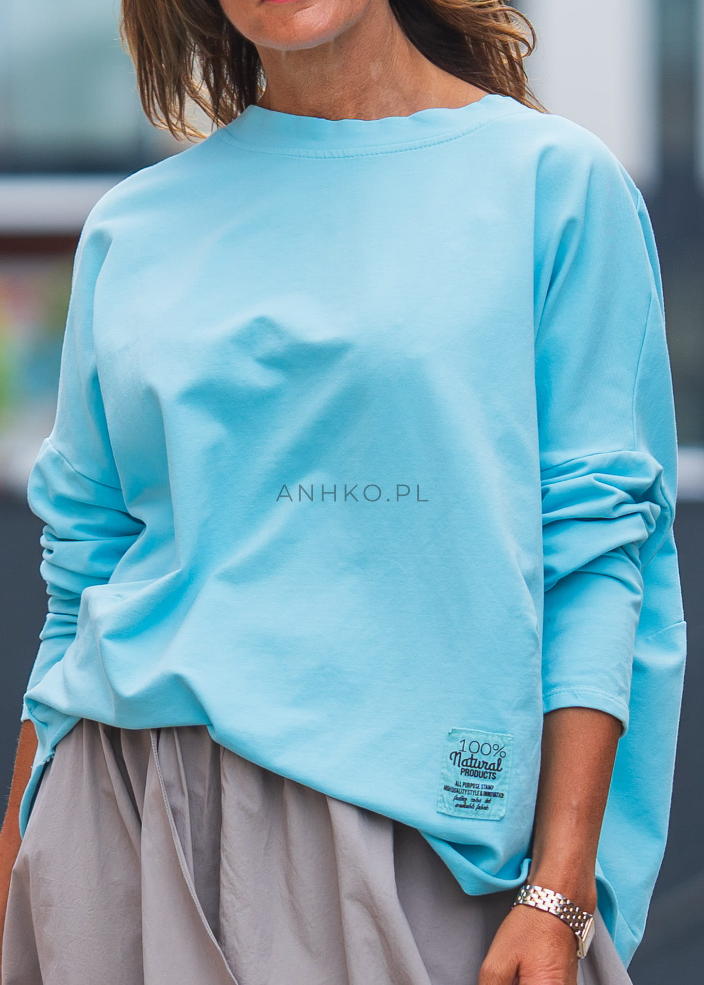 Ta bluza oversize w odcieniu Baby Blue subtelnie rozświetla stylizację i nadaje jej nowoczesnego charakteru. Luźny fason miękko układa się na sylwetce, zapewniając swobodę ruchów, a delikatna linia ramion podkreśla casualowy, niewymuszony styl. To model, który doskonale wpisuje się w codzienne zestawy, dodając im lekkości i świeżości.