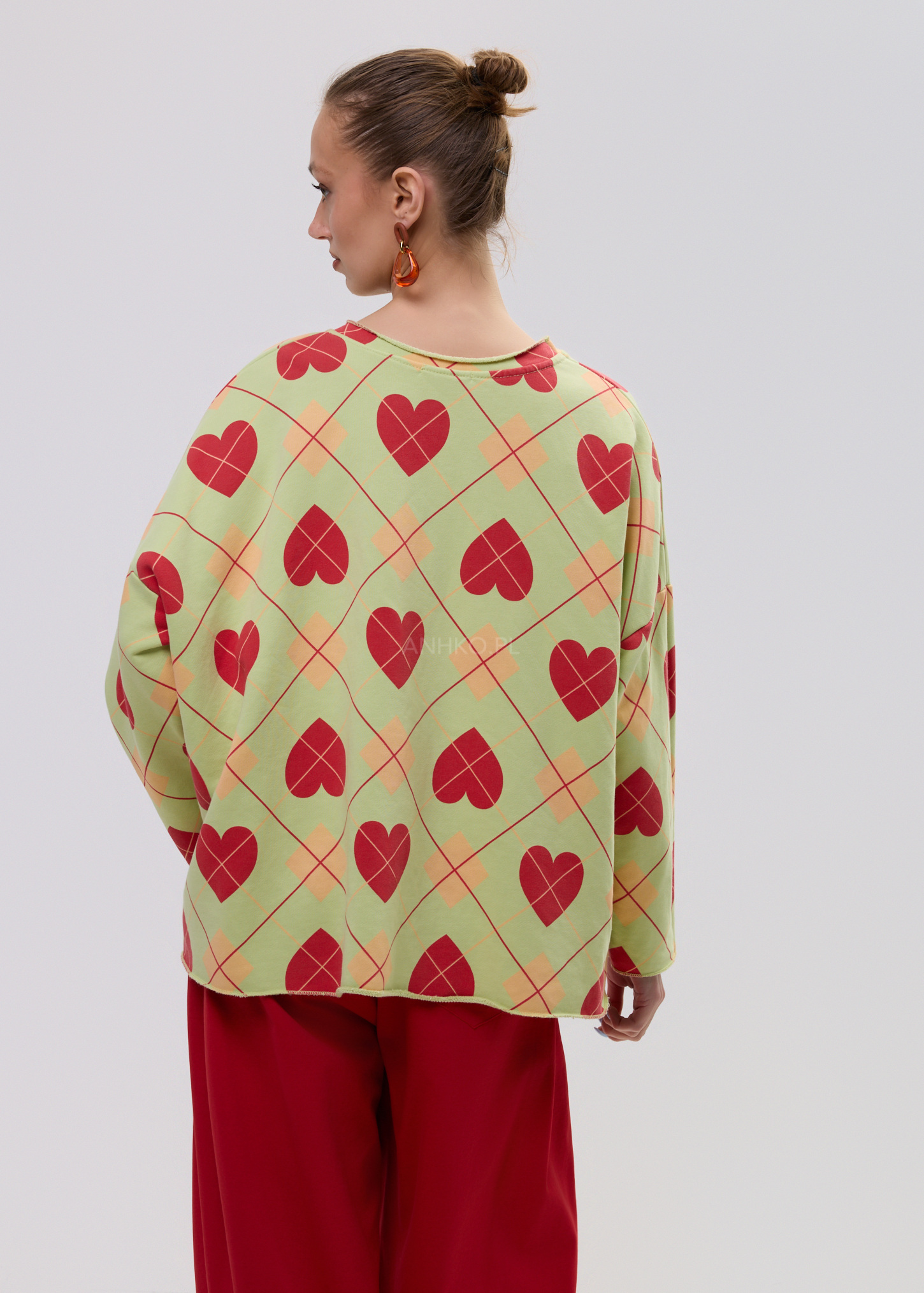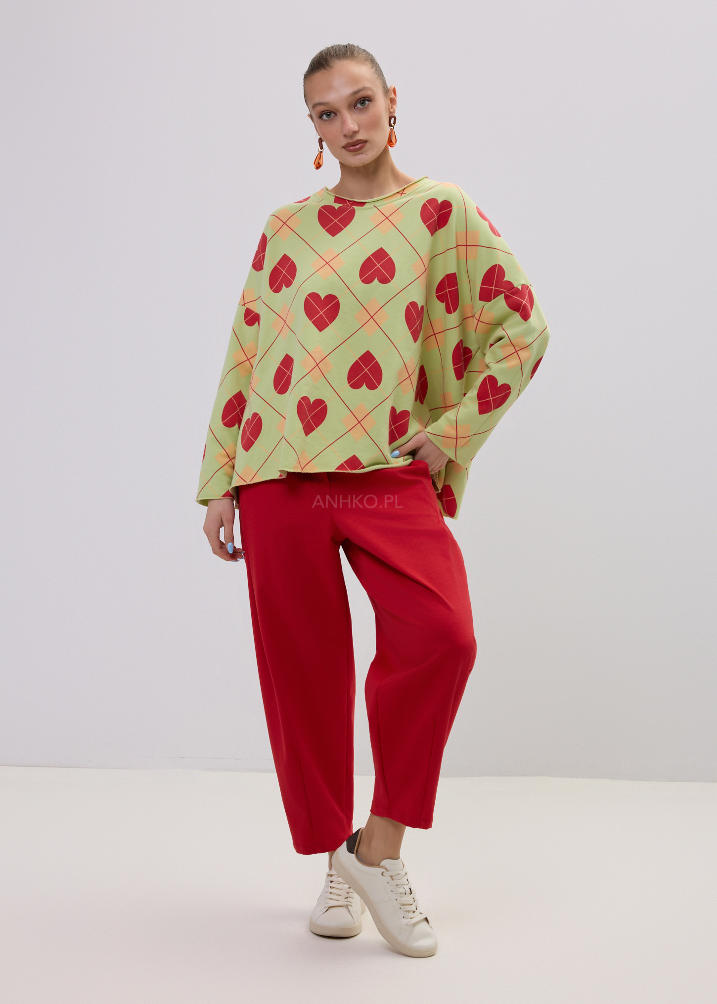Ta bluza oversize wyróżnia się już na pierwszy rzut oka – intensywna limonkowa baza i kontrastowy print w serca oraz kratkę tworzą efektowny, graficzny look. Luźny fason swobodnie opływa sylwetkę, zapewniając pełen komfort i nowoczesny, streetwearowy charakter. Szerokie rękawy typu kimono nadają całości wyrazistości i podkreślają modowy, nonszalancki styl.