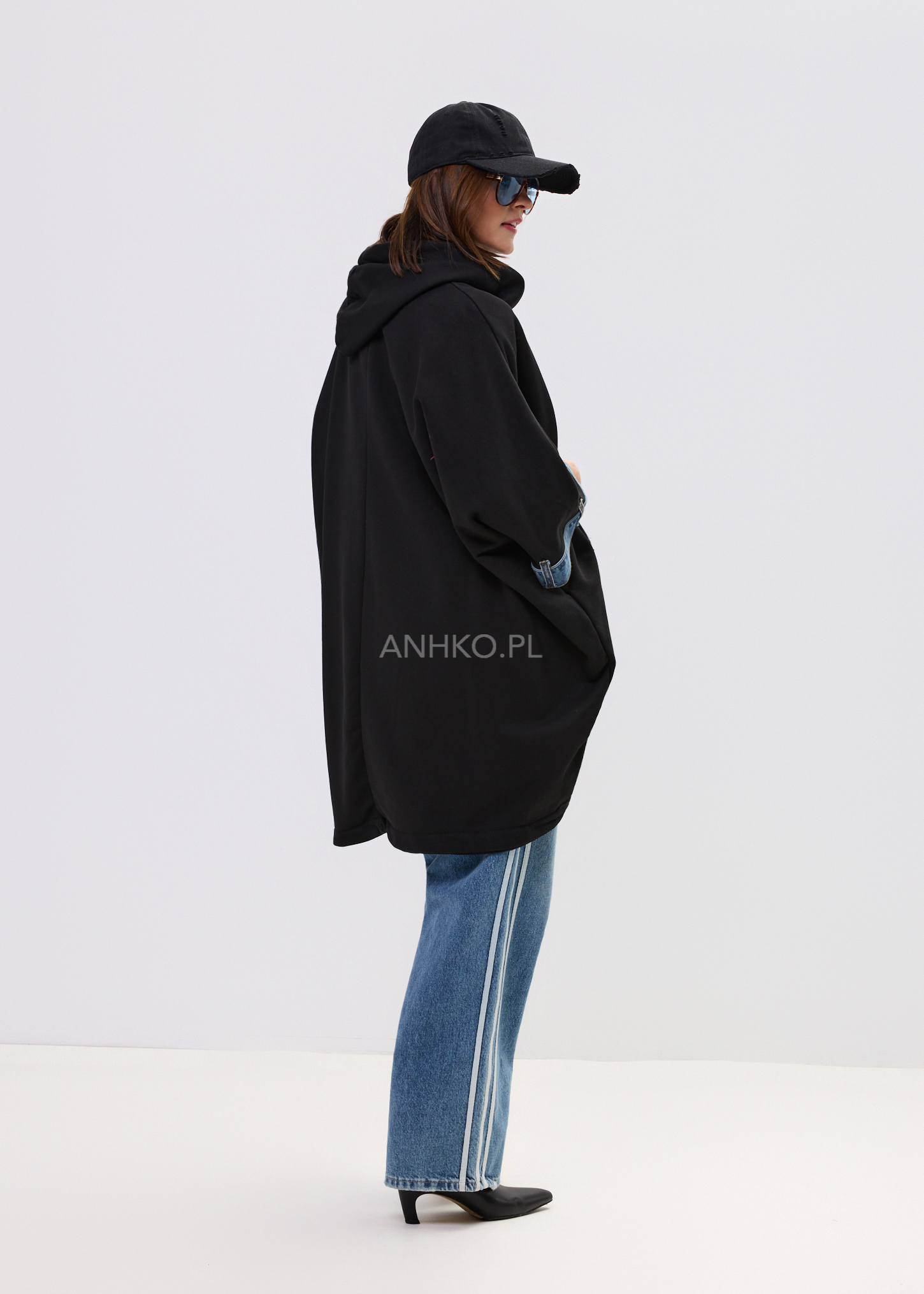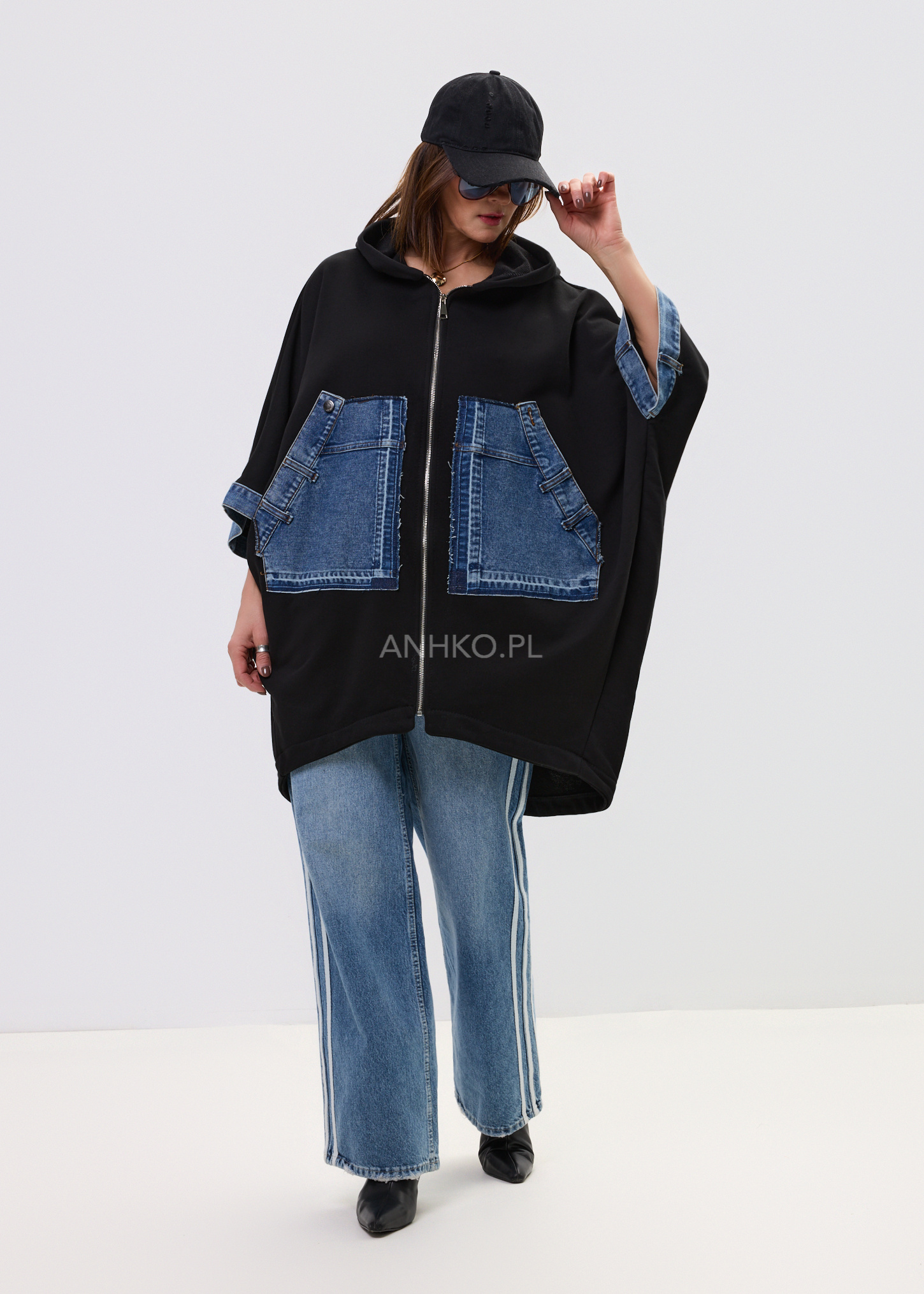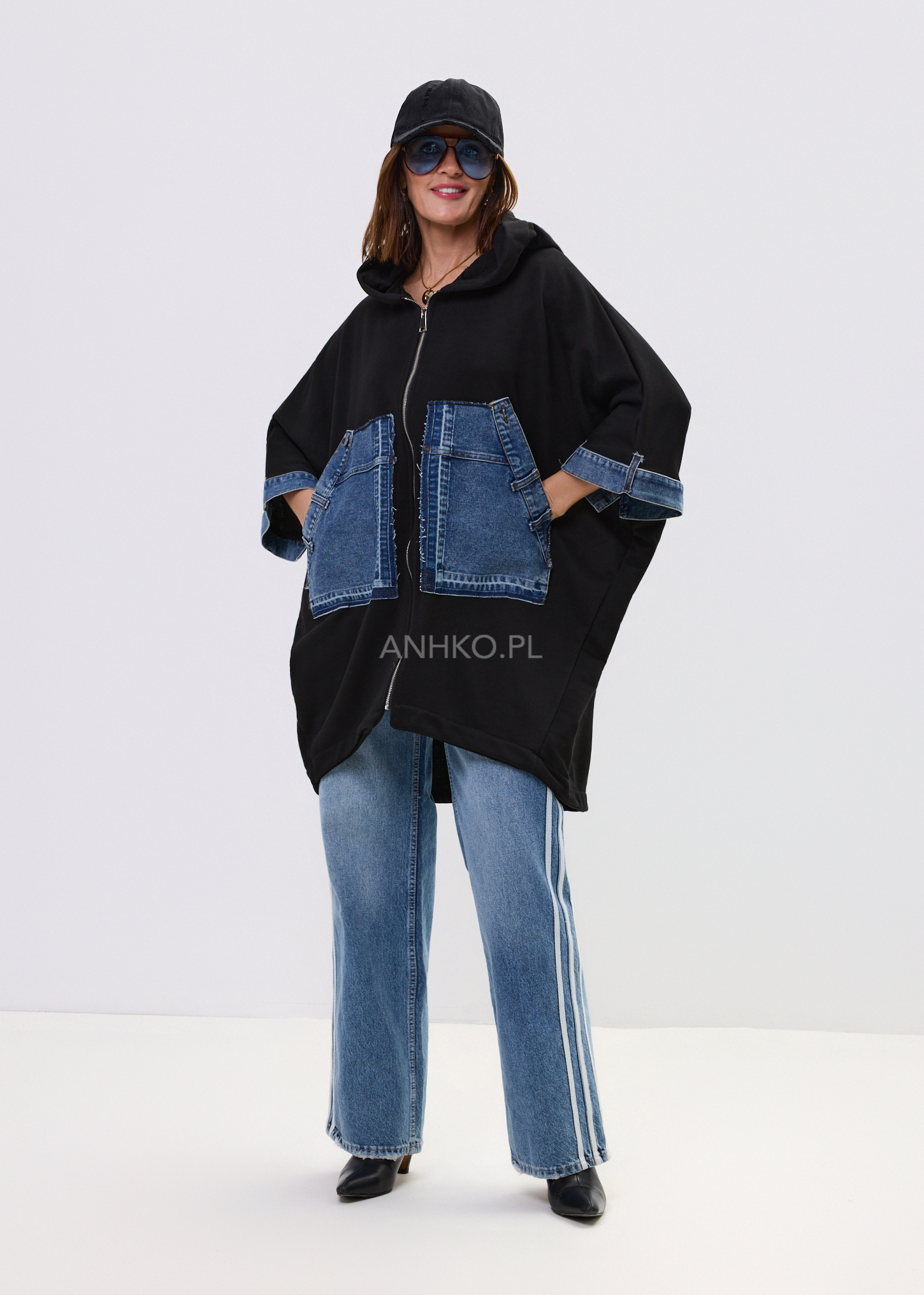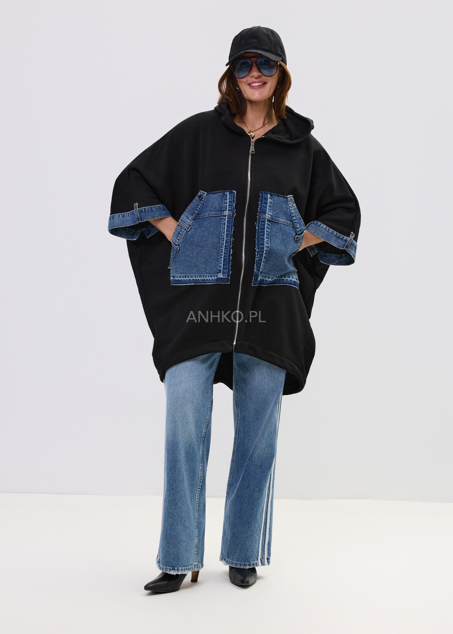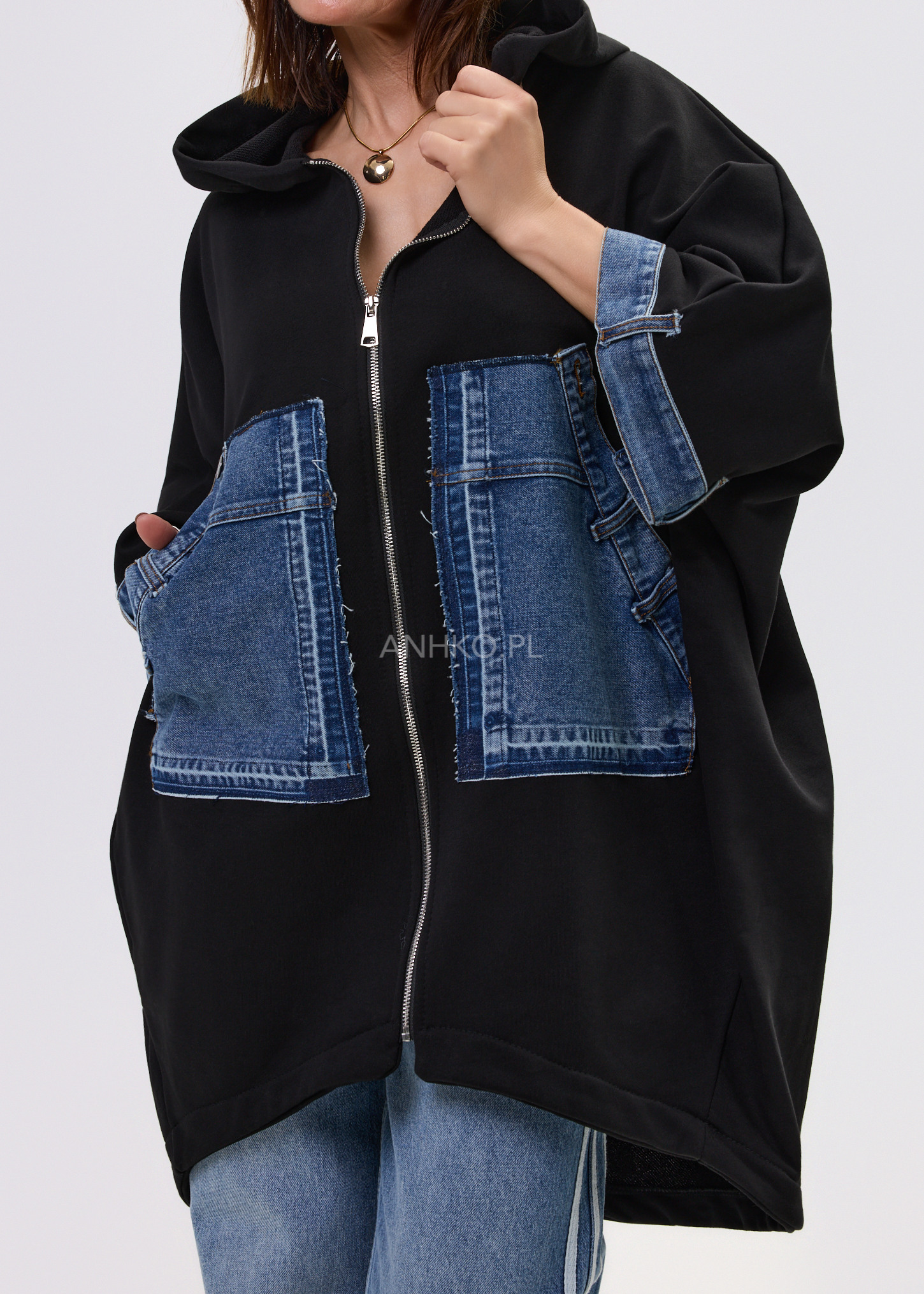 Ta bluza rozpinana o luźnym kroju przyciąga uwagę kontrastowym zestawieniem czarnej dzianiny i dekoracyjnych elementów z denimu. Fason oversize swobodnie układa się na sylwetce, tworząc modowy, lekko nonszalancki efekt. Dzięki miękkiej, elastycznej tkaninie model zapewnia komfort noszenia i dobrze dopasowuje się do ruchu.