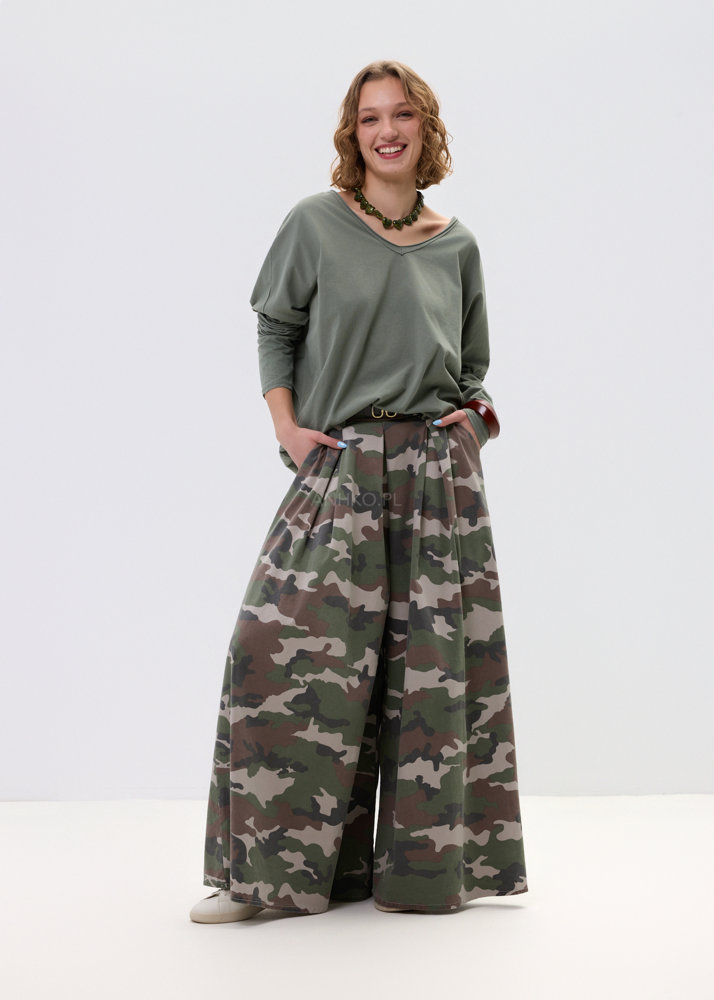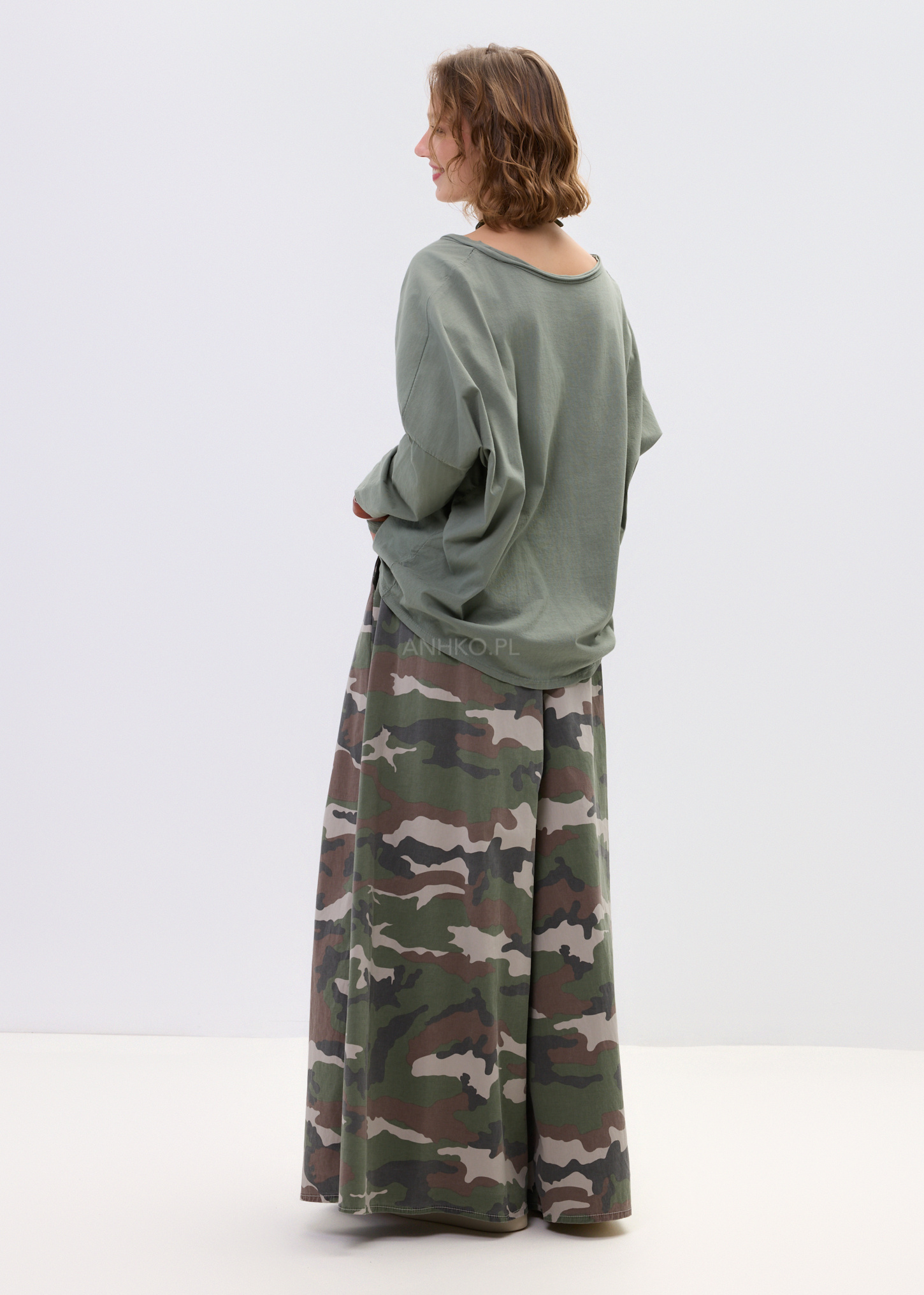 Spodnie Camo Moro - Stylowe spodnie o szerokich nogawkach w militarny wzór moro. Wykonane z wysokiej jakości bawełny z dodatkiem elastanu, zapewniają komfort noszenia. Elastyczny pas i pasek w zestawie sprawiają, że doskonale dopasowują się do sylwetki. Idealne na co dzień oraz do casualowych i streetwearowych stylizacji.