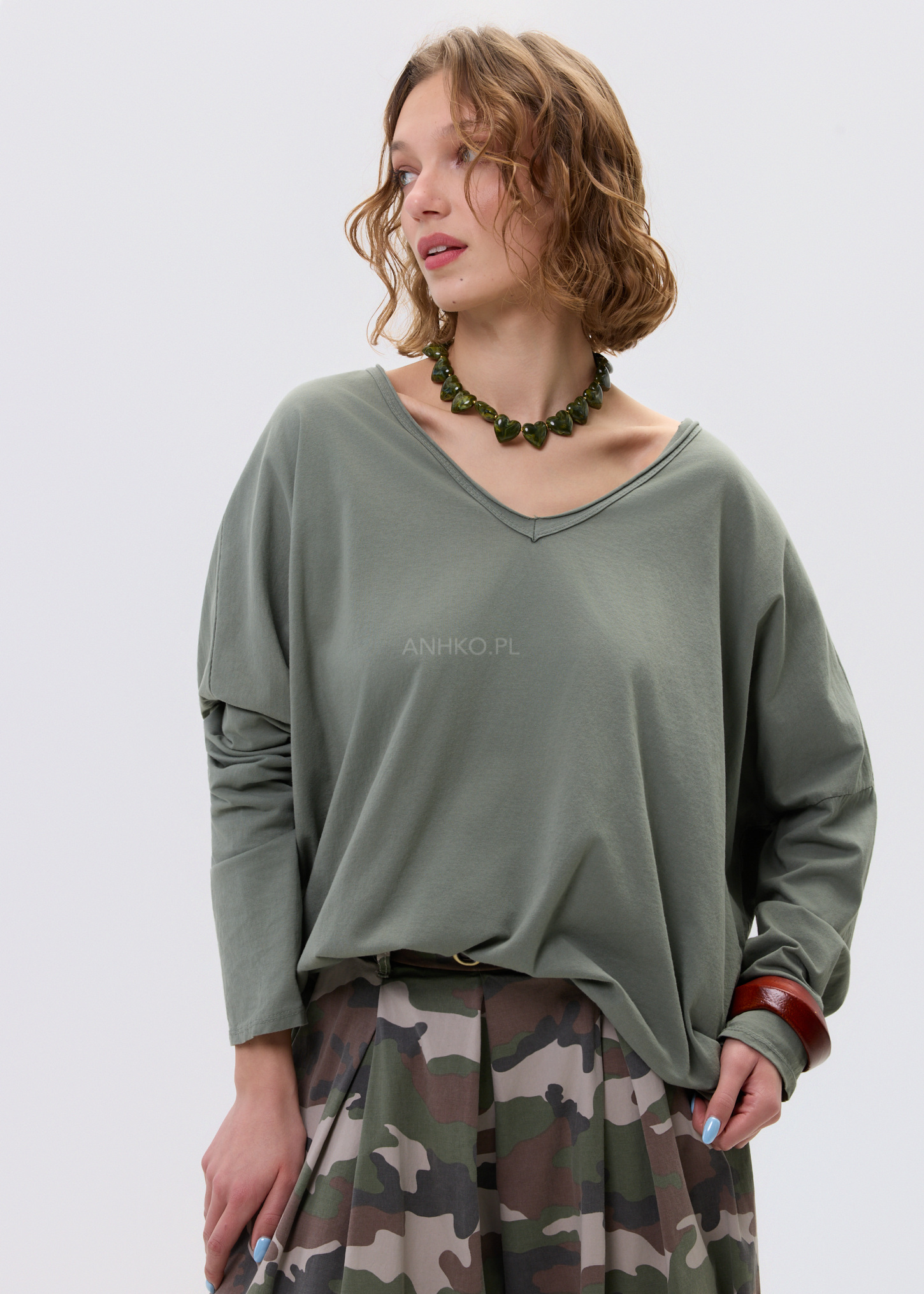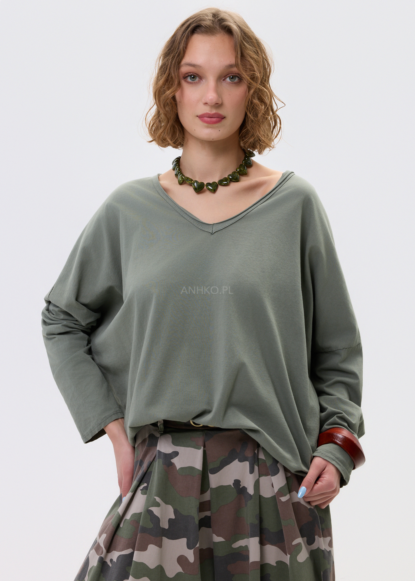 Minimalistyczny krój sprawia, że bluzka staje się doskonałą bazą wielu zestawów. Dekolt V-neck wykończony surowo nadaje całości subtelnej nonszalancji, a długi rękaw dopełnia wygodny, codzienny charakter modelu. Bluzka świetnie komponuje się zarówno z jeansami, jak i wzorzystą spódnicą czy klasycznymi spodniami, tworząc stylizacje o lekkim, swobodnym charakterze.