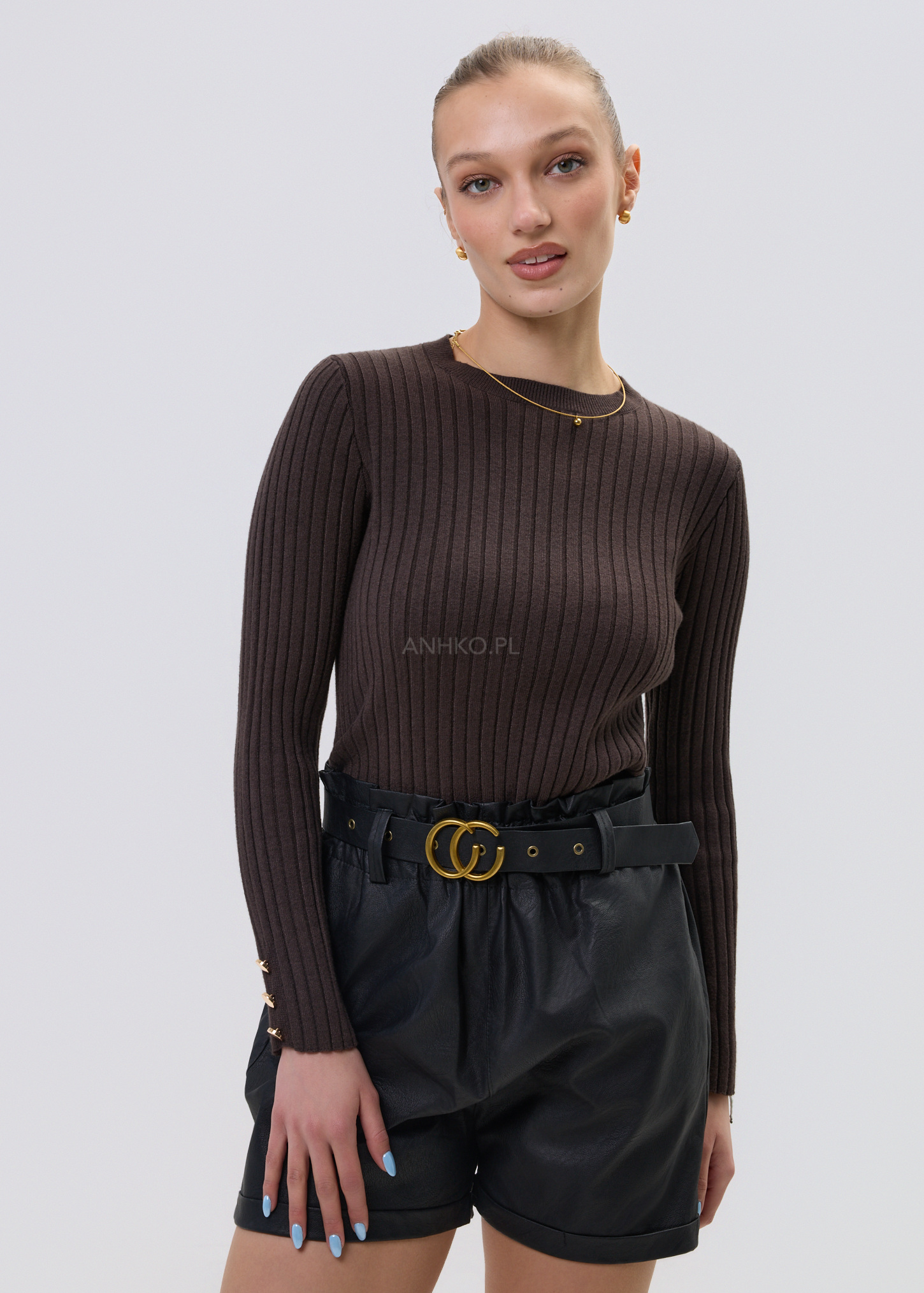 Ta bluzka prążkowana w eleganckim, brązowym odcieniu pięknie dopasowuje się do sylwetki i podkreśla jej naturalną linię. Elastyczna dzianina sprawia, że model komfortowo układa się na ciele, a krótki fason świetnie komponuje się z elementami garderoby o podwyższonym stanie. Delikatna struktura materiału nadaje całości subtelnej głębi, dzięki czemu bluzka wygląda stylowo zarówno w prostych, jak i bardziej dopracowanych stylizacjach.