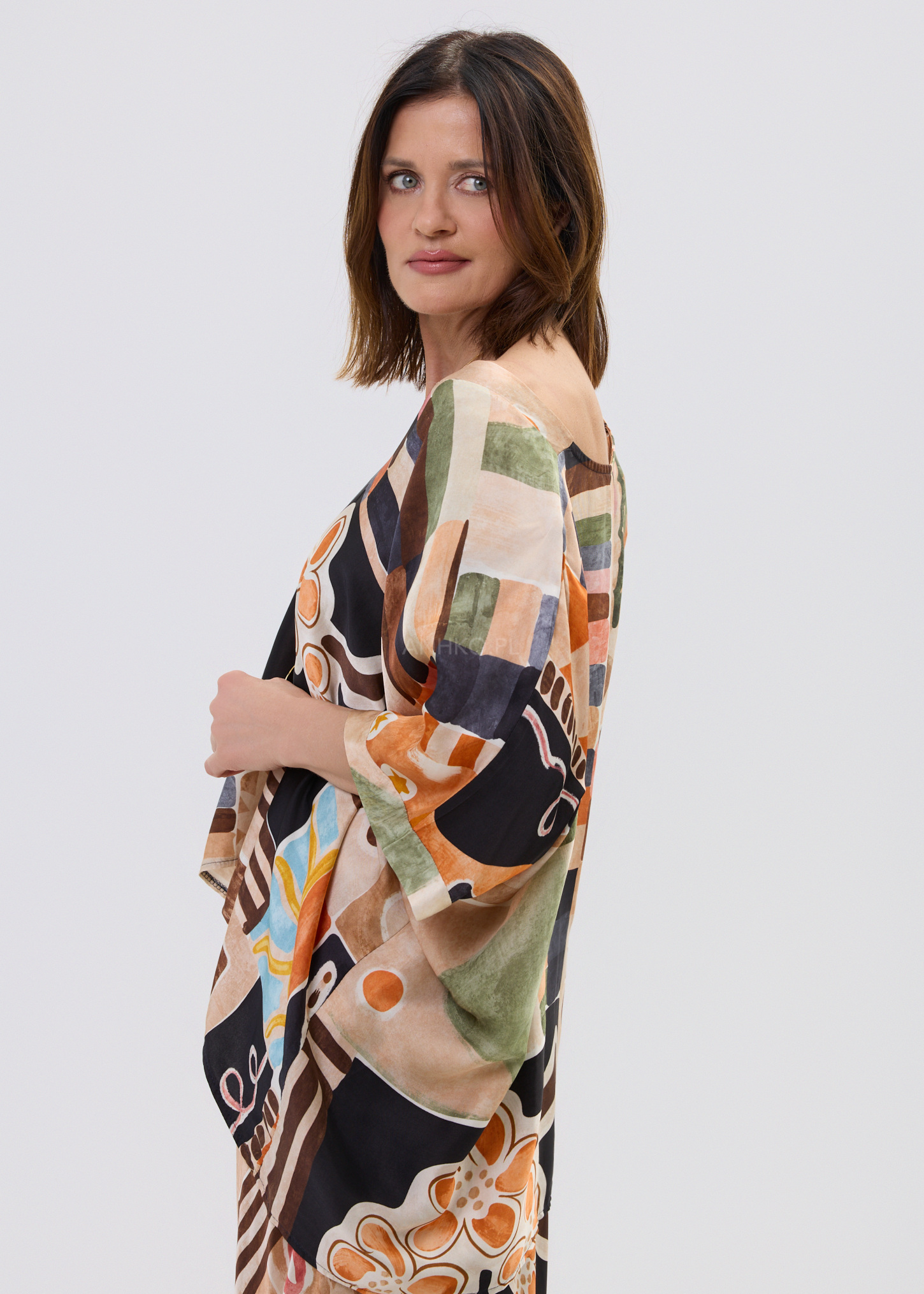 Wyrazisty, artystyczny print przyciąga spojrzenia i sprawia, że nie potrzebujesz wielu dodatków, by stworzyć dopracowany look. Lekka, przyjemna w dotyku tkanina z dodatkiem jedwabiu sprawia, że bluzka świetnie sprawdzi się zarówno w codziennych zestawach, jak i bardziej stylowych stylizacjach. Noś ją z jeansami, eleganckimi spodniami lub spódnicą – zawsze wygląda efektownie i bez wysiłku.