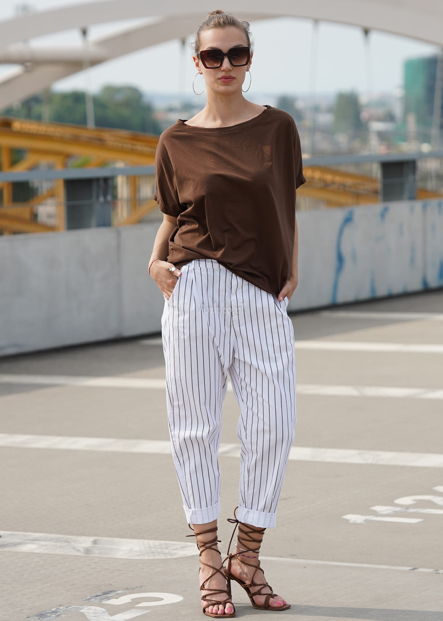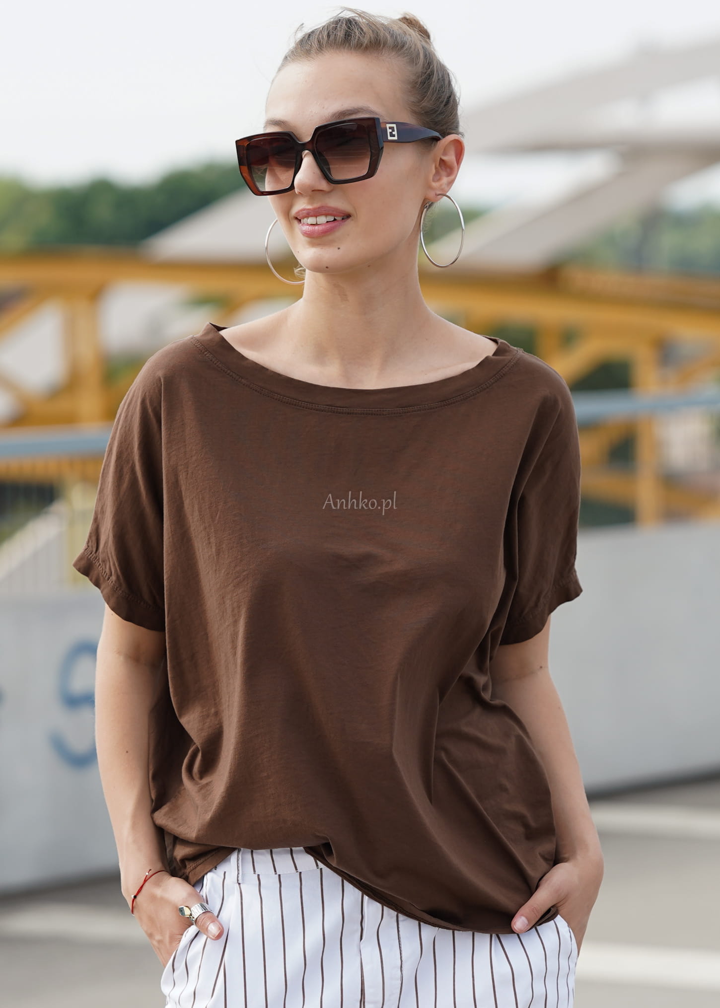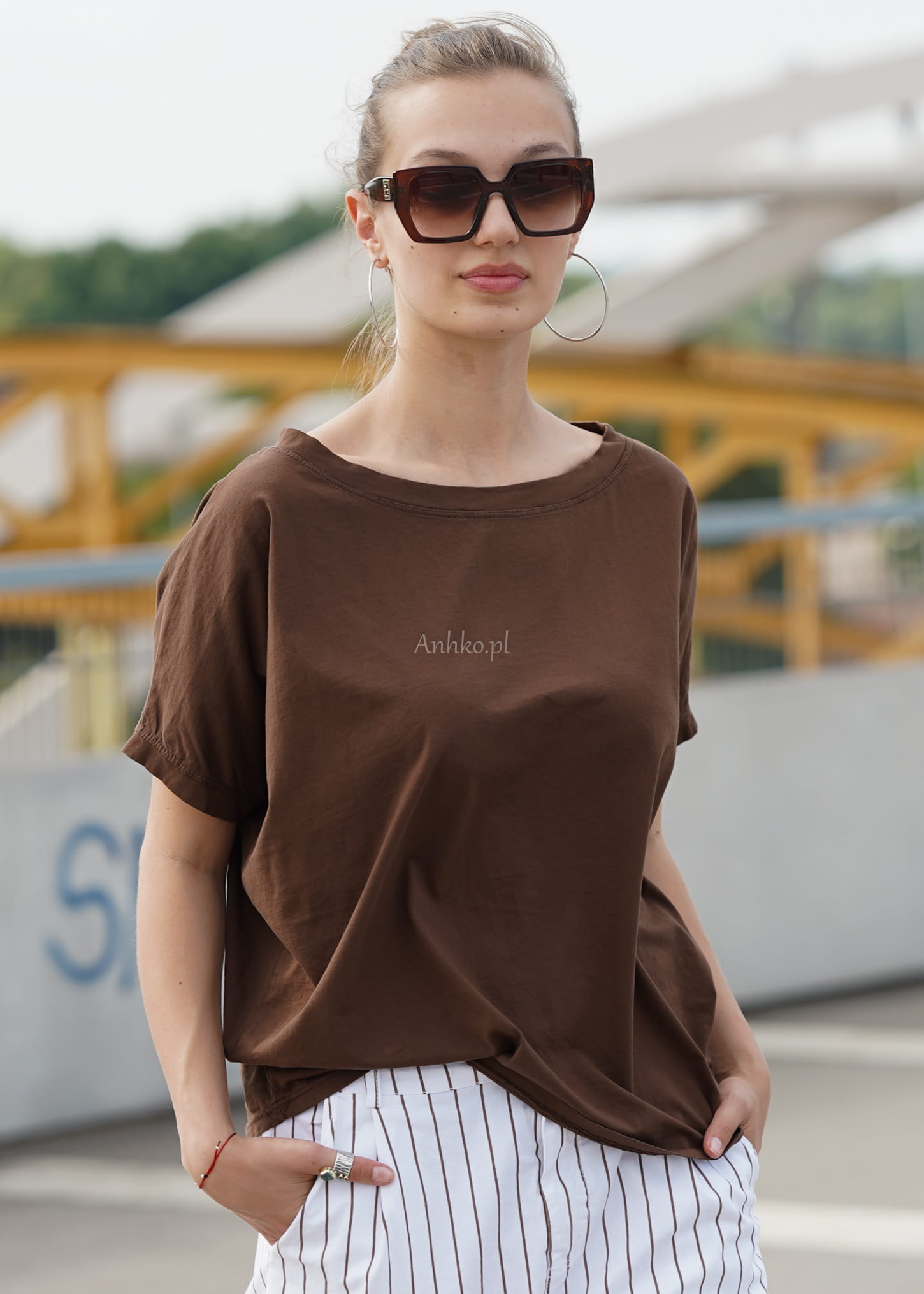 Naturalna bawełna sprawia, że bluzka jest miękka, przewiewna i komfortowa przez cały dzień. Odcień głębokiego brązu pięknie komponuje się z bielą, beżem, denimem oraz wzorzystymi spodniami, tworząc spójne i stylowe zestawy – zarówno casualowe, jak i bardziej eleganckie.