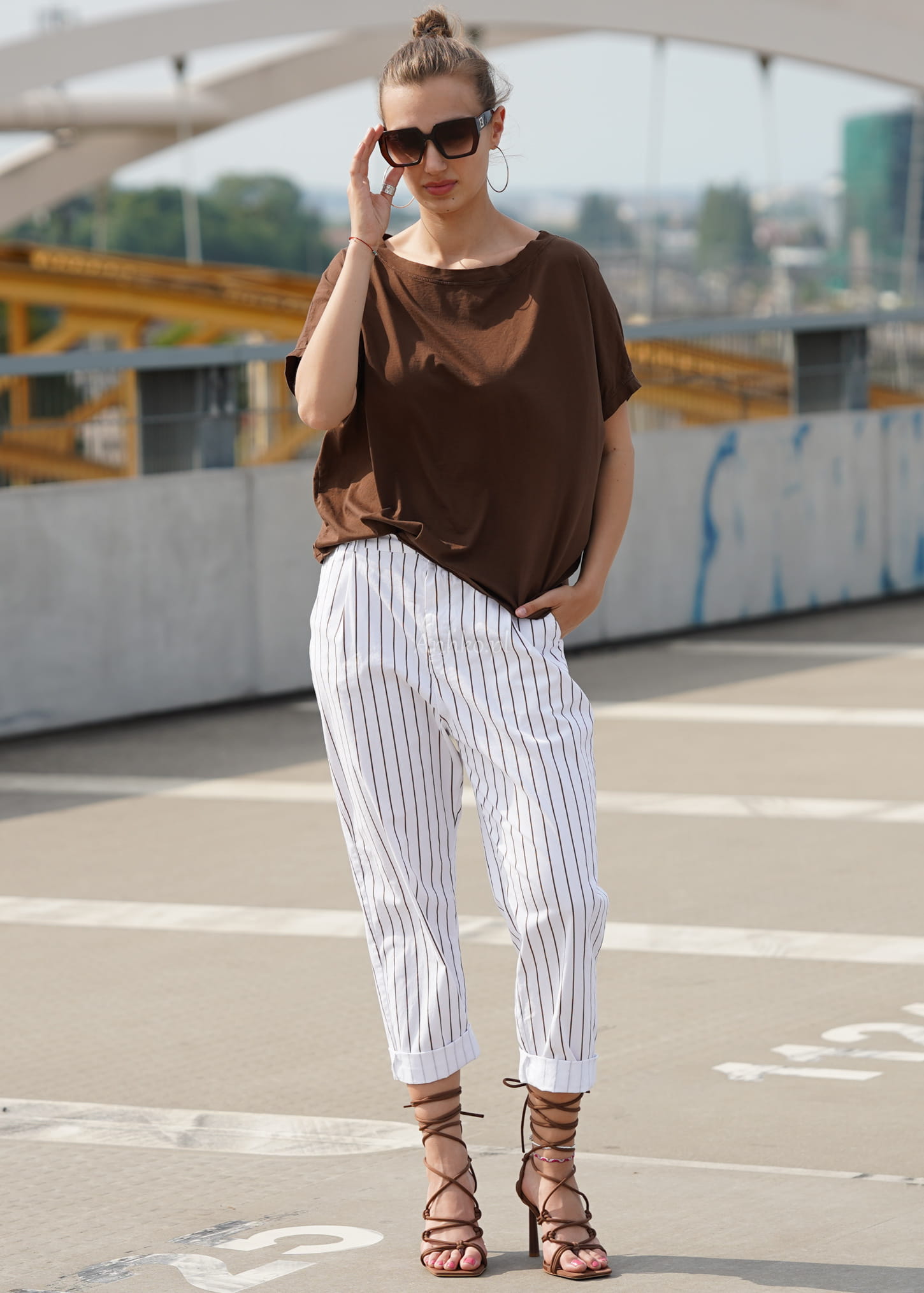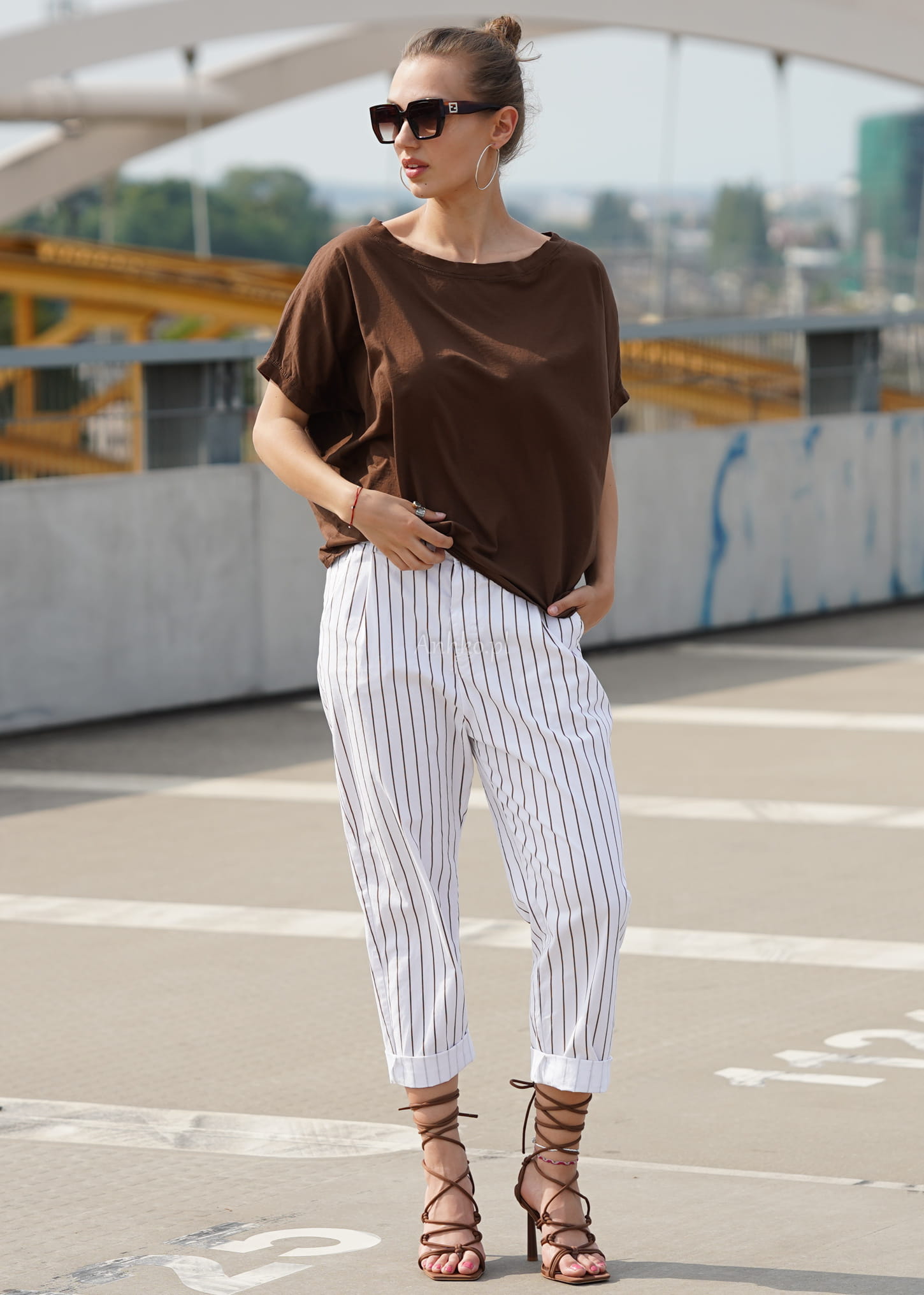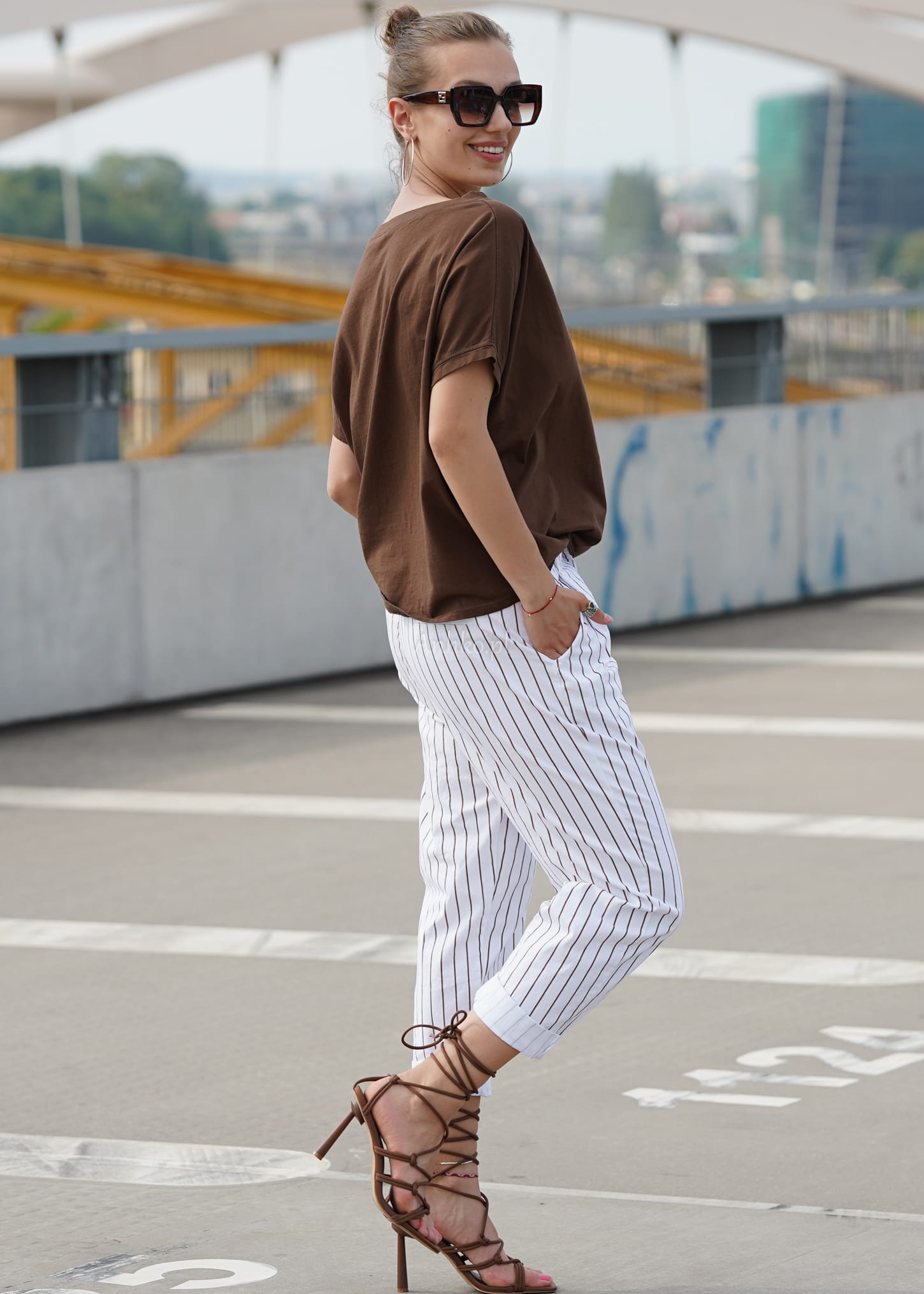 Naturalna bawełna sprawia, że bluzka jest miękka, przewiewna i komfortowa przez cały dzień. Odcień głębokiego brązu pięknie komponuje się z bielą, beżem, denimem oraz wzorzystymi spodniami, tworząc spójne i stylowe zestawy – zarówno casualowe, jak i bardziej eleganckie.
