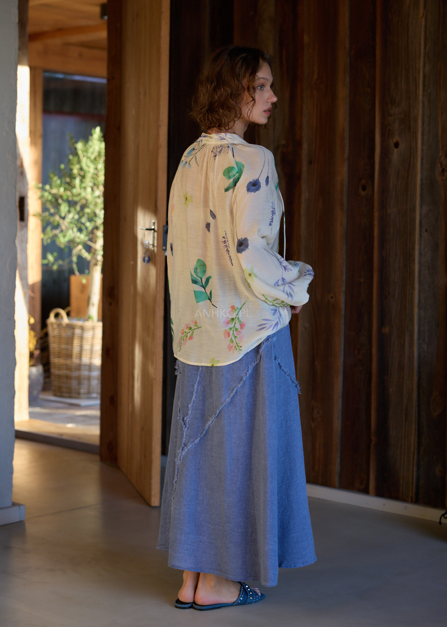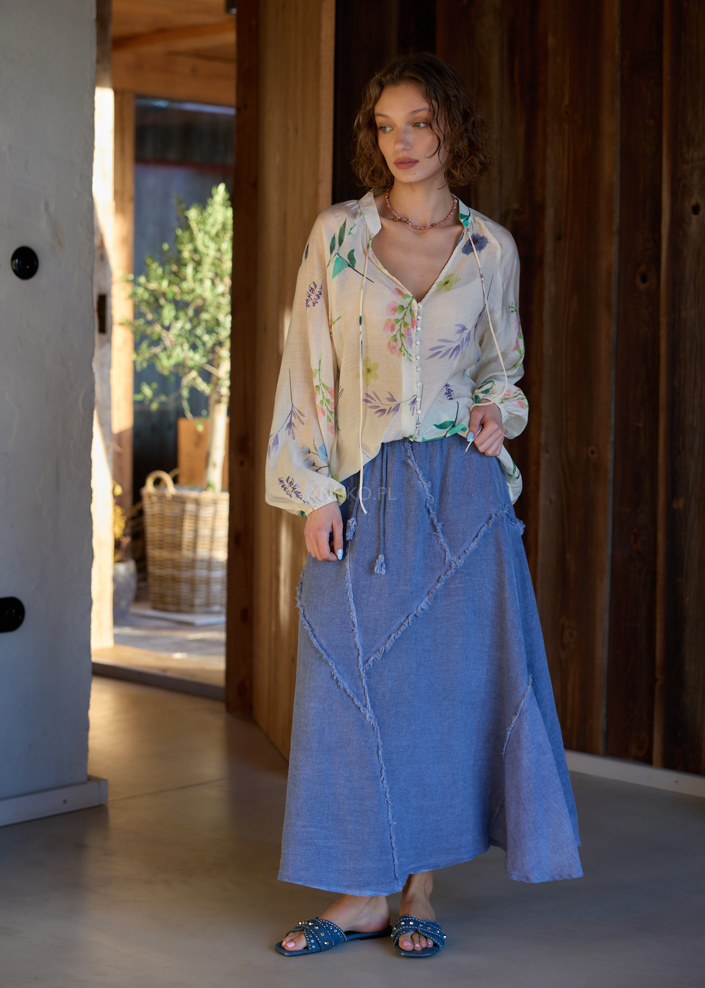 Spódnica Filona Niebieska - Luźna spódnica midi w spranym odcieniu niebieskiego z surowymi przeszyciami. Wygodna gumka w pasie i wiązanie z frędzlami nadają jej swobodny, lekko boho vibe – idealna na co dzień.