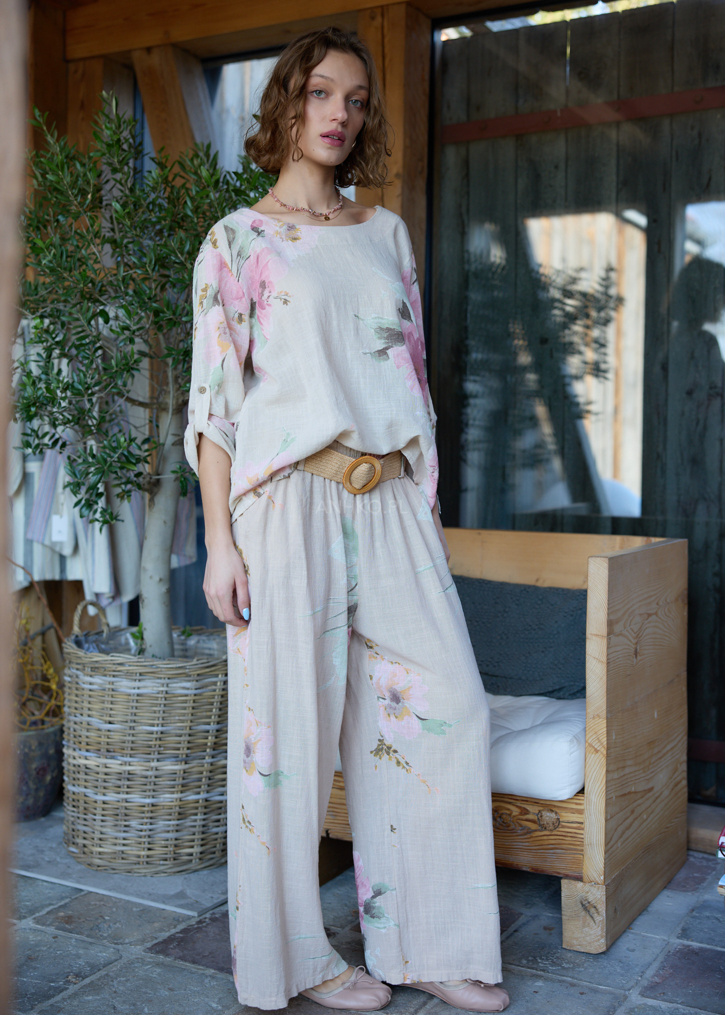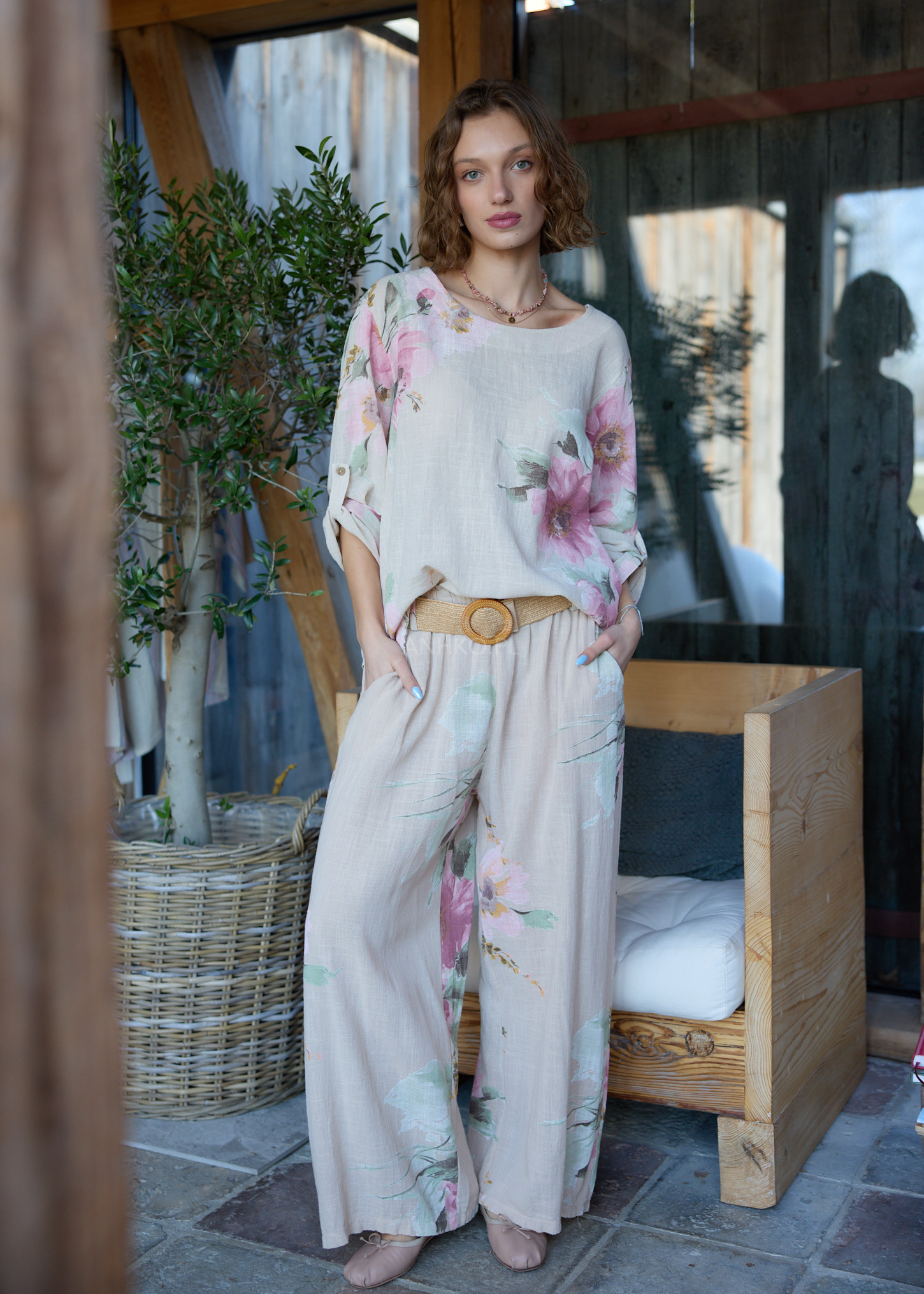Spodnie Bolinno Beżowe - Lekkie, luźne spodnie w pastelowym odcieniu z subtelnym, kwiatowym printem. Idealne na lato – wygodne, stylowe i gotowe na każdy dzień, od miasta po wakacyjne wyjazdy.
