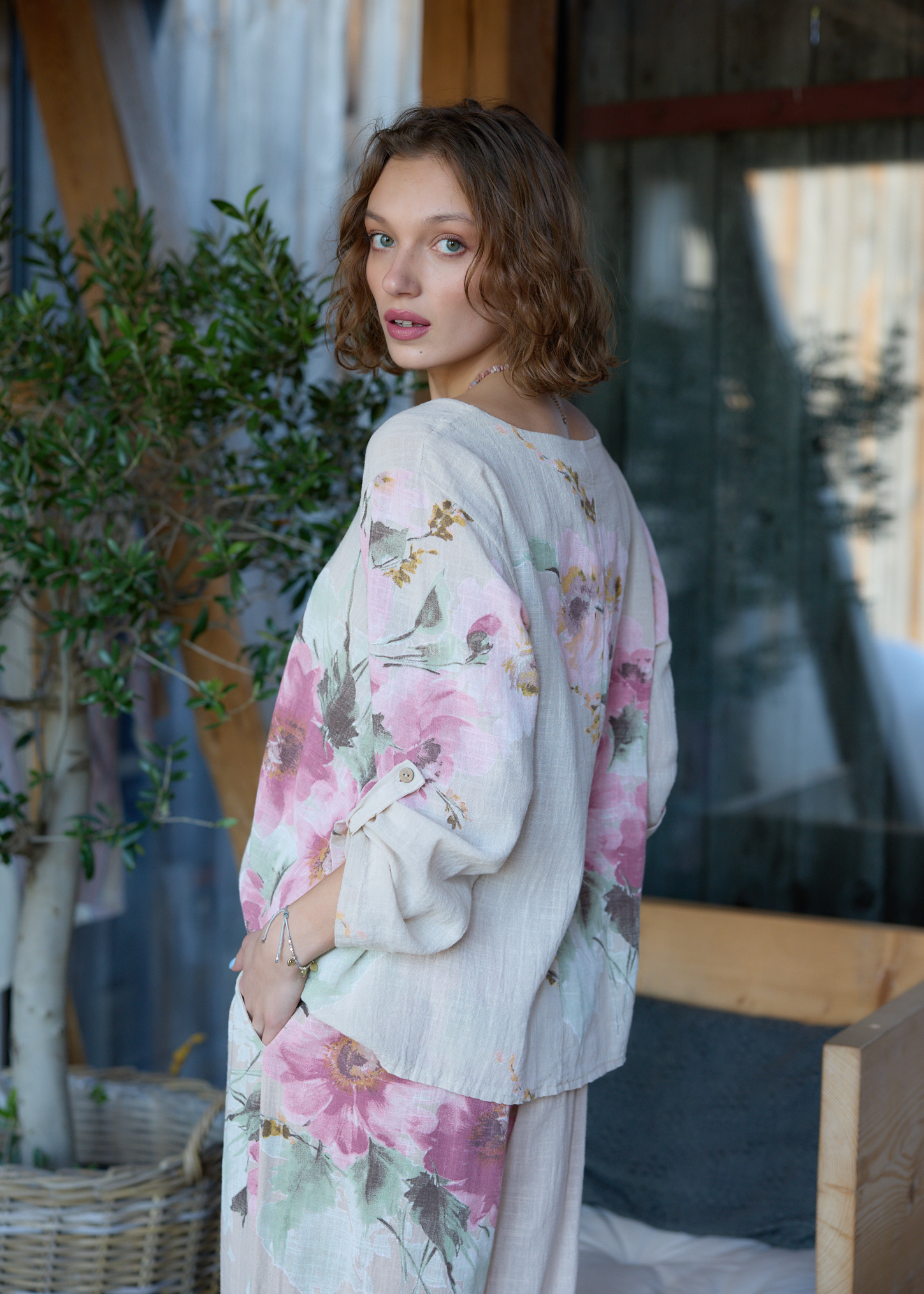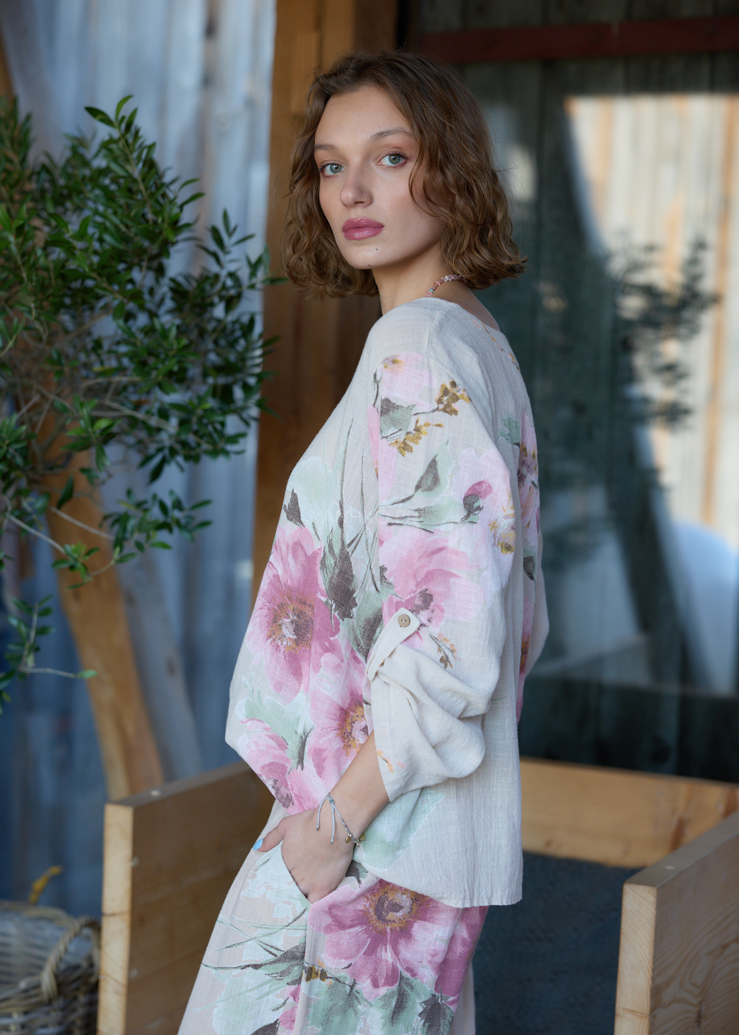 Beżowe tło przełamane kwiatowym motywem w odcieniach różu dodaje całości świeżości i wizualnej lekkości. To model, który łączy oddychającą bawełnę, komfort noszenia i dekoracyjny detal, dzięki czemu łatwo zestawić go z jeansami, lnianymi spodniami, szortami lub gładką spódnicą.