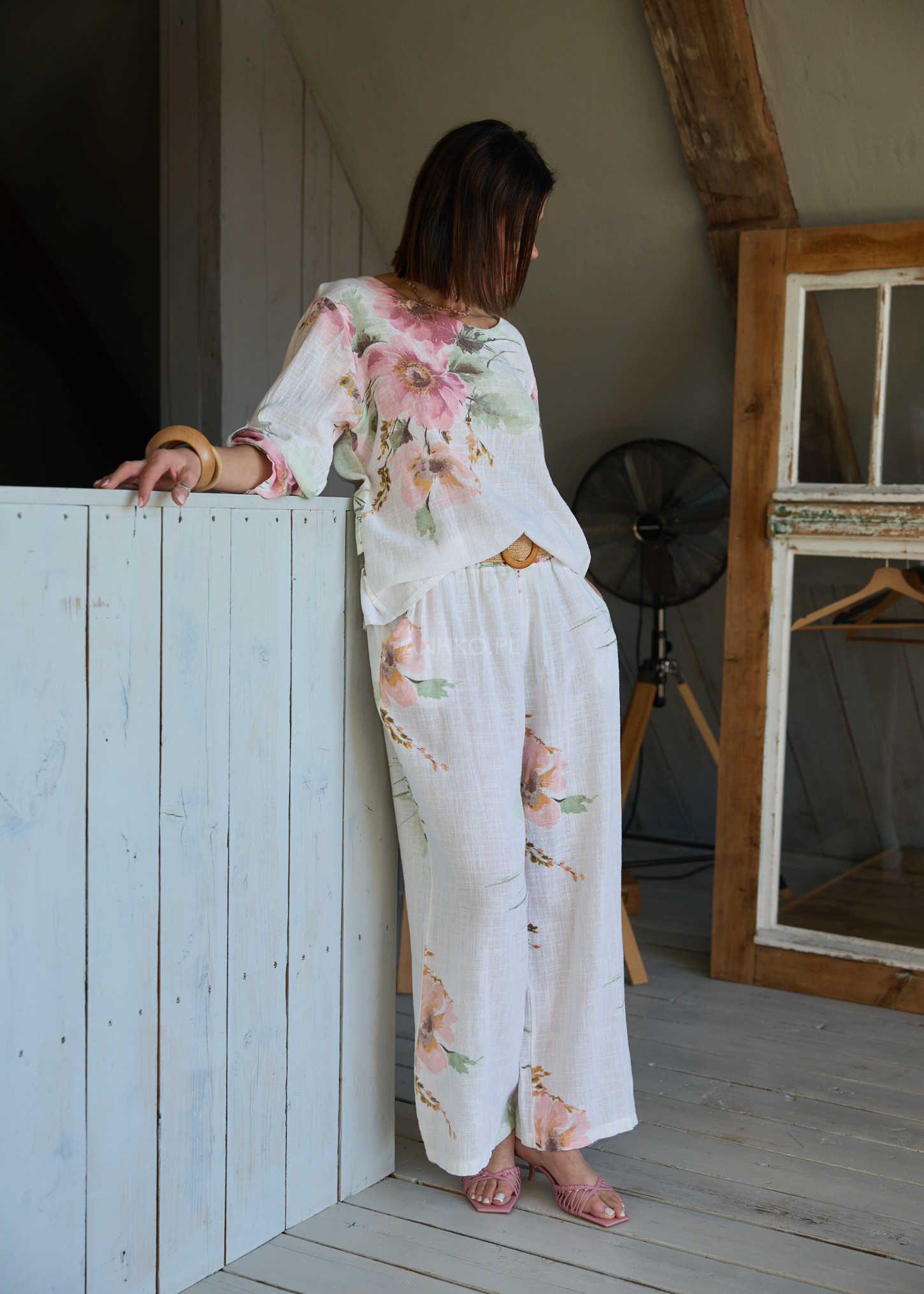 Spodnie Bolinno Białe - Lekkie, luźne spodnie w białym kolorze z subtelnym, kwiatowym printem. Idealne na lato – wygodne, stylowe i gotowe na każdy dzień, od miasta po wakacyjne wyjazdy.
