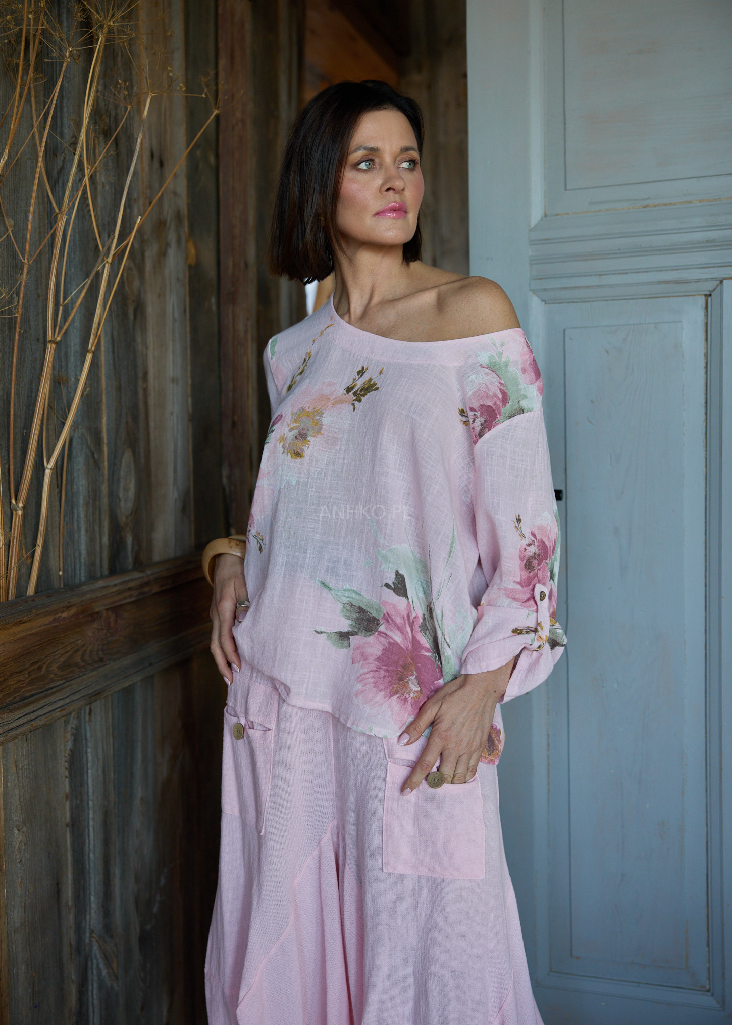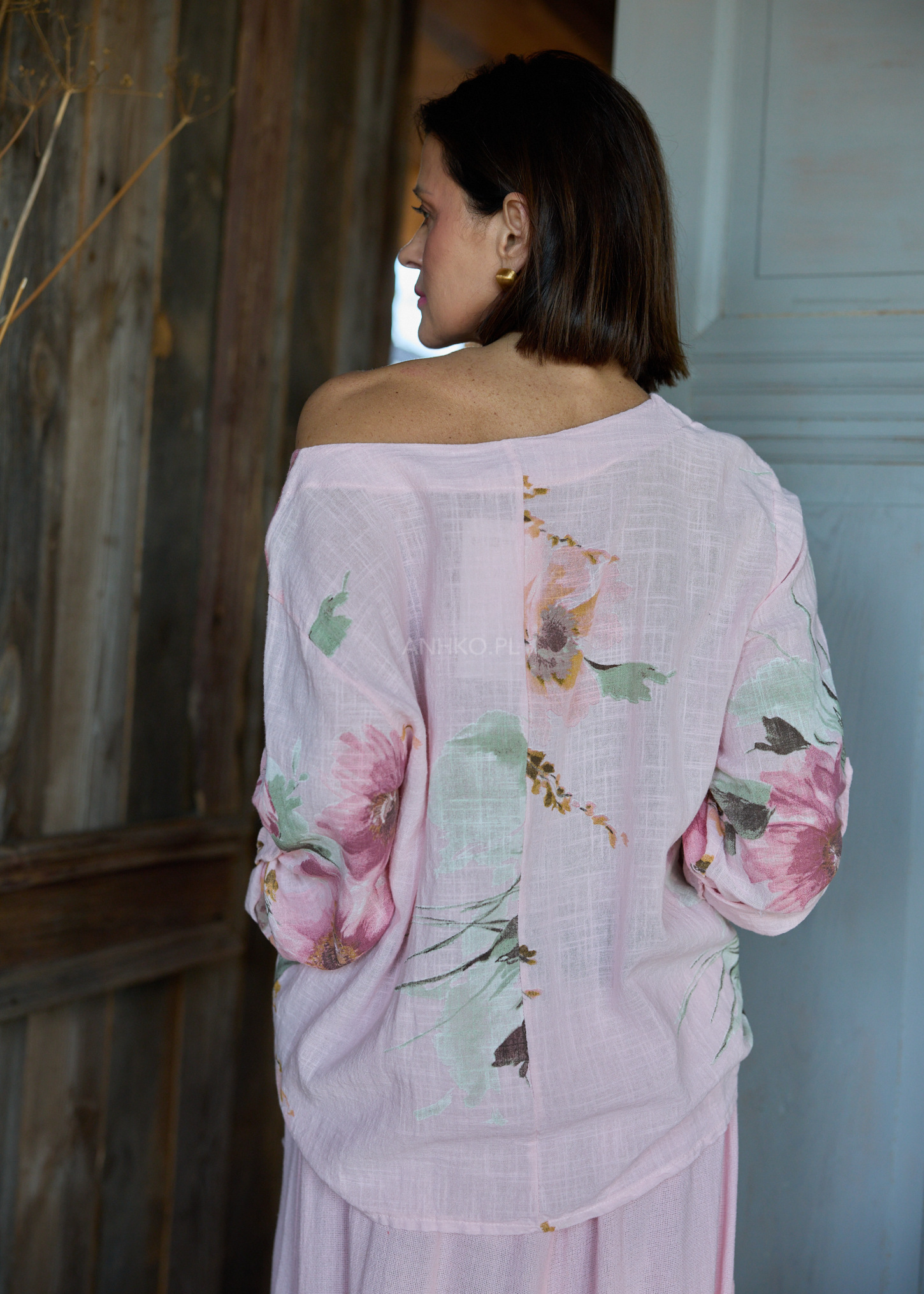 Pudrowo różowe tło przełamane kwiatowym motywem w odcieniach różu dodaje całości świeżości i wizualnej lekkości. To model, który łączy oddychającą bawełnę, komfort noszenia i dekoracyjny detal, dzięki czemu łatwo zestawić go z jeansami, lnianymi spodniami, szortami lub gładką spódnicą.