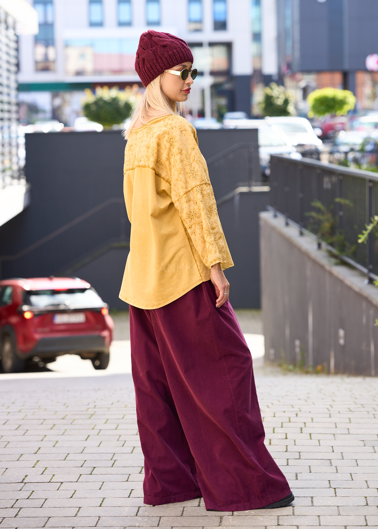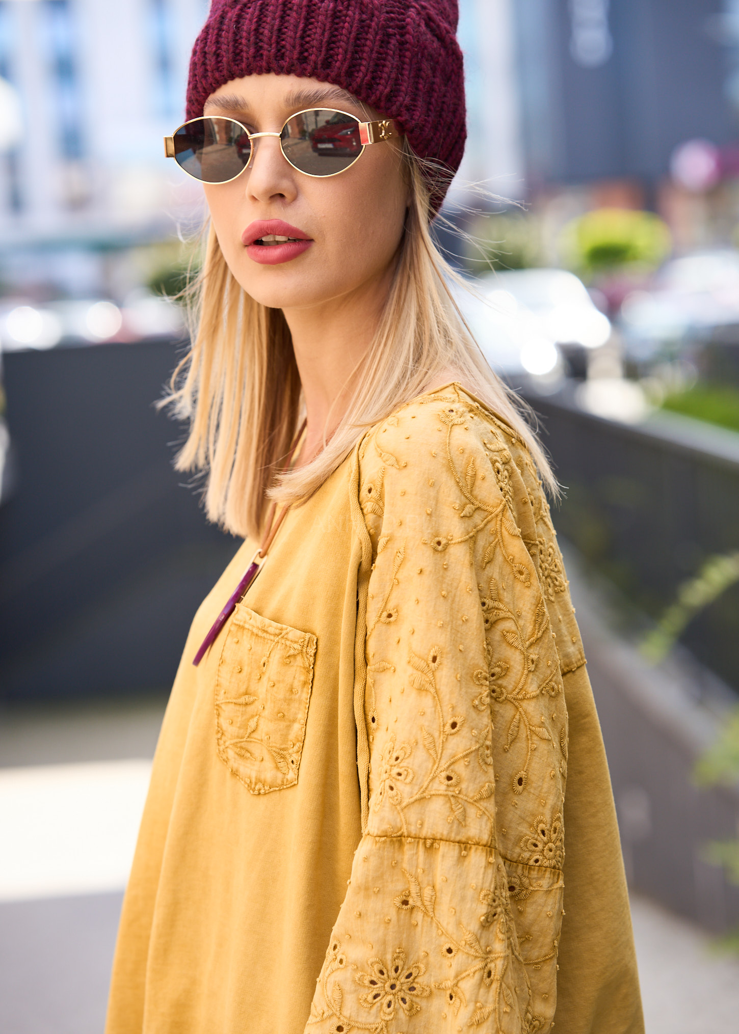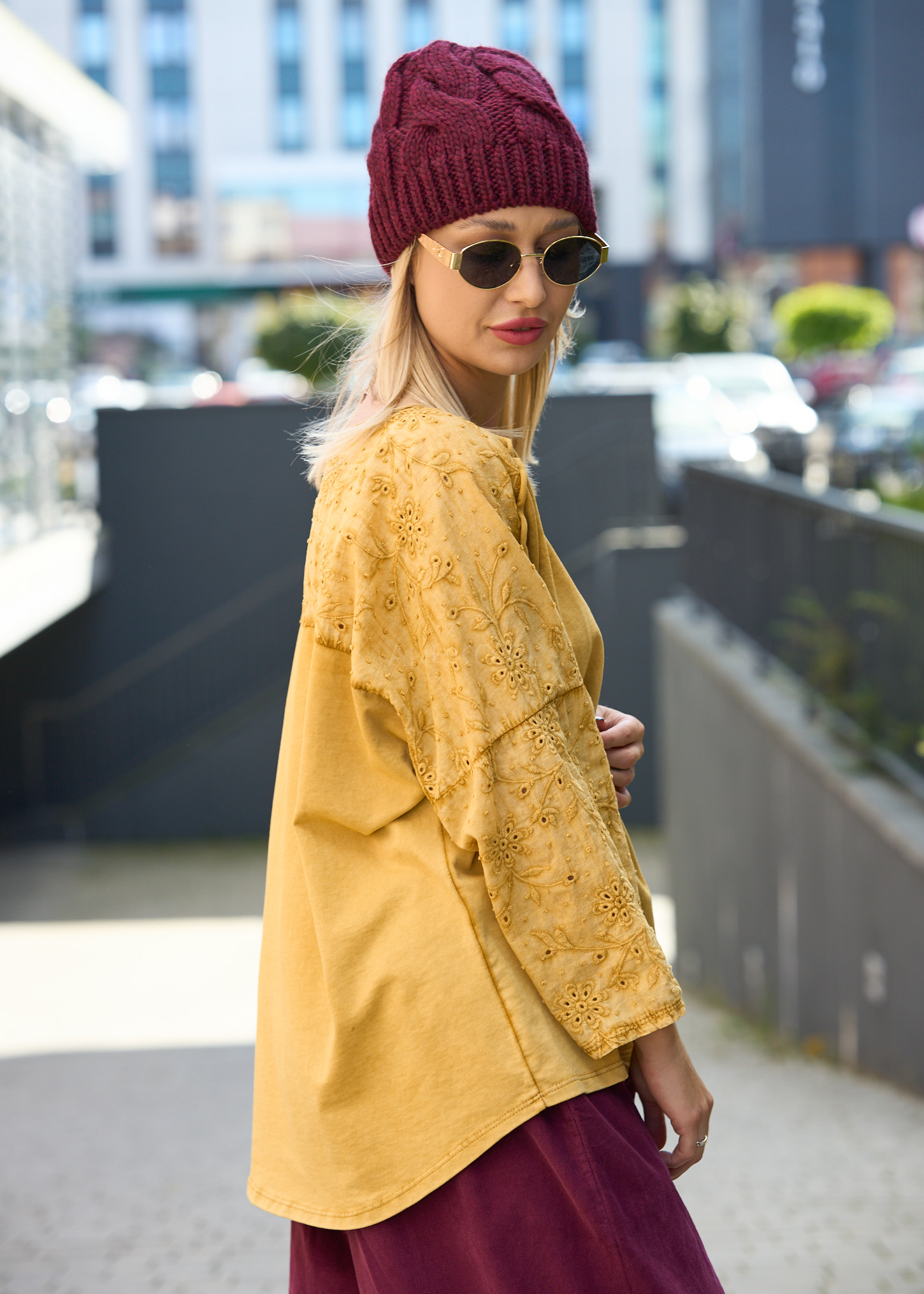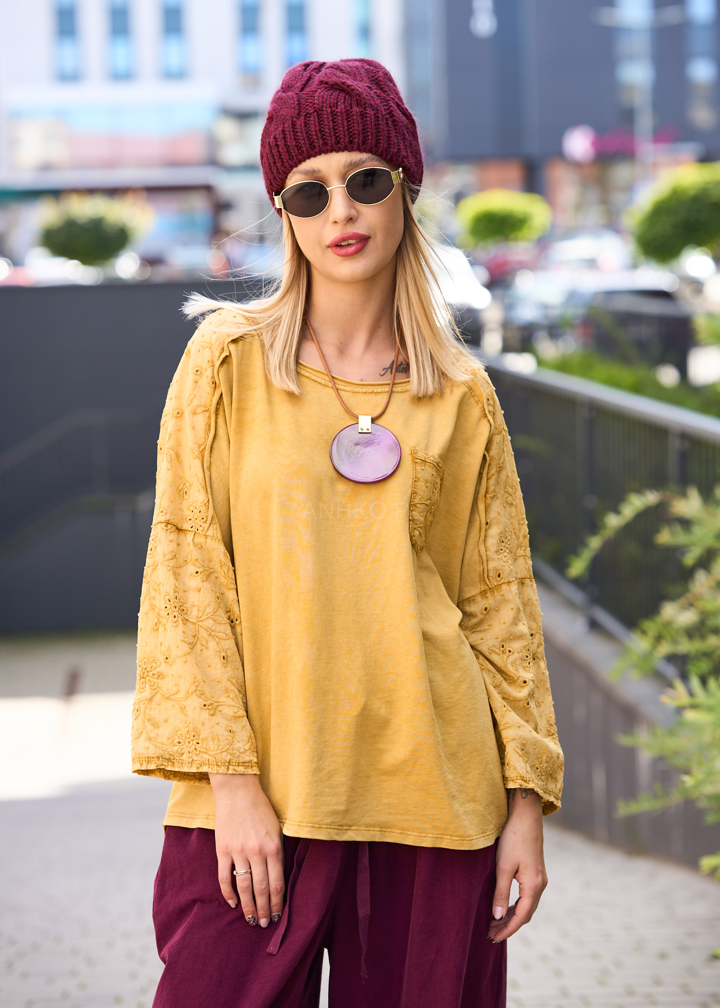 To wyjątkowa propozycja dla kobiet ceniących wygodę i subtelną elegancję. Bluzka w odcieniu Musztardowa wyróżnia się pięknymi, haftowanymi rękawami 3/4 oraz ozdobną kieszonką z przodu. Wykonana z wysokiej jakości bawełny z domieszką elastanu, zapewnia komfort noszenia i doskonałe dopasowanie. Idealna na casualowe wyjścia, spotkania z przyjaciółmi czy weekendowe spacery. Świetnie komponuje się zarówno z jeansami, jak i spódnicą, tworząc stylizacje w klimacie boho lub smart casual. Uniwersalny kolor sprawia, że bluzka pasuje do wielu dodatków i stylów.