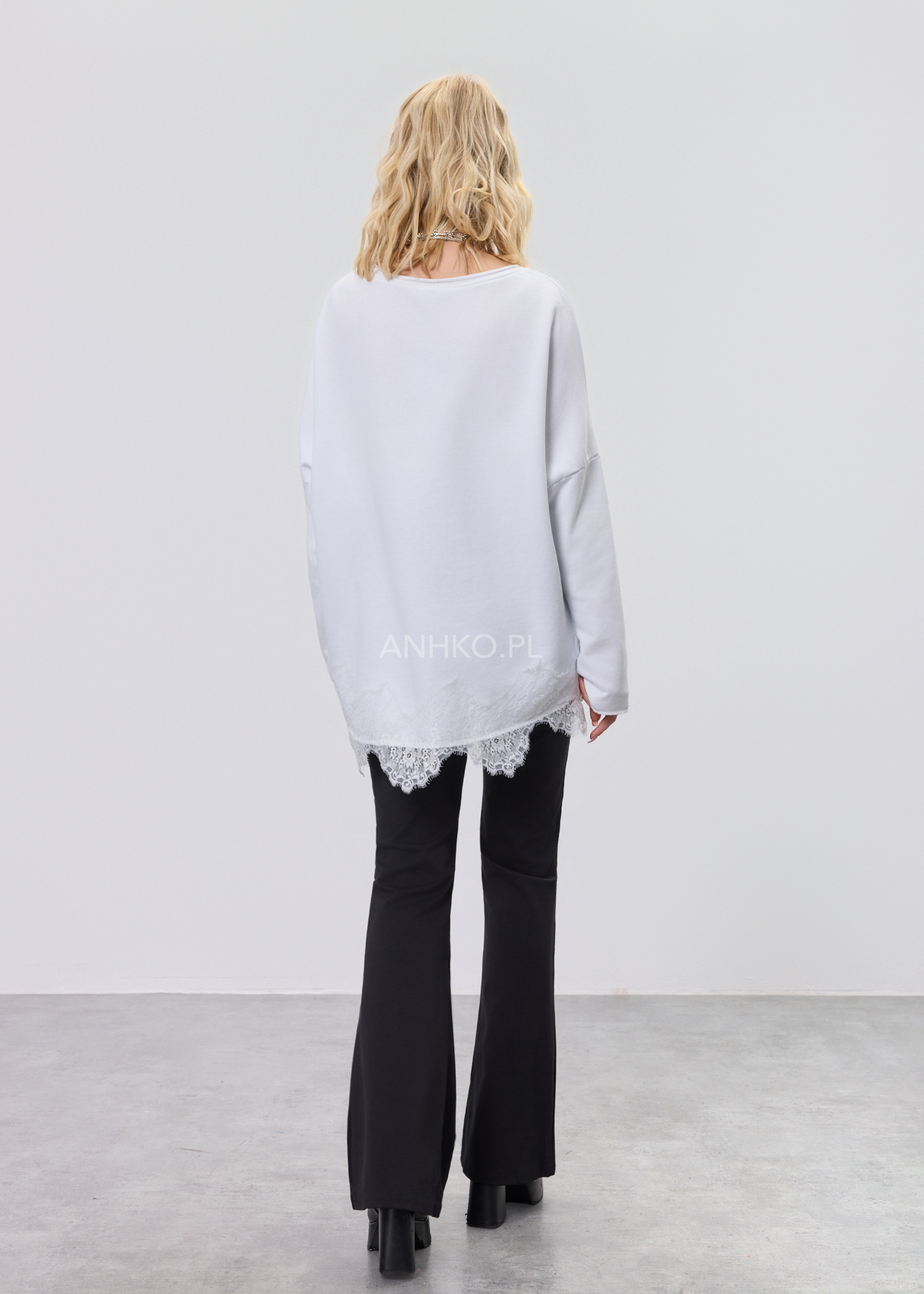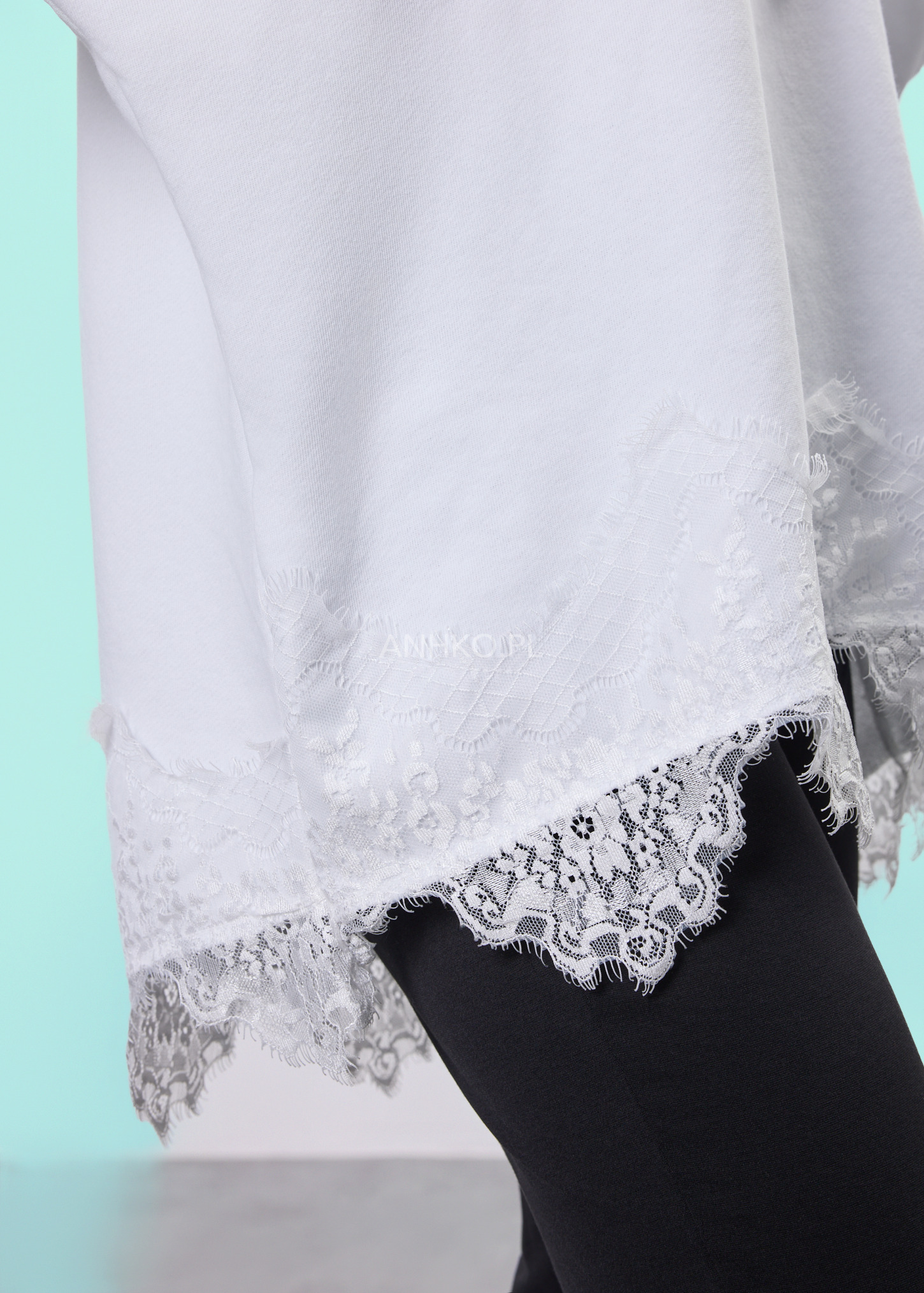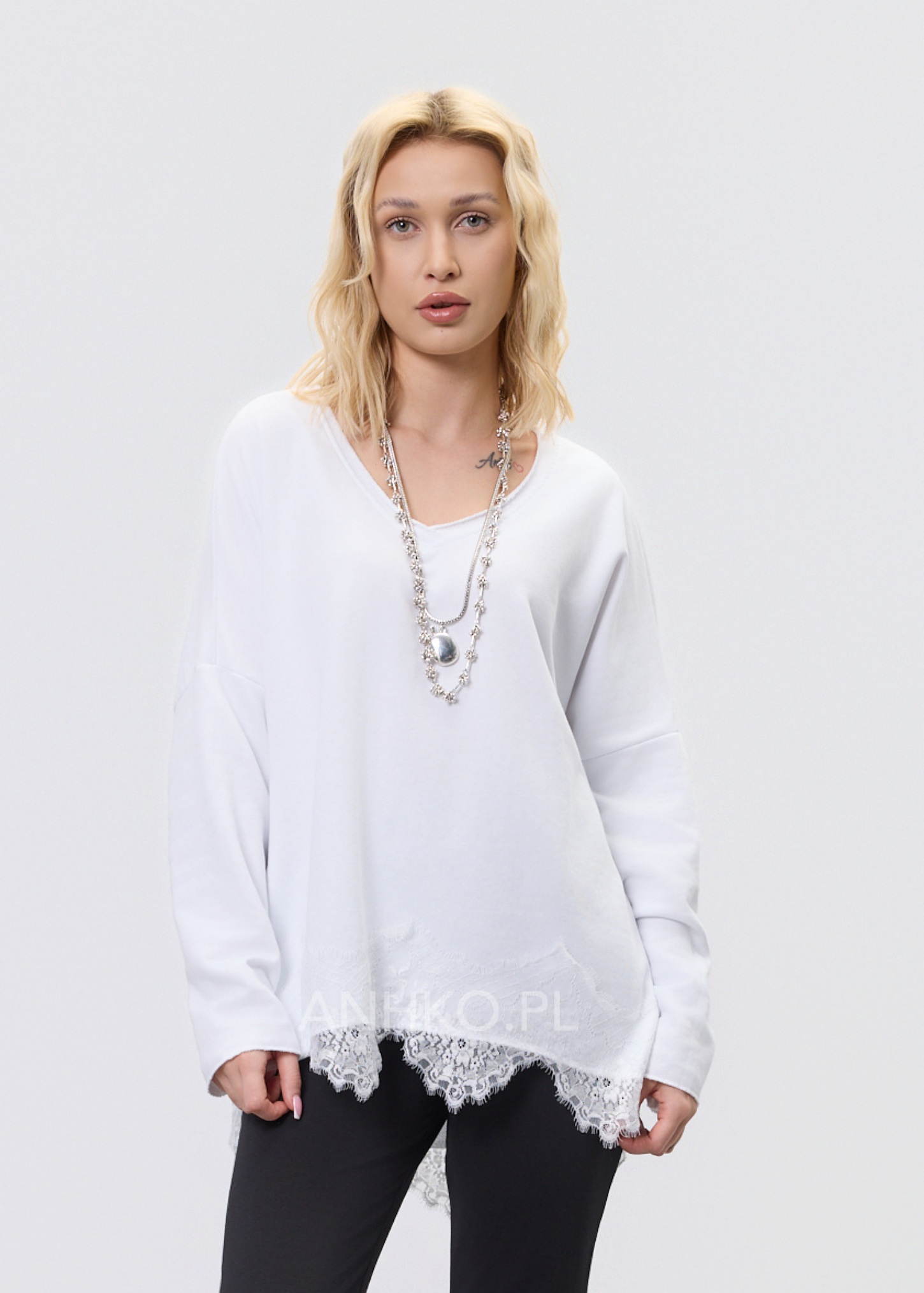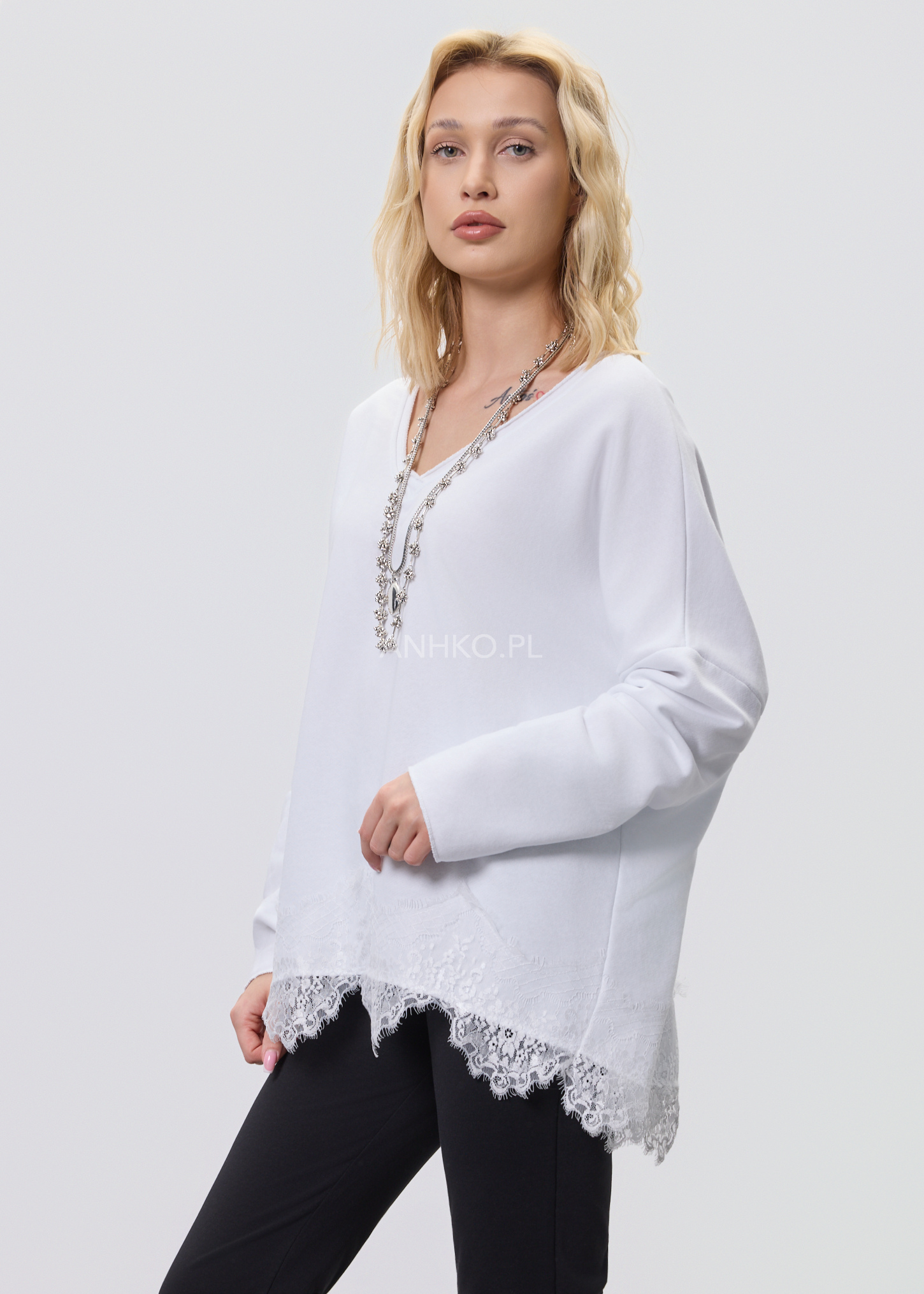 Uniwersalna bluza o luźnym, komfortowym kroju, która łączy prostotę z romantycznym detalem. Model posiada dekolt w kształcie litery V oraz długie rękawy o swobodnej linii, zapewniające wygodę noszenia przez cały dzień. Dolna krawędź bluzy wykończona jest dekoracyjną koronką, która dodaje całości subtelnej elegancji i lekkości. Brak kieszeni i podszewki podkreśla minimalistyczny charakter fasonu, a miękka dzianina dobrze układa się na sylwetce. Bluza świetnie komponuje się zarówno z jeansami i spodniami materiałowymi, jak i ze spódnicą. Idealna na codzienne stylizacje, do pracy w trybie casual, na spotkania, spacery czy spokojne wyjścia wieczorne.
