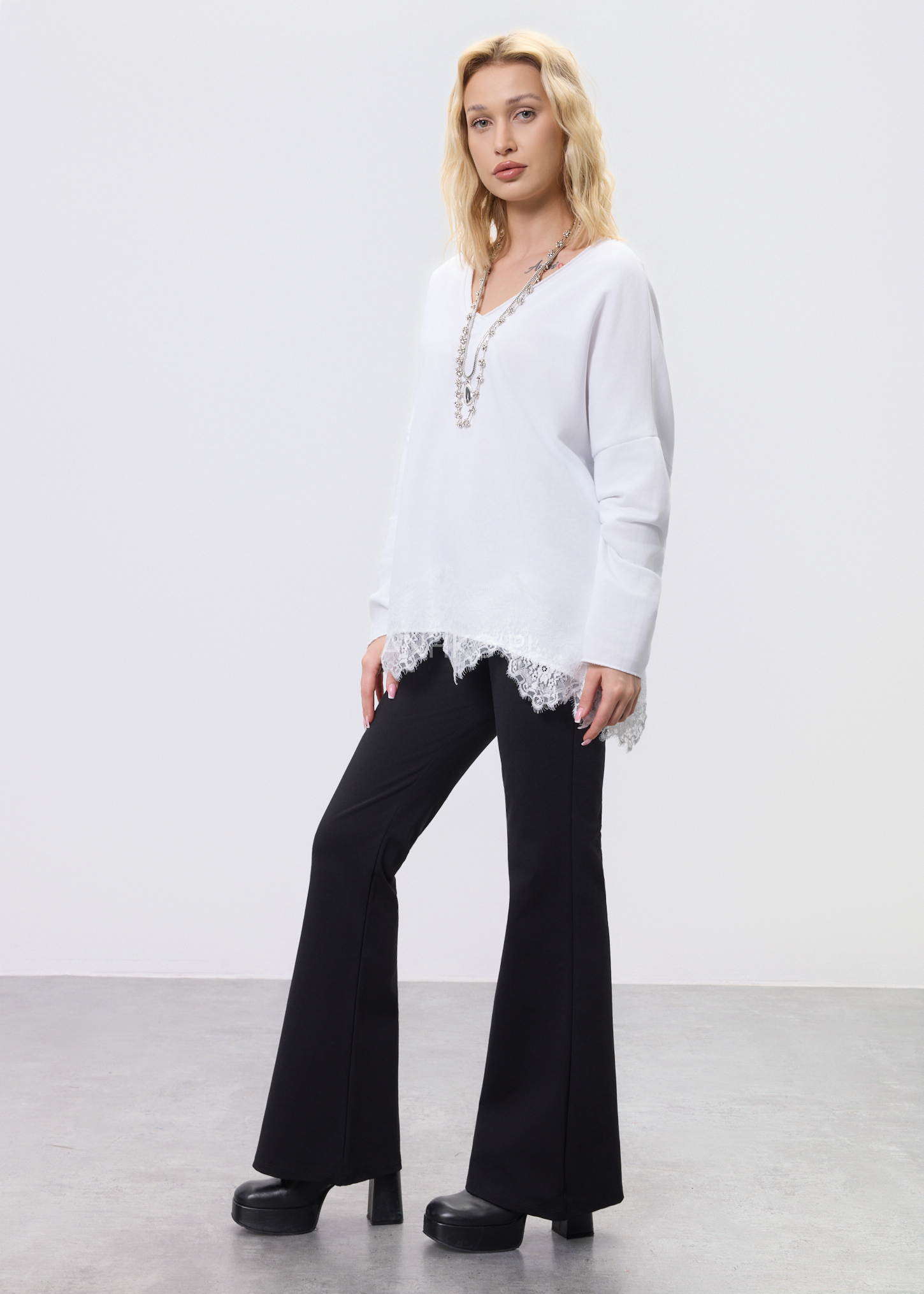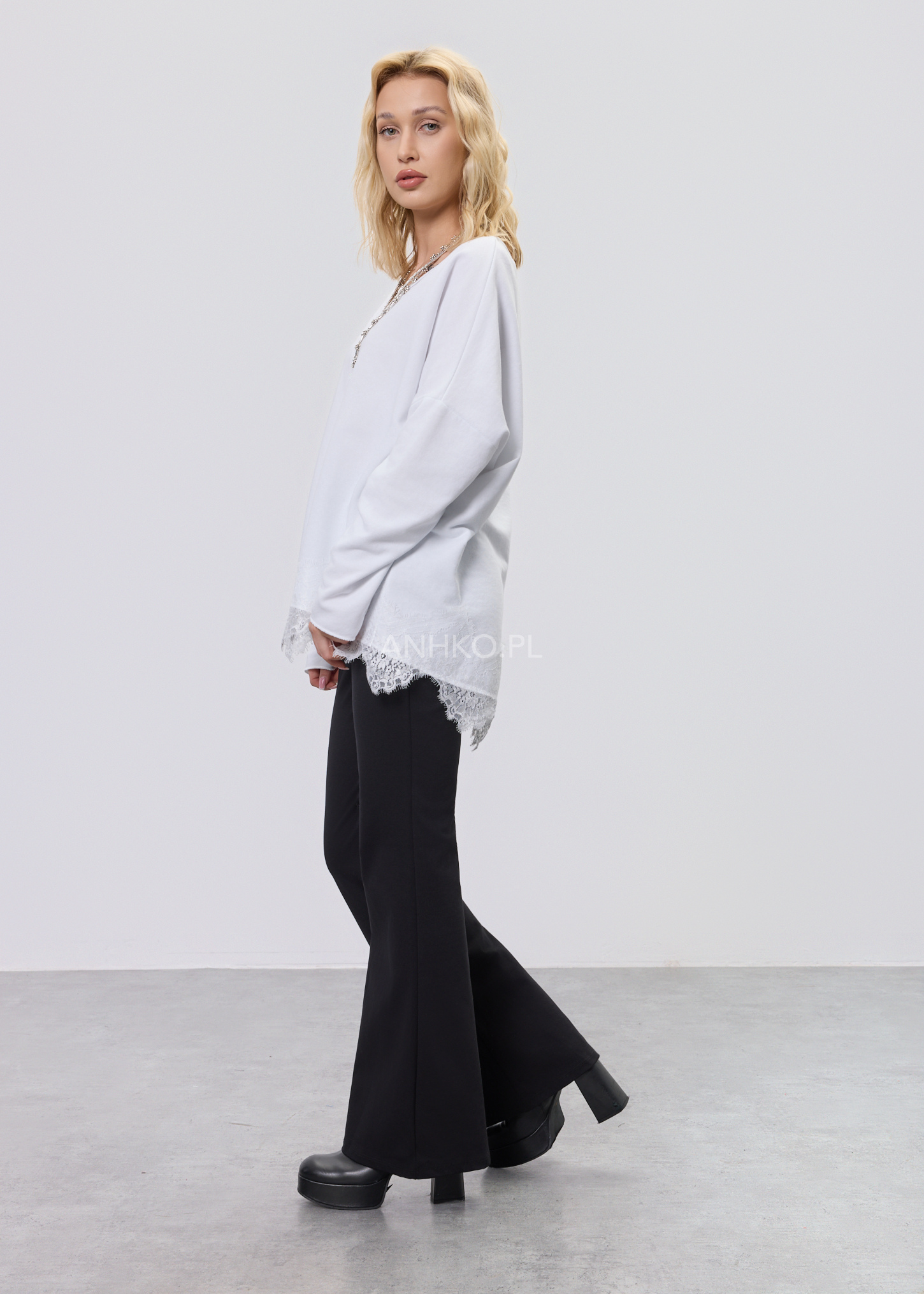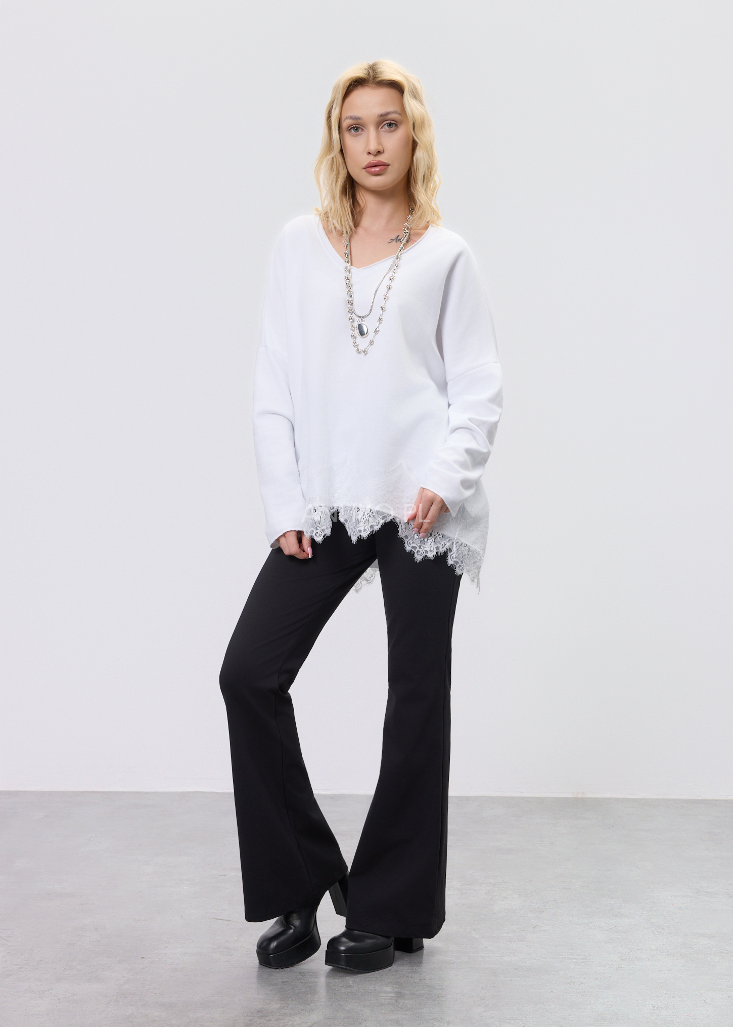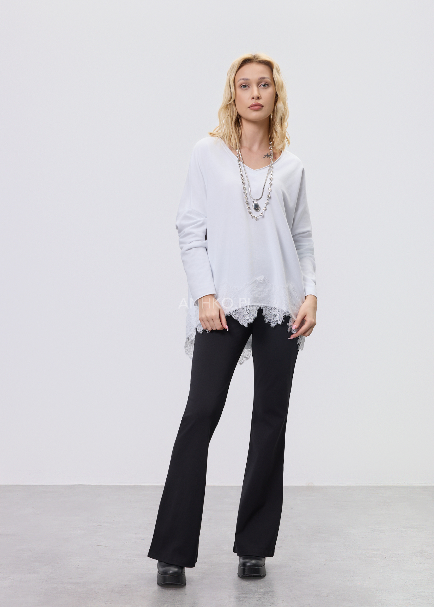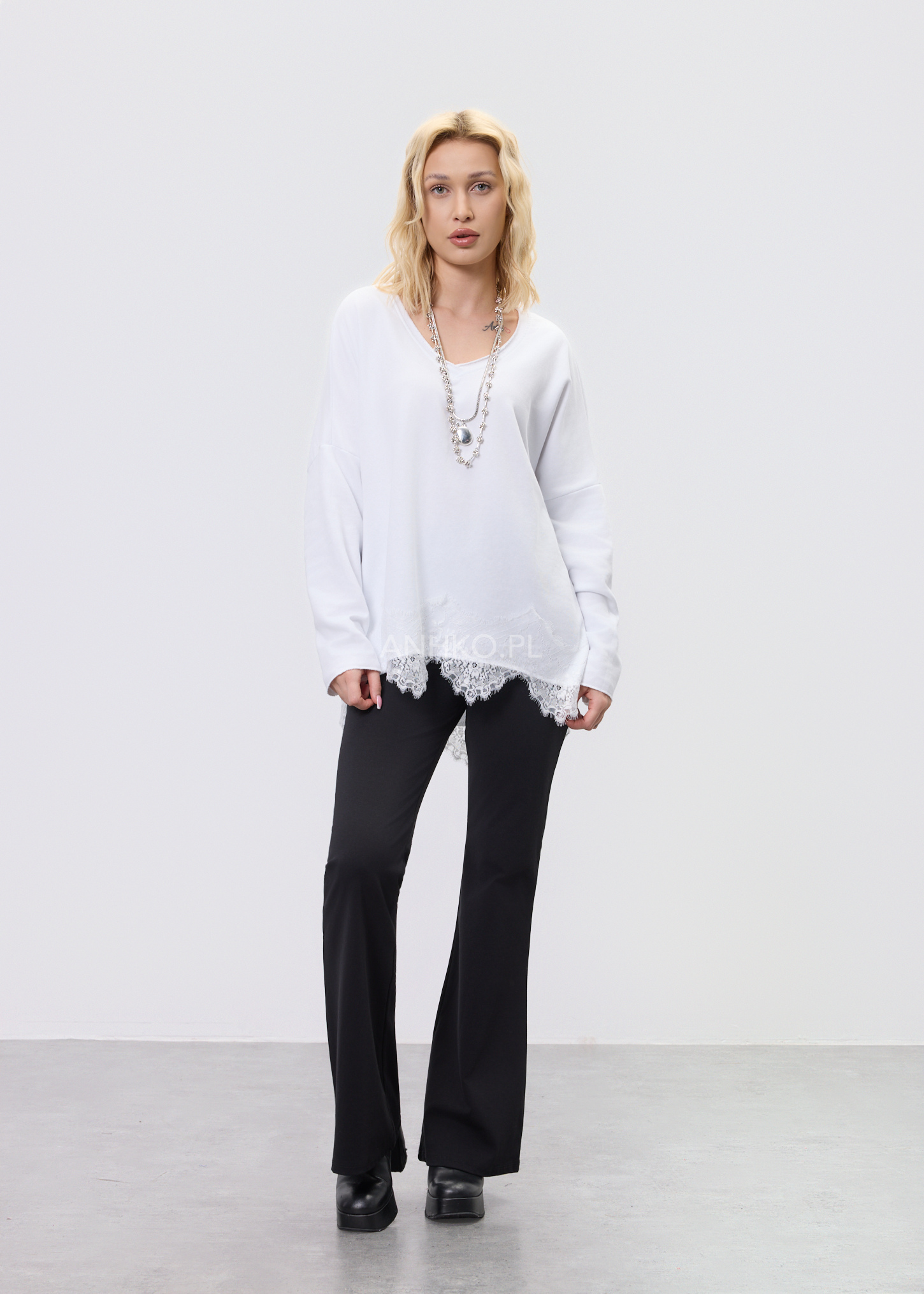 Uniwersalna bluza o luźnym, komfortowym kroju, która łączy prostotę z romantycznym detalem. Model posiada dekolt w kształcie litery V oraz długie rękawy o swobodnej linii, zapewniające wygodę noszenia przez cały dzień. Dolna krawędź bluzy wykończona jest dekoracyjną koronką, która dodaje całości subtelnej elegancji i lekkości. Brak kieszeni i podszewki podkreśla minimalistyczny charakter fasonu, a miękka dzianina dobrze układa się na sylwetce. Bluza świetnie komponuje się zarówno z jeansami i spodniami materiałowymi, jak i ze spódnicą. Idealna na codzienne stylizacje, do pracy w trybie casual, na spotkania, spacery czy spokojne wyjścia wieczorne.