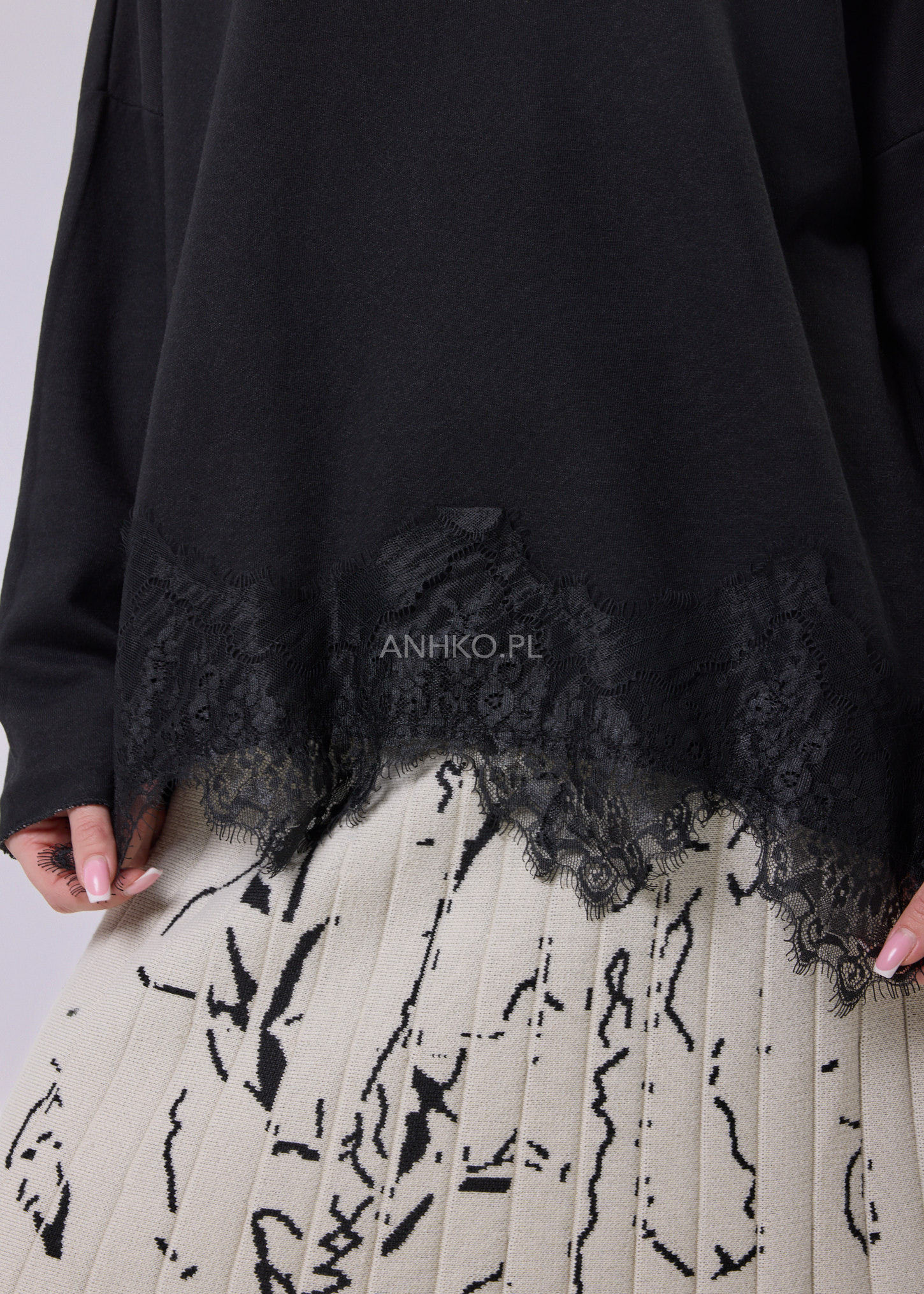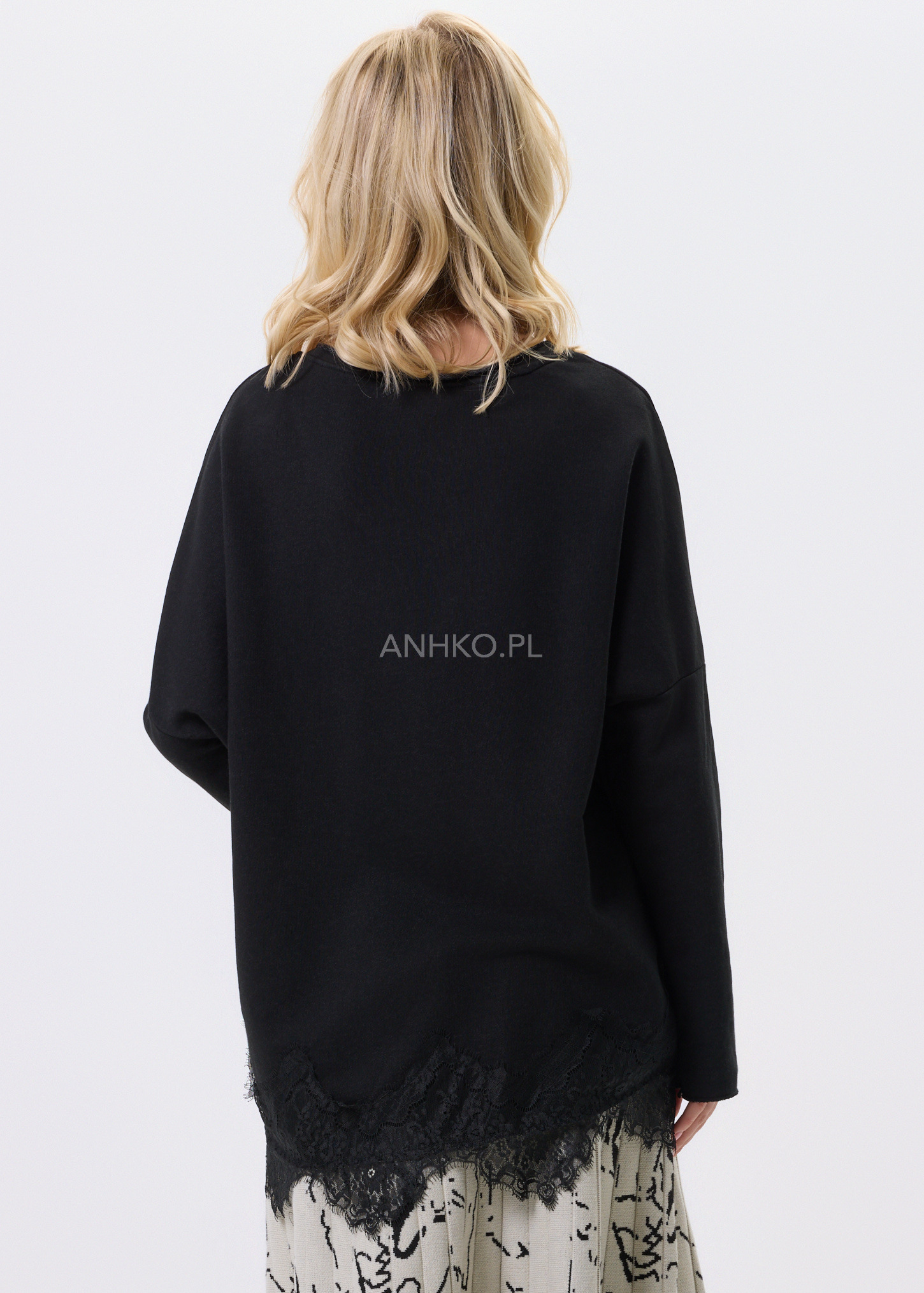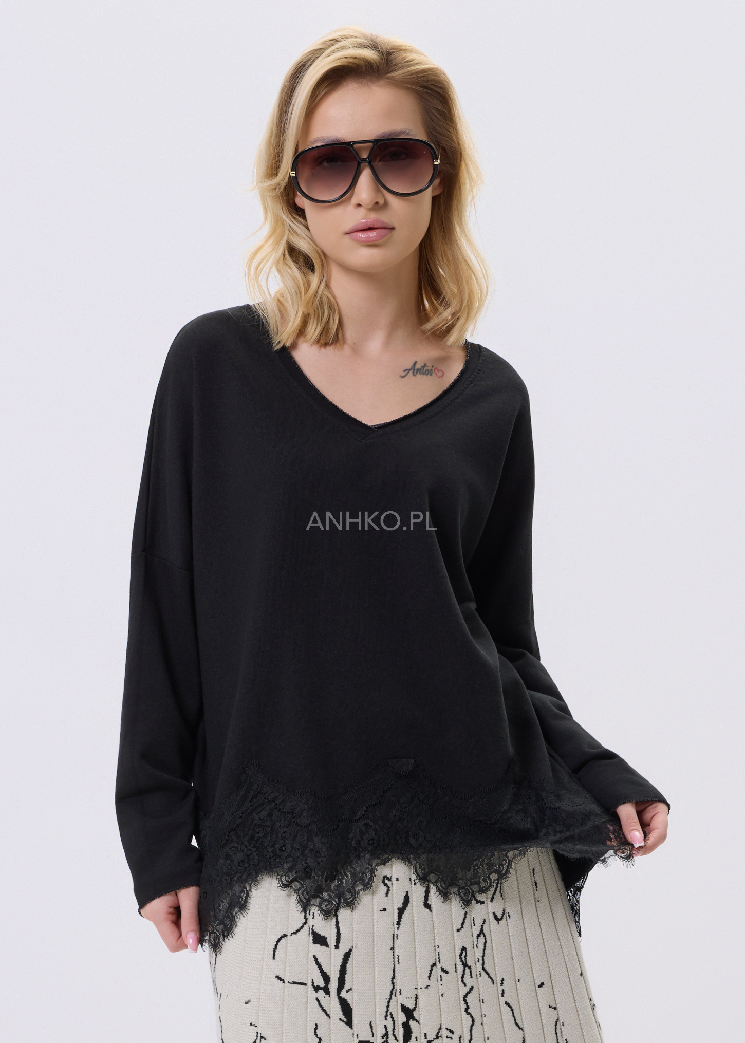 Uniwersalna bluza o luźnym, komfortowym kroju, która łączy prostotę z romantycznym detalem. Model posiada dekolt w kształcie litery V oraz długie rękawy o swobodnej linii, zapewniające wygodę noszenia przez cały dzień. Dolna krawędź bluzy wykończona jest dekoracyjną koronką, która dodaje całości subtelnej elegancji i lekkości. Brak kieszeni i podszewki podkreśla minimalistyczny charakter fasonu, a miękka dzianina dobrze układa się na sylwetce. Bluza świetnie komponuje się zarówno z jeansami i spodniami materiałowymi, jak i ze spódnicą. Idealna na codzienne stylizacje, do pracy w trybie casual, na spotkania, spacery czy spokojne wyjścia wieczorne.