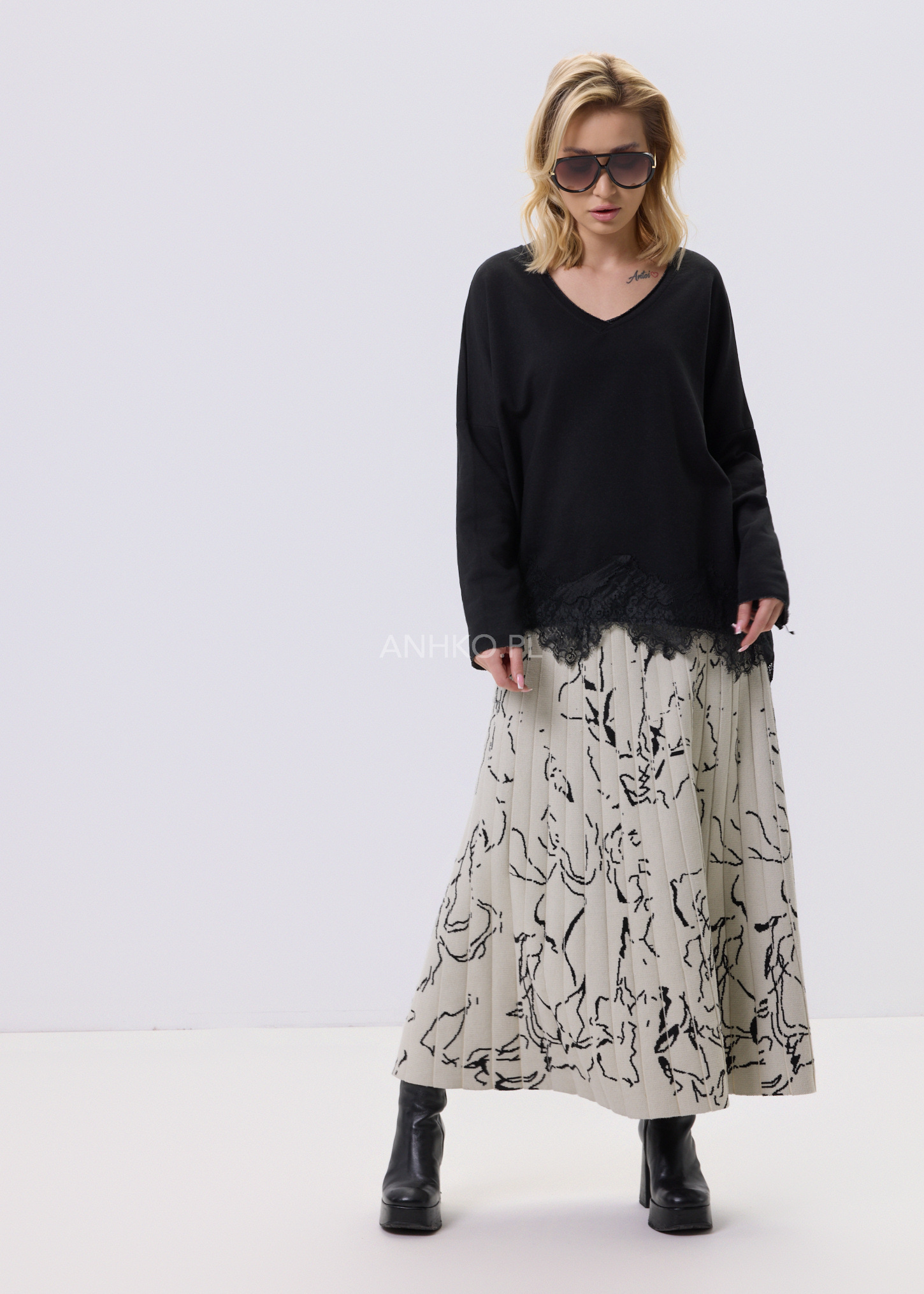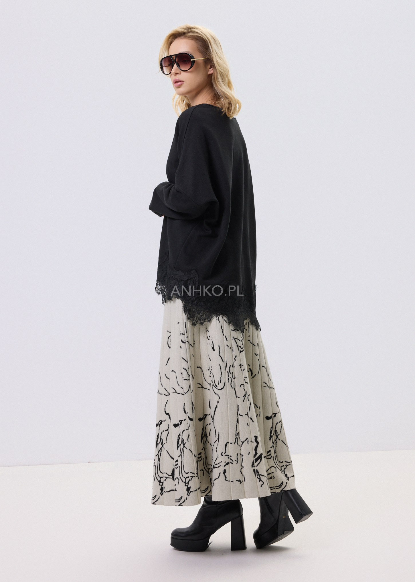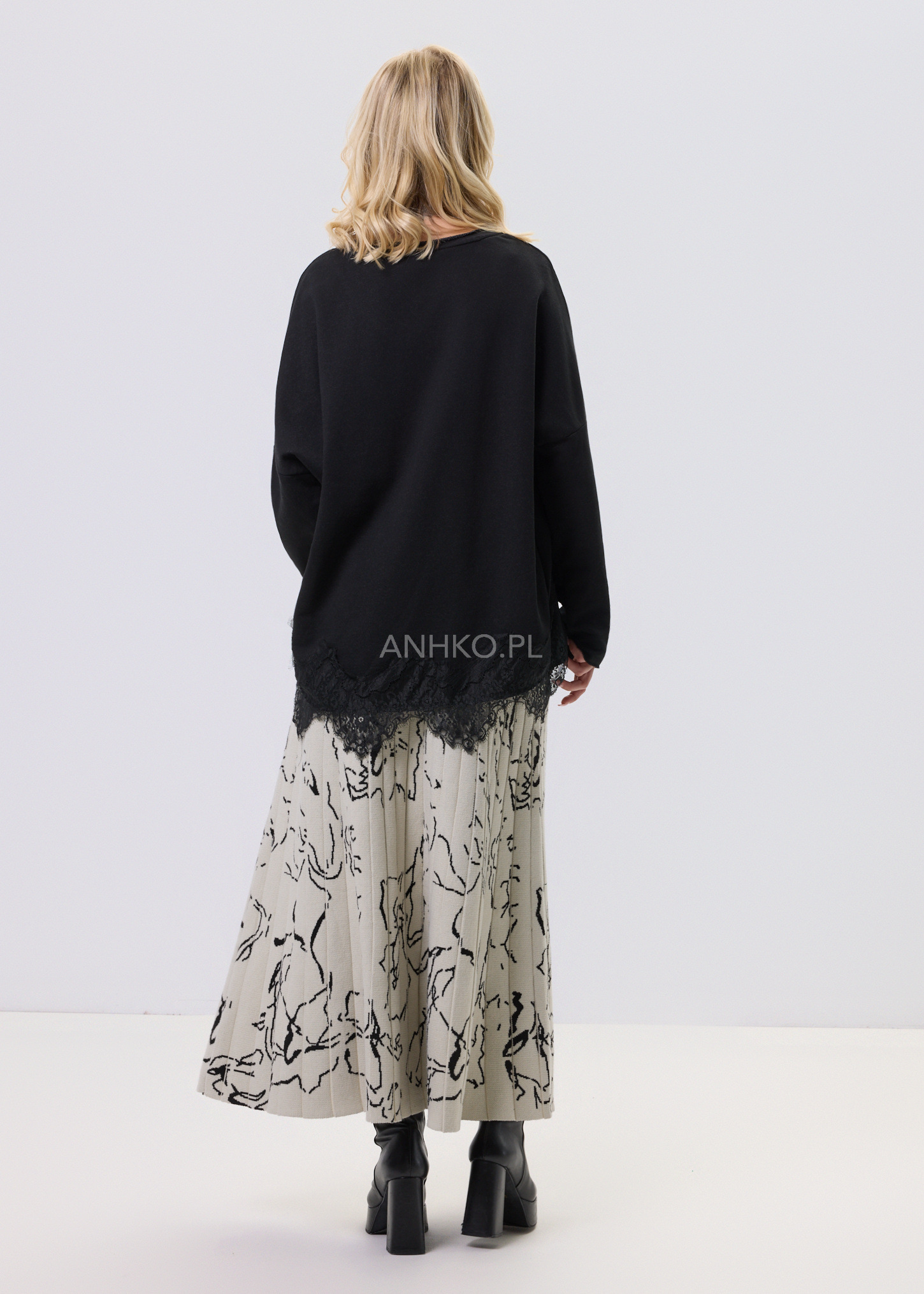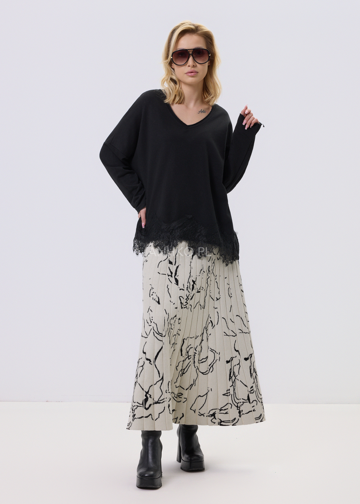 Uniwersalna bluza o luźnym, komfortowym kroju, która łączy prostotę z romantycznym detalem. Model posiada dekolt w kształcie litery V oraz długie rękawy o swobodnej linii, zapewniające wygodę noszenia przez cały dzień. Dolna krawędź bluzy wykończona jest dekoracyjną koronką, która dodaje całości subtelnej elegancji i lekkości. Brak kieszeni i podszewki podkreśla minimalistyczny charakter fasonu, a miękka dzianina dobrze układa się na sylwetce. Bluza świetnie komponuje się zarówno z jeansami i spodniami materiałowymi, jak i ze spódnicą. Idealna na codzienne stylizacje, do pracy w trybie casual, na spotkania, spacery czy spokojne wyjścia wieczorne.