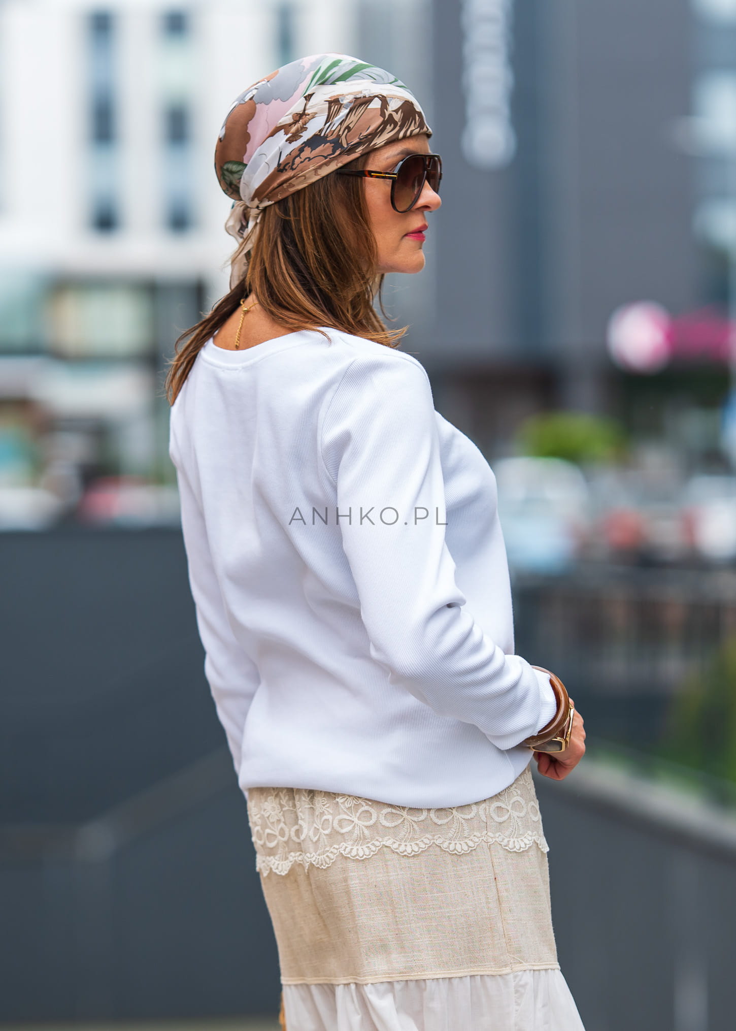 Ta bluzka z długim rękawem w odcieniu czystej bieli subtelnie dopasowuje się do sylwetki i tworzy harmonijną bazę stylizacji. Delikatne prążkowanie wysmukla optycznie górną część ciała, a dekolt z guzikami nadaje jej lekko swobodnego, ale wciąż eleganckiego charakteru. Model pięknie układa się zarówno wpuszczony w spódnicę, jak i noszony luźno.