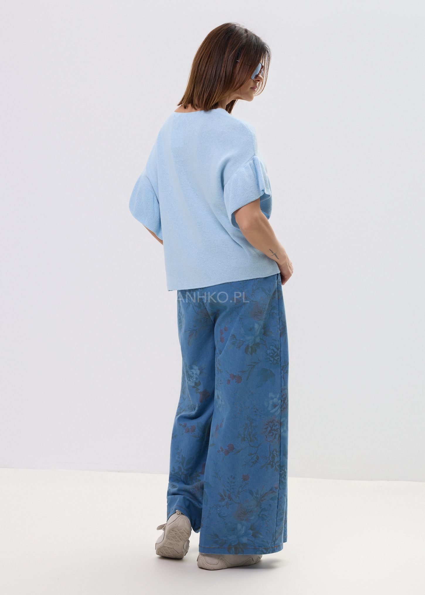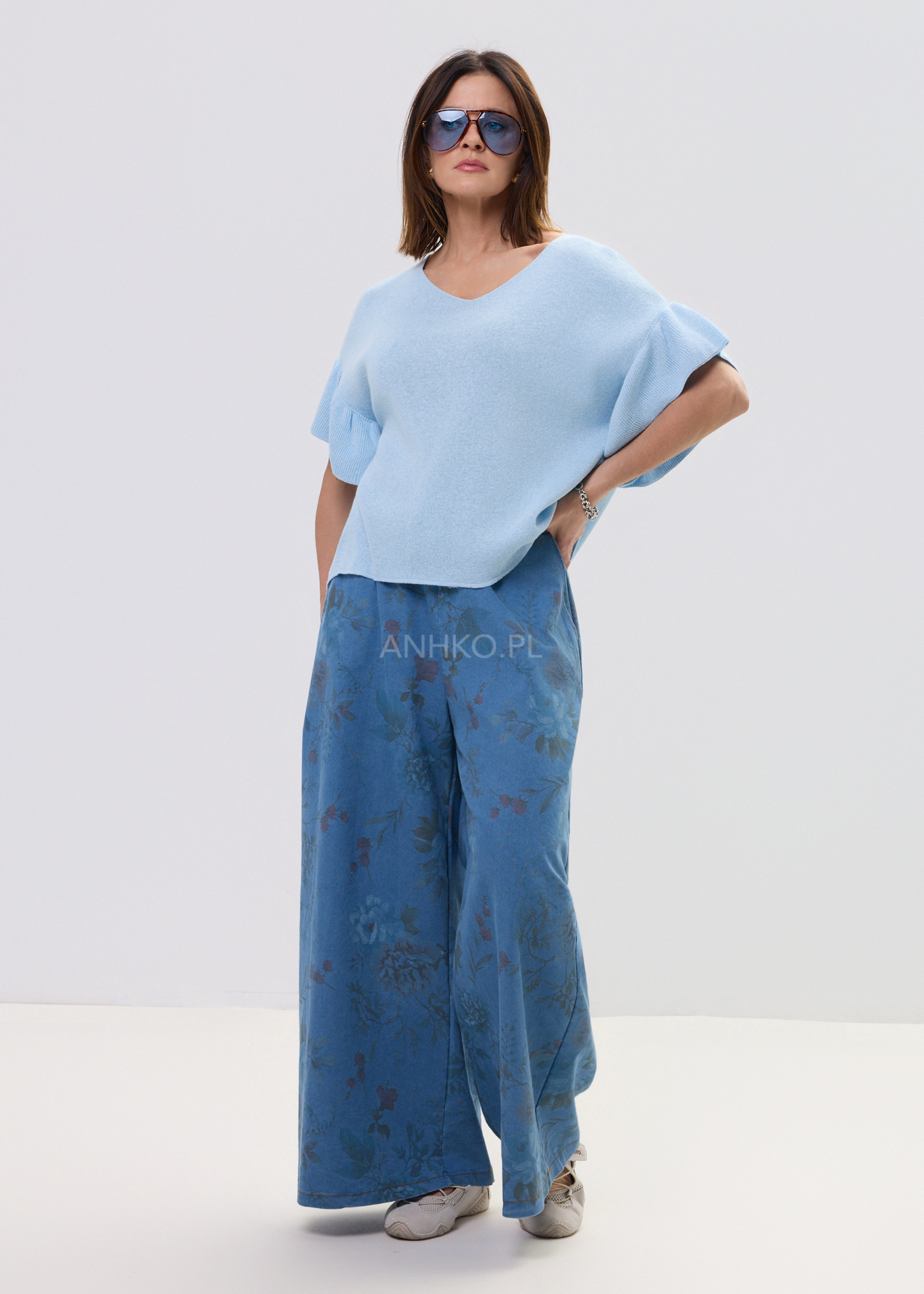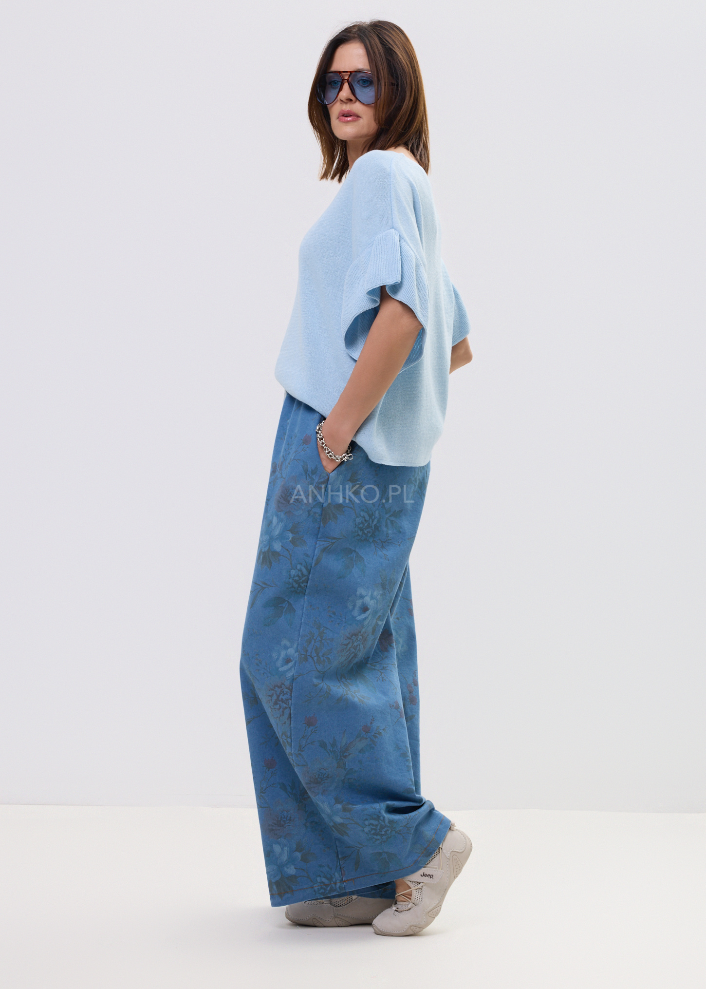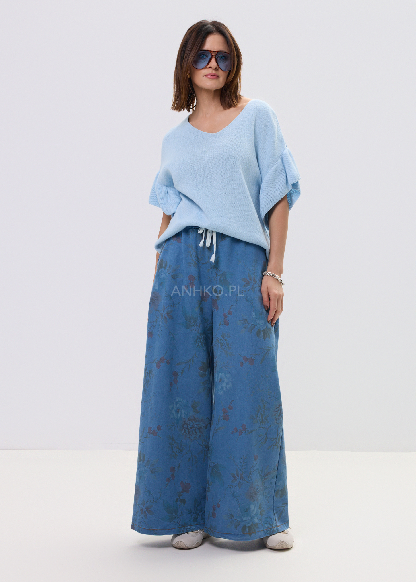 Spodnie Bordelin Niebieskie - Luźne spodnie w stylu denim z subtelnym, kwiatowym printem. Wygodna gumka w pasie i troczek sprawiają, że dopasowują się idealnie. Stylowe, lekkie i totalnie na luzie – idealne na co dzień.