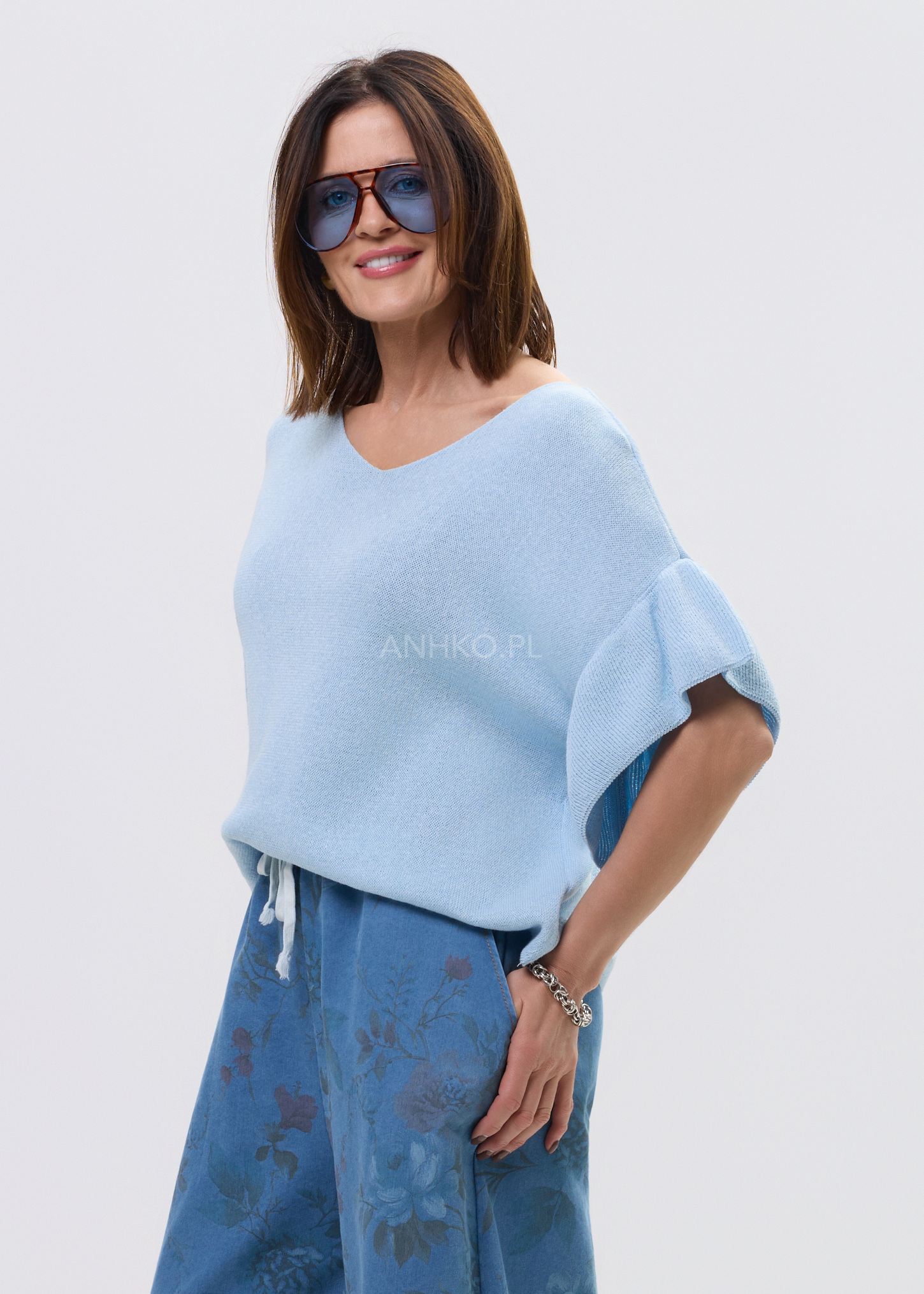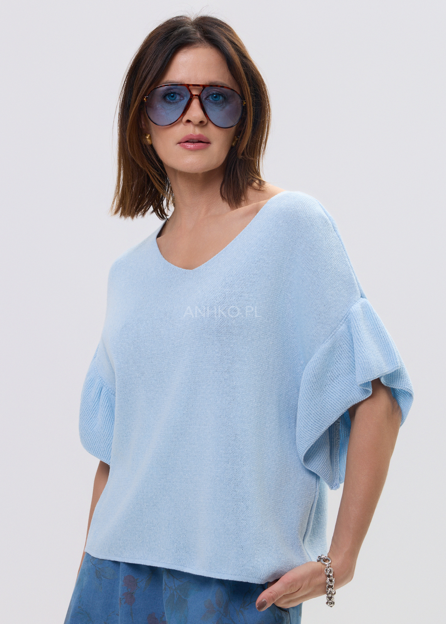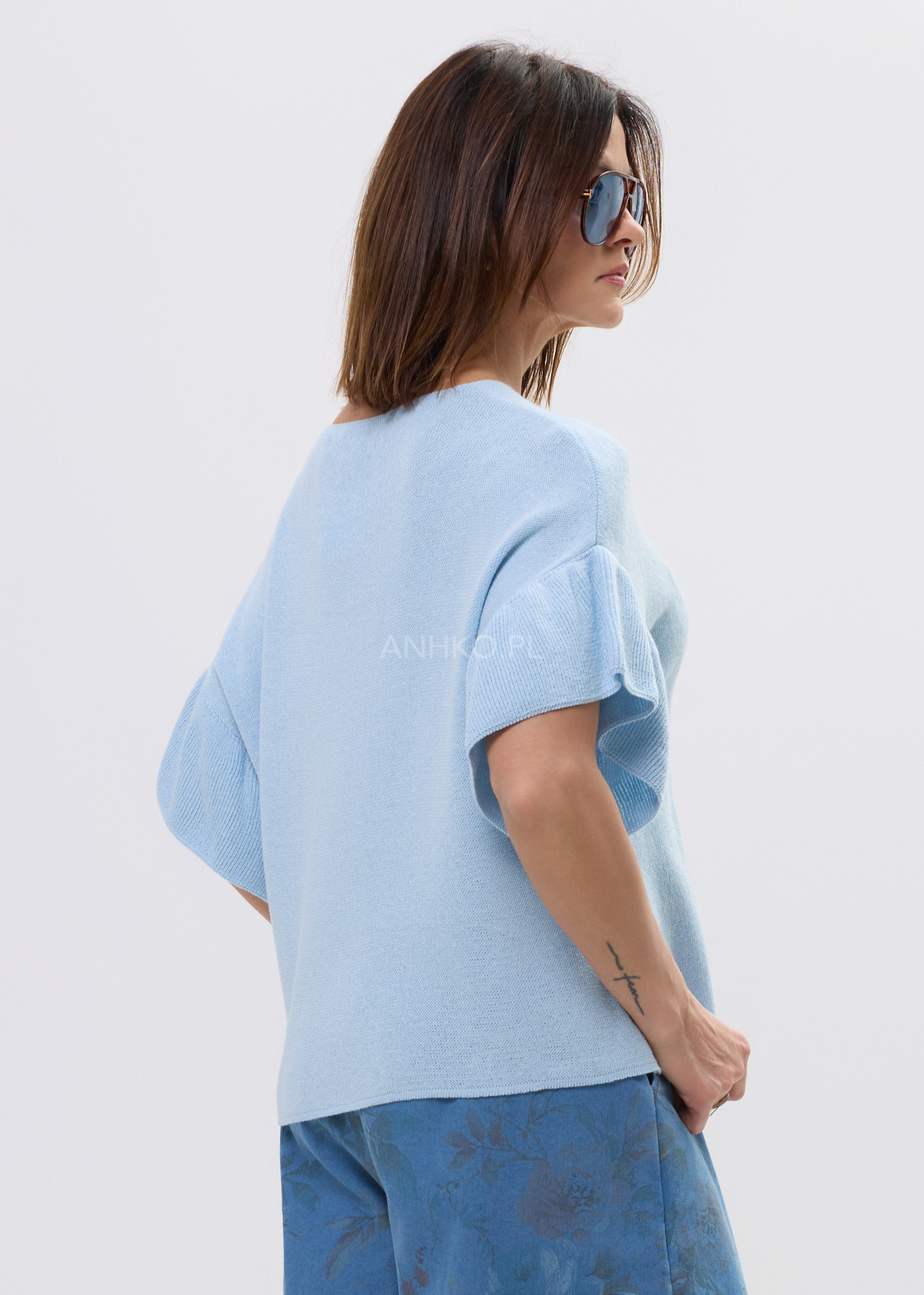 Motylkowe rękawy z falbaną wprowadzają subtelny ruch i kobiecy detal, który przyciąga uwagę bez przesady. Przewiewna dzianina sprawia, że model świetnie sprawdza się zarówno solo, jak i jako baza pod warstwowe stylizacje – od casualowych zestawów po bardziej dopracowane looki.