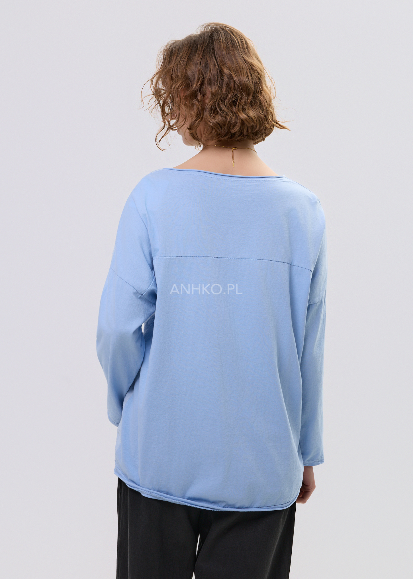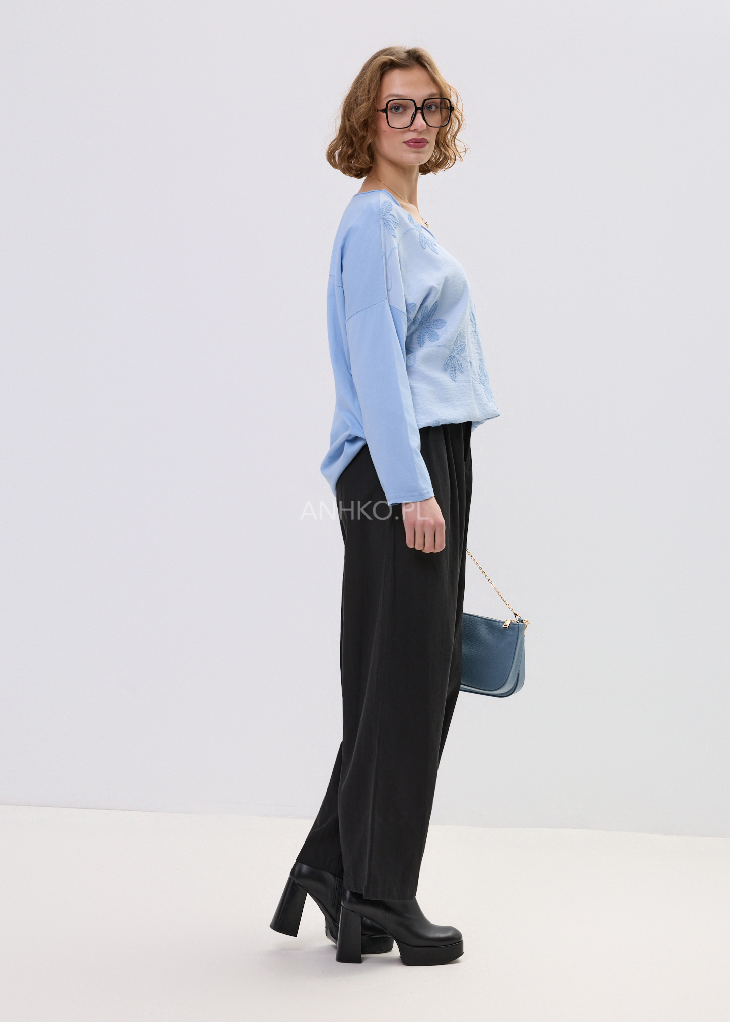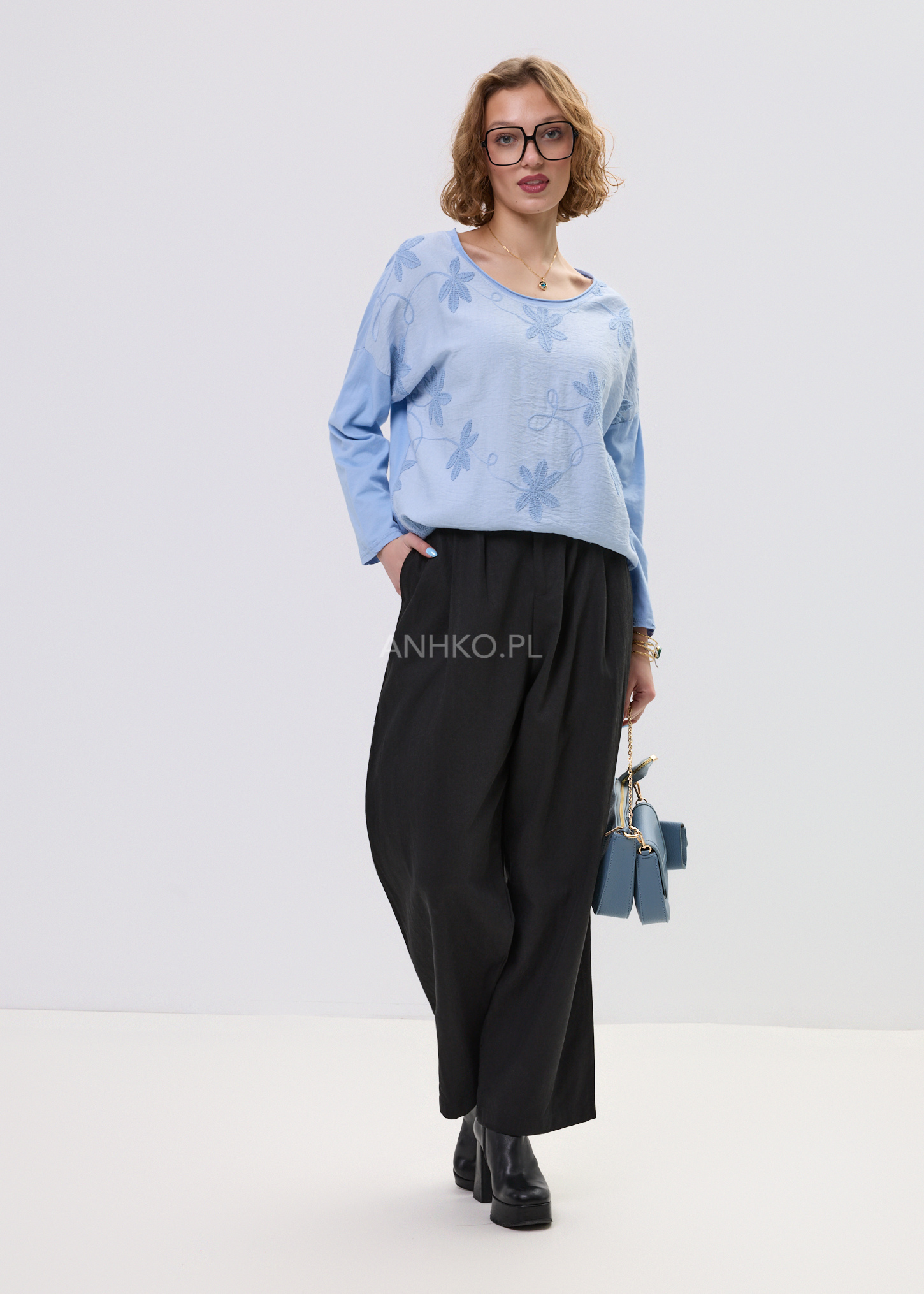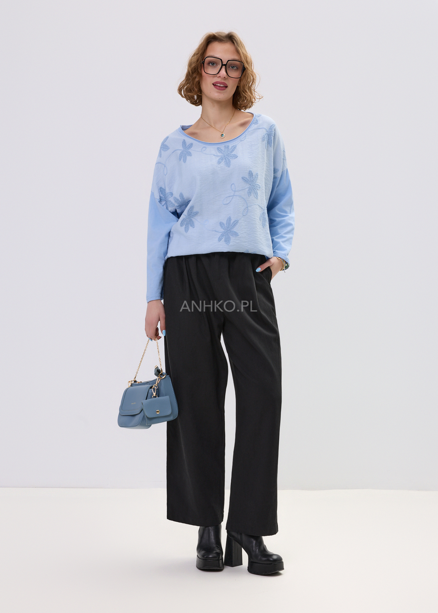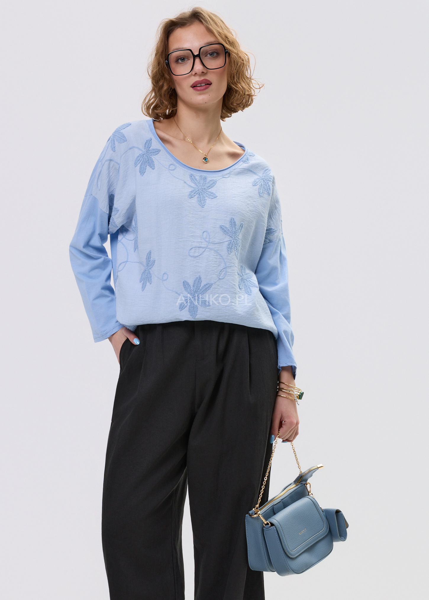 Ta bluzka damska w odcieniu delikatnego baby blue wyróżnia się dekoracyjnym haftem inspirowanym motywem kwiatów. Luźny fason sprawia, że model swobodnie układa się na sylwetce, zapewniając wygodę oraz naturalny, lekki efekt w stylizacji. Subtelne zdobienia rozmieszczone na całej powierzchni materiału dodają jej romantycznego charakteru, a jednocześnie zachowują minimalistyczną elegancję.