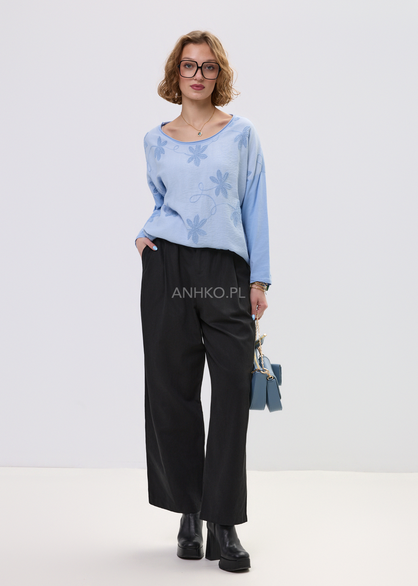 Model posiada komfortowy, luźny krój, który pozwala na pełną swobodę ruchów. Okrągły dekolt nadaje całości klasycznego charakteru, a haftowane kwiaty tworzą dekoracyjny, ale nienachalny akcent. Bluzka świetnie sprawdzi się zarówno w codziennych zestawach z jeansami, jak i w bardziej dopracowanych stylizacjach z eleganckimi spodniami lub spódnicą.